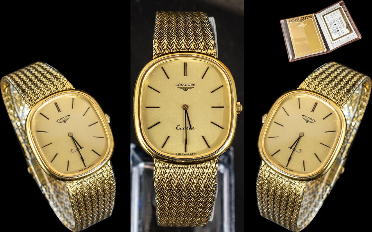 Longines - Gents 1980's Slim line Gold Tone Quartz Wrist Watch, With Integral Bracelet, Signed to Dial and Buckle of Watch Strap. Features Champagne Dial, Case No 20995374. As New Condition / Little Worn. With Receipt of Purchase Date 22-12-1986. And Longines Wallet and Booklet.