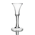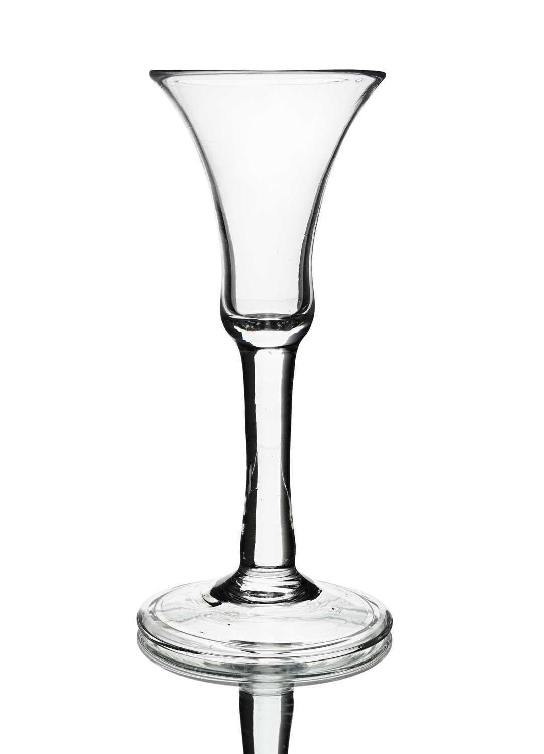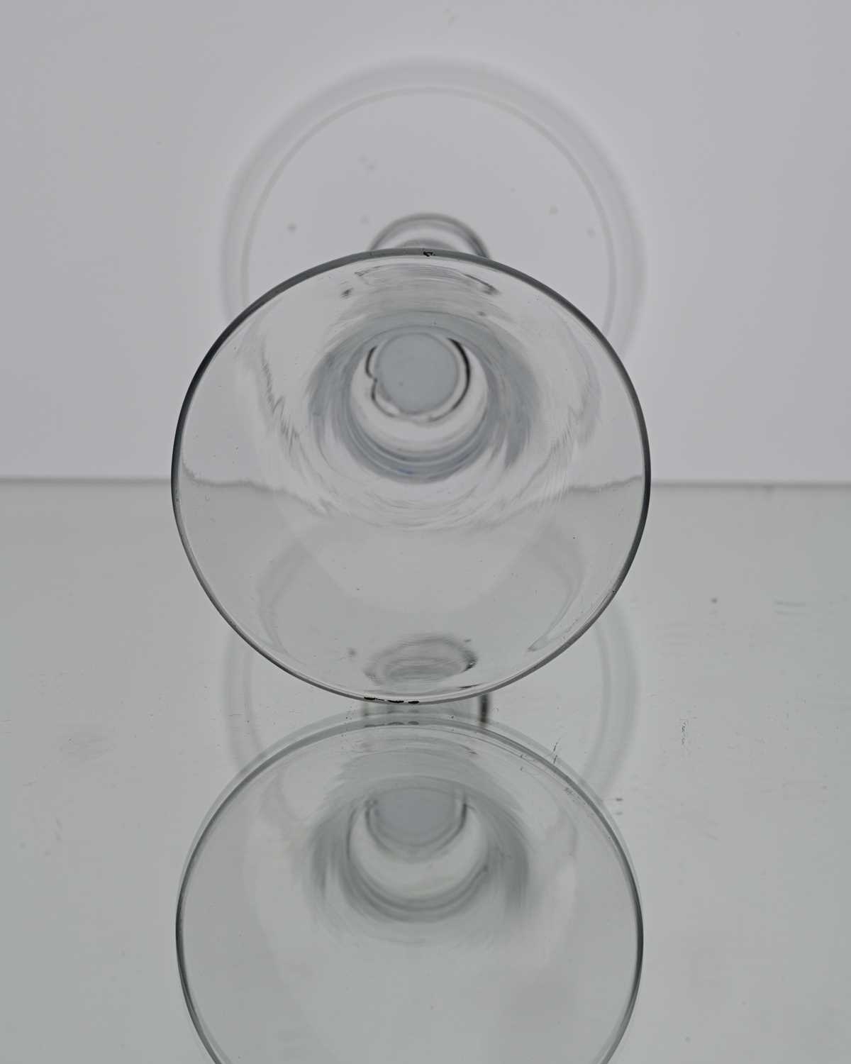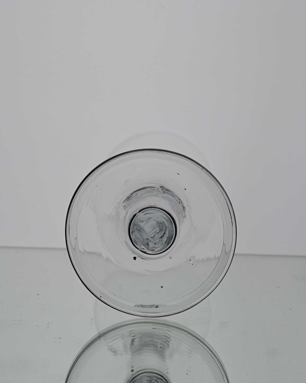 A plain stemmed wine glass, circa 1750, the bell shaped bowl on a plain cylindrical stem and folded foot, 15.8cm high, rim 6.5cm diameter, foot 7.2cm diameter