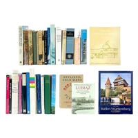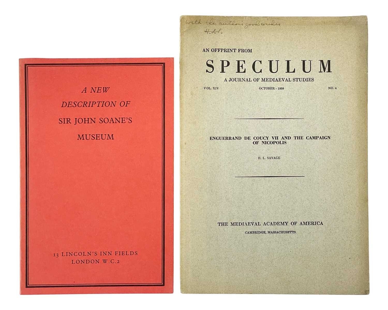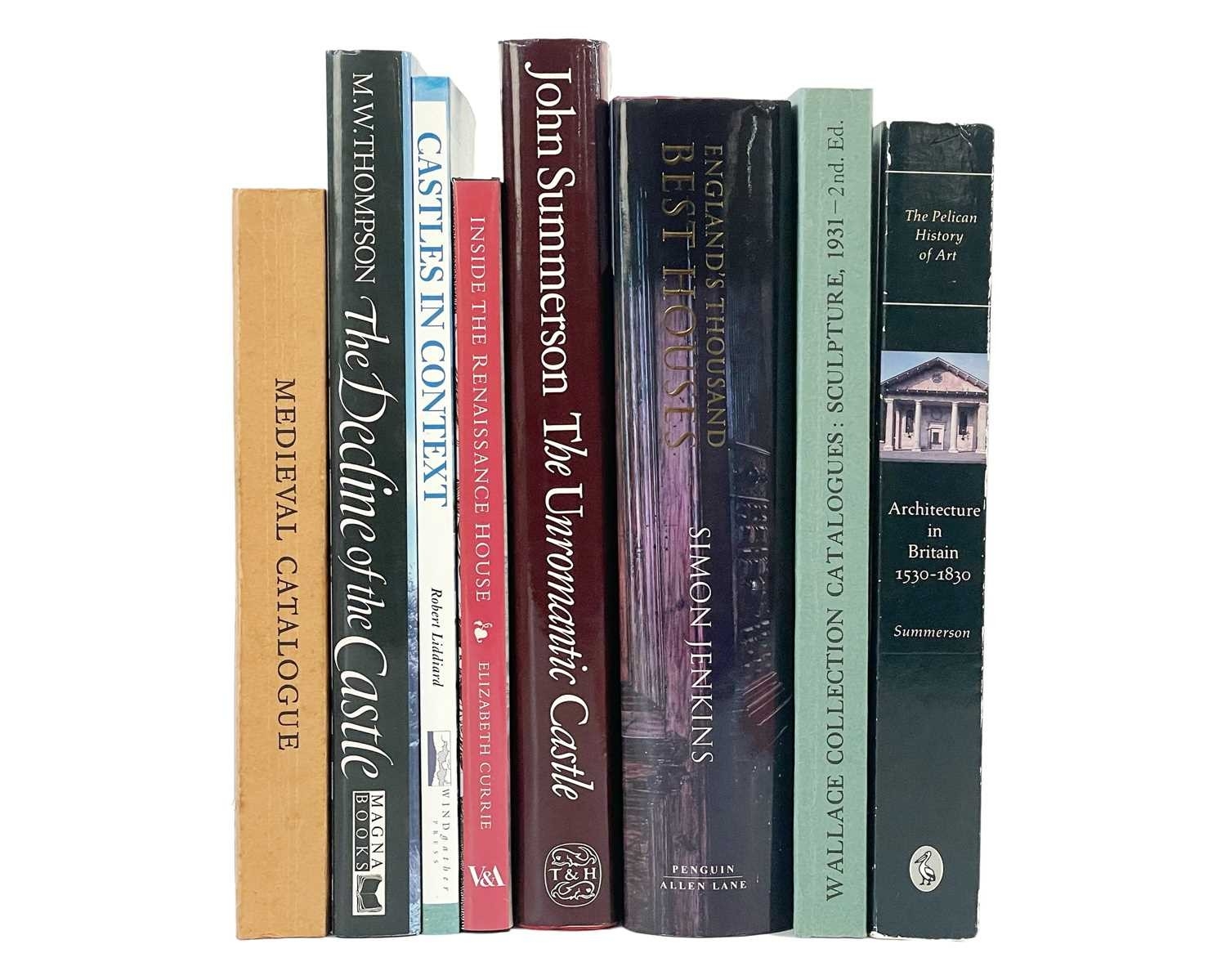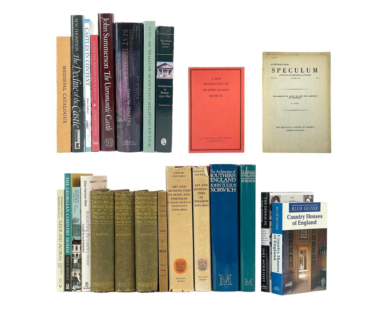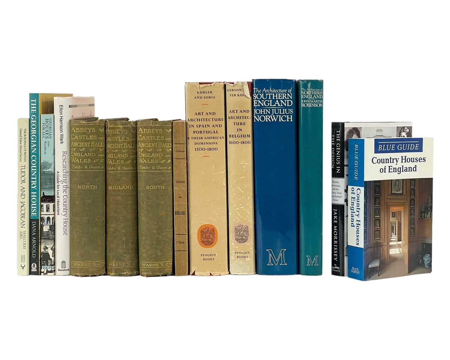 (Architecture) Twenty-four works Includes three volumes of John Timbs and Alexander Gunn, 'Abbeys, Castles and Ancient Halls of England and Wales - South, Midlands and North', Frederick Warne and Co, London, with green cloth binding and gilt embossed decoration; two volumes of the Pelican History of Art, 'Art and Architecture in Belgium 1600-1800' and 'Art and Architecture in Spain & Portugal 1500-1800'; an offprint from Speculum Vol. XIV, No. 4, H. L. Savage, 'Enguerrand de Coucy VII and the Campaign of Nicopolis', The Medieval Academy of America, Cambridge, Massachusetts, 1939; together with illustrated works on British country homes and castles, all vg. (24)