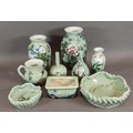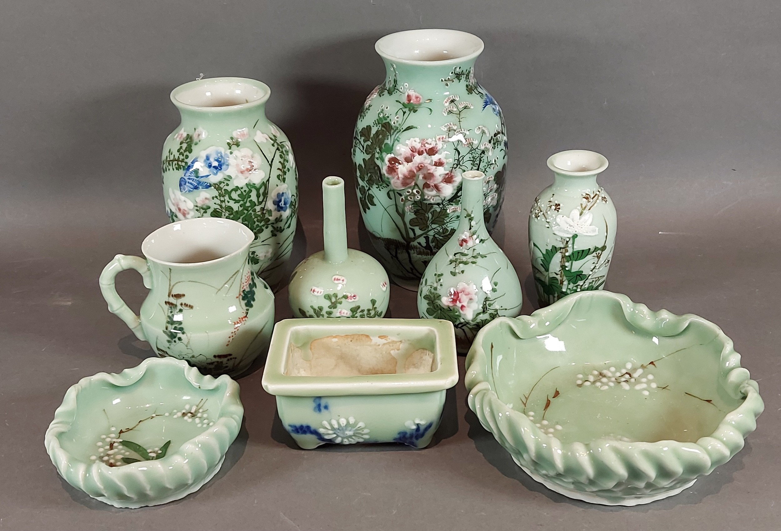 A Japanese Celadon vase, decorated with birds amounts foliage,18cms tall, together with a collection of similar Japanese ceramics