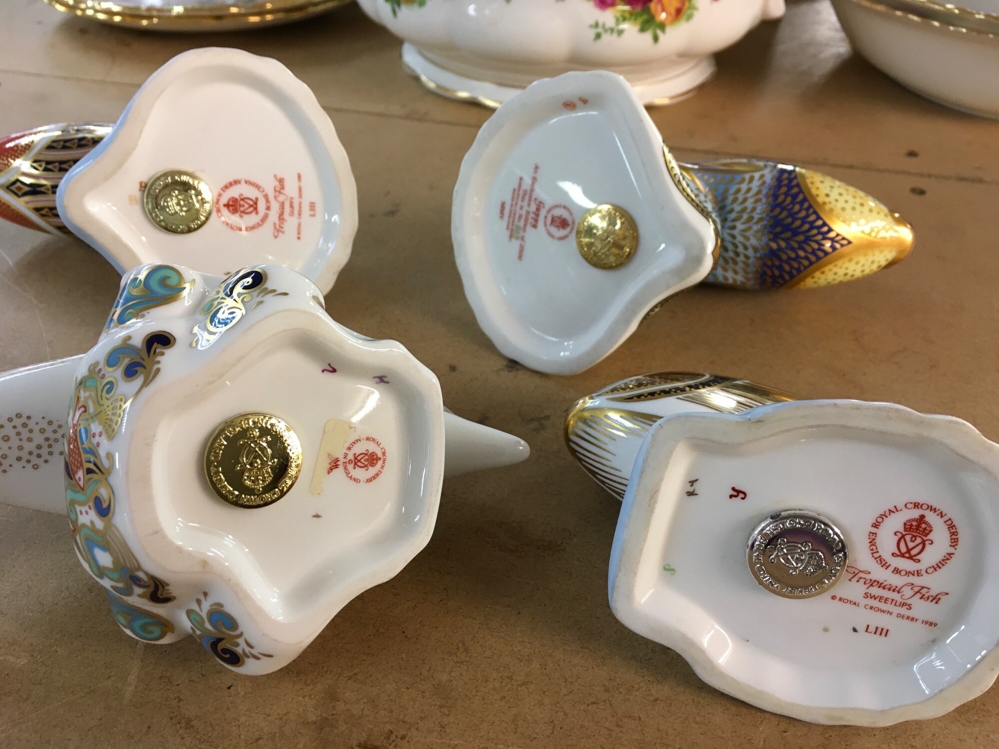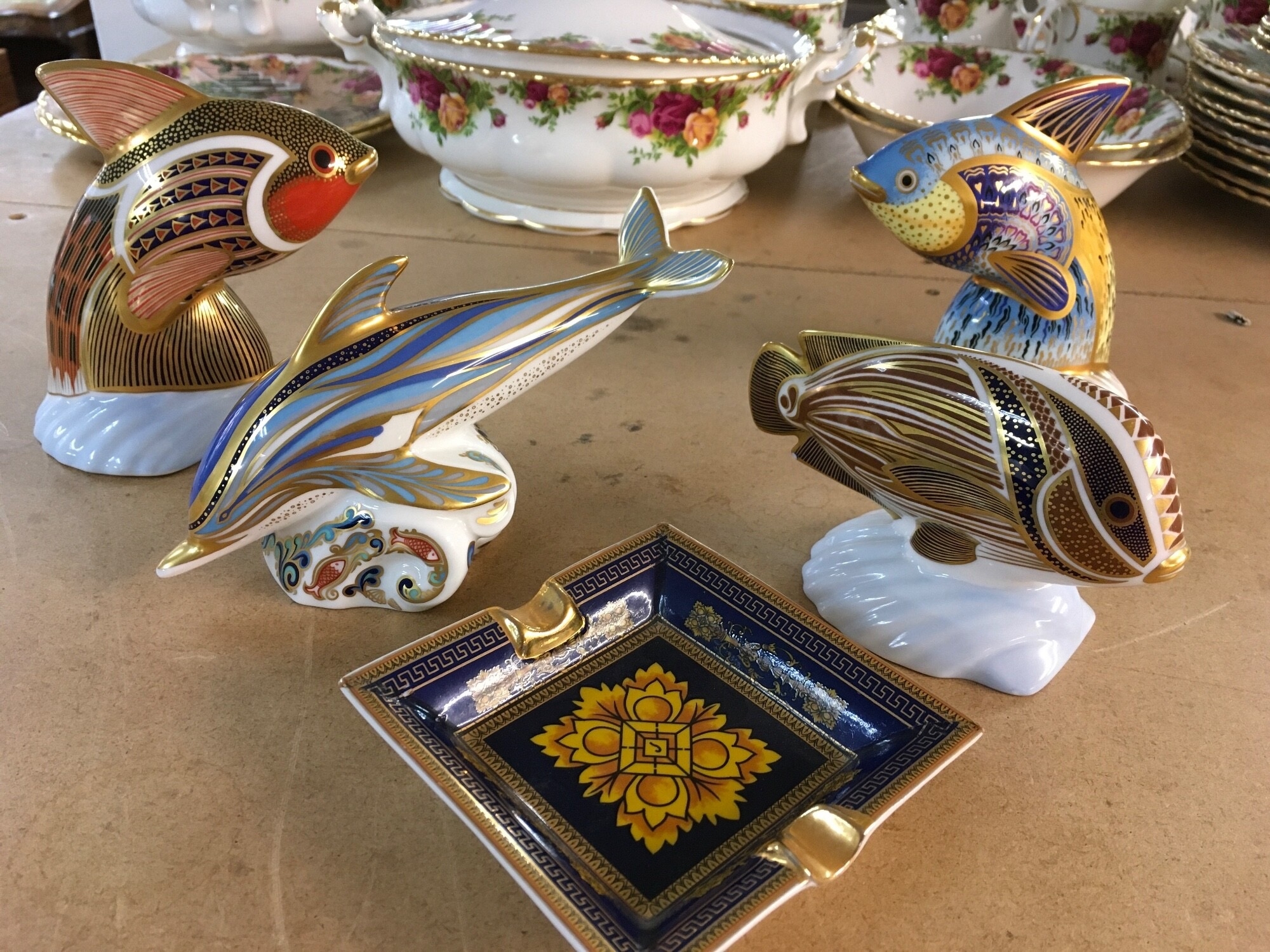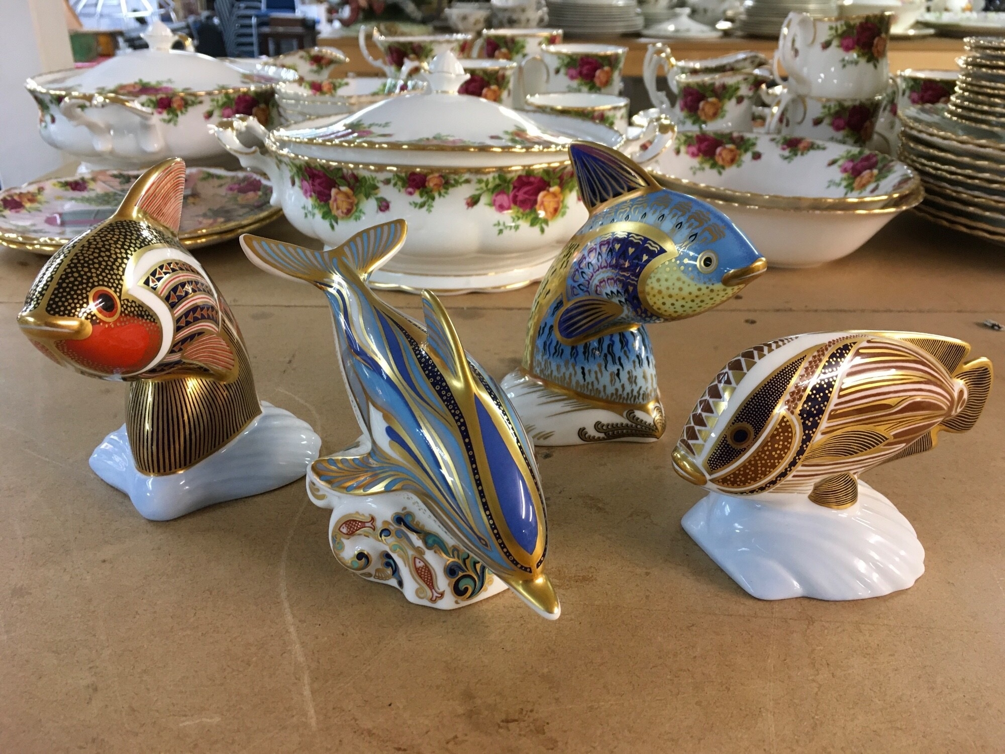 Four Royal Crown Derby paperweights in the form of marine animals including Dolphin, all with stoppers. Together with a ceramic decorative ashtray