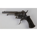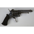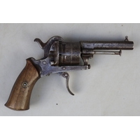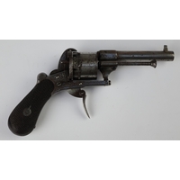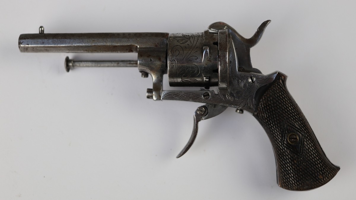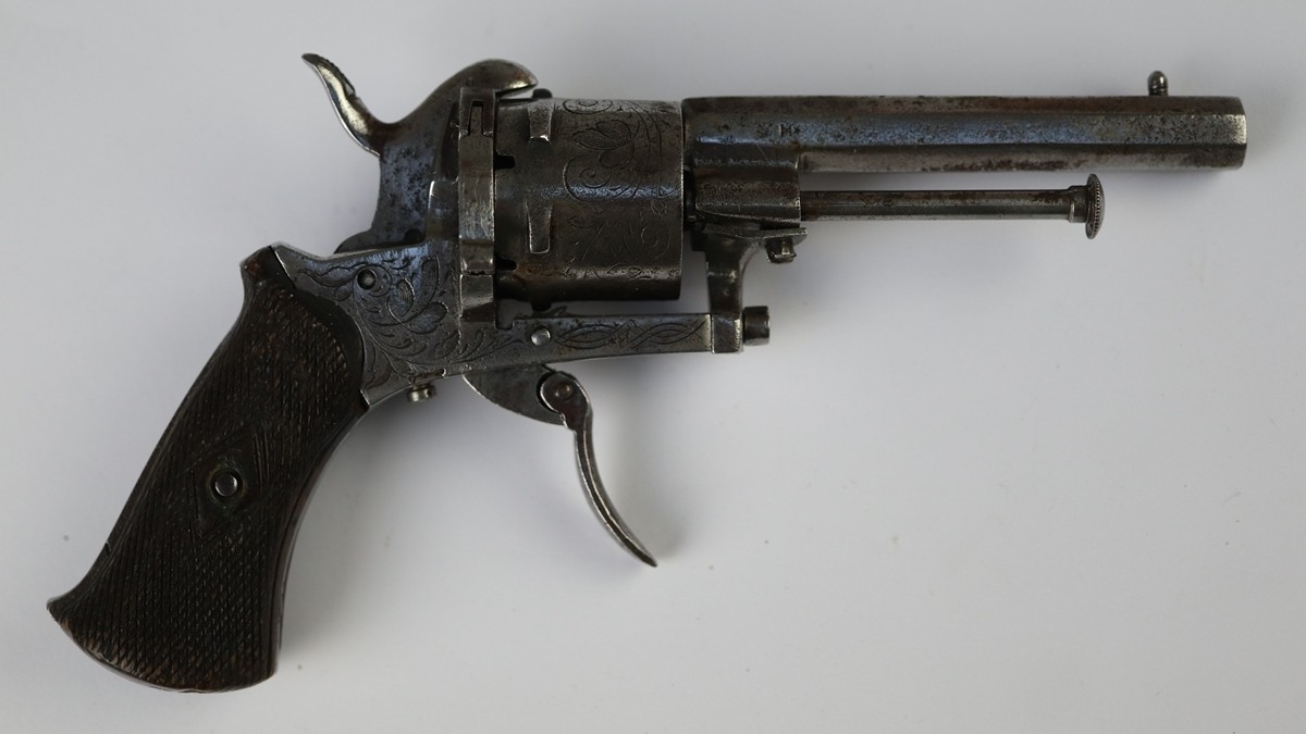 7mm Belgian proof 6-shot pinfire revolver, double action, 3½" octagonal barrel with engraving along barrel, cylinder & frame. ‘ELG’ stamp on cylinder. Folding trigger.