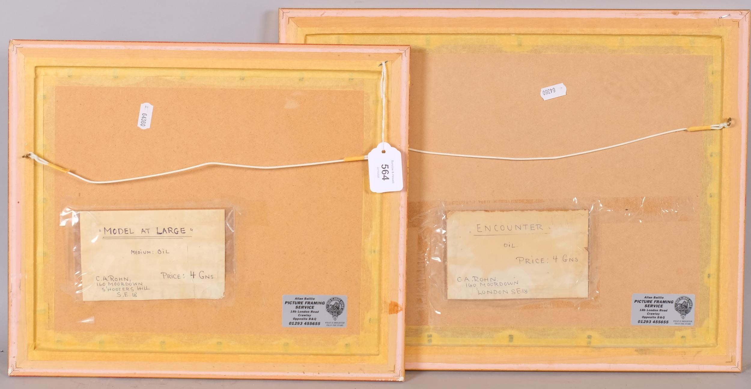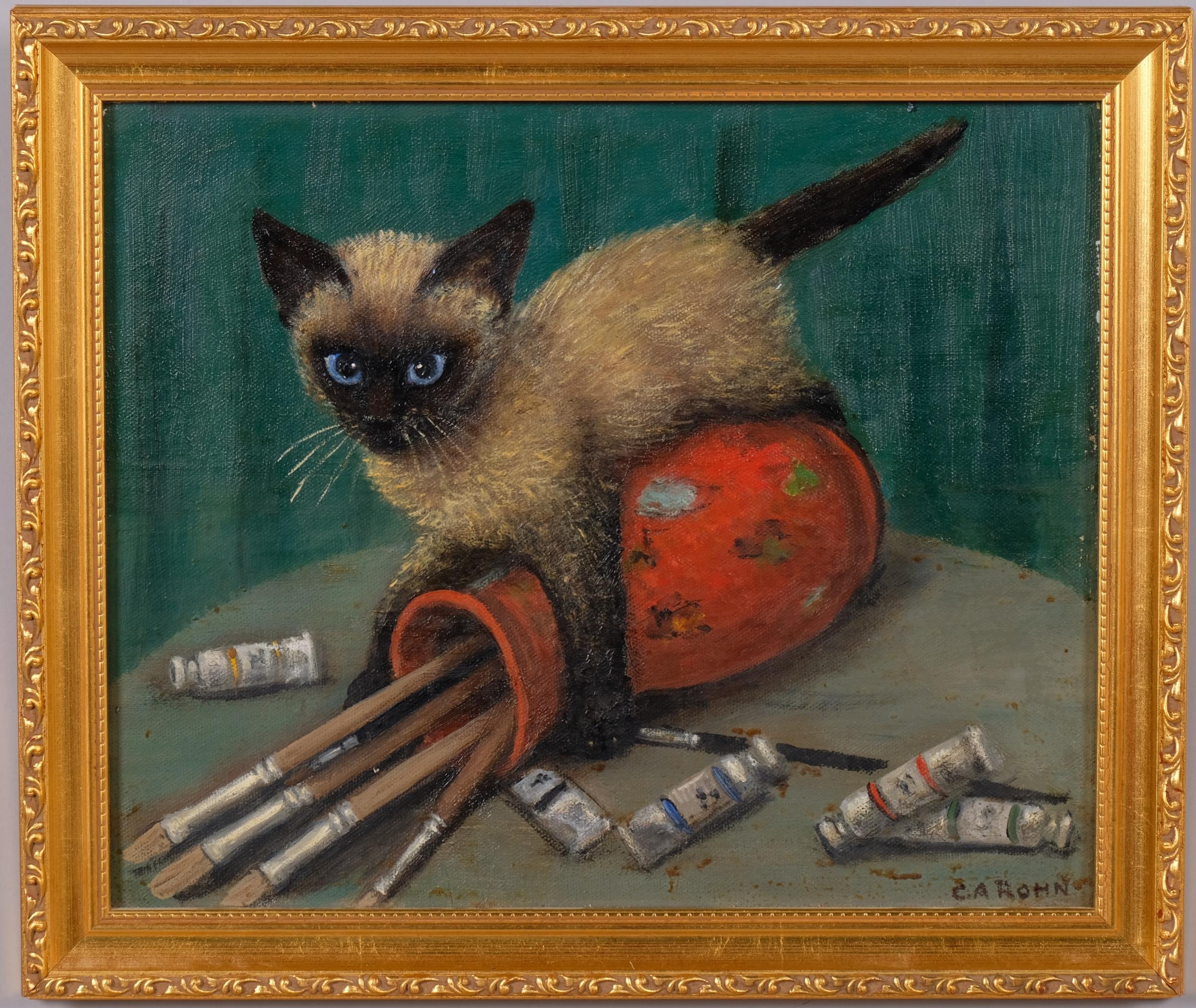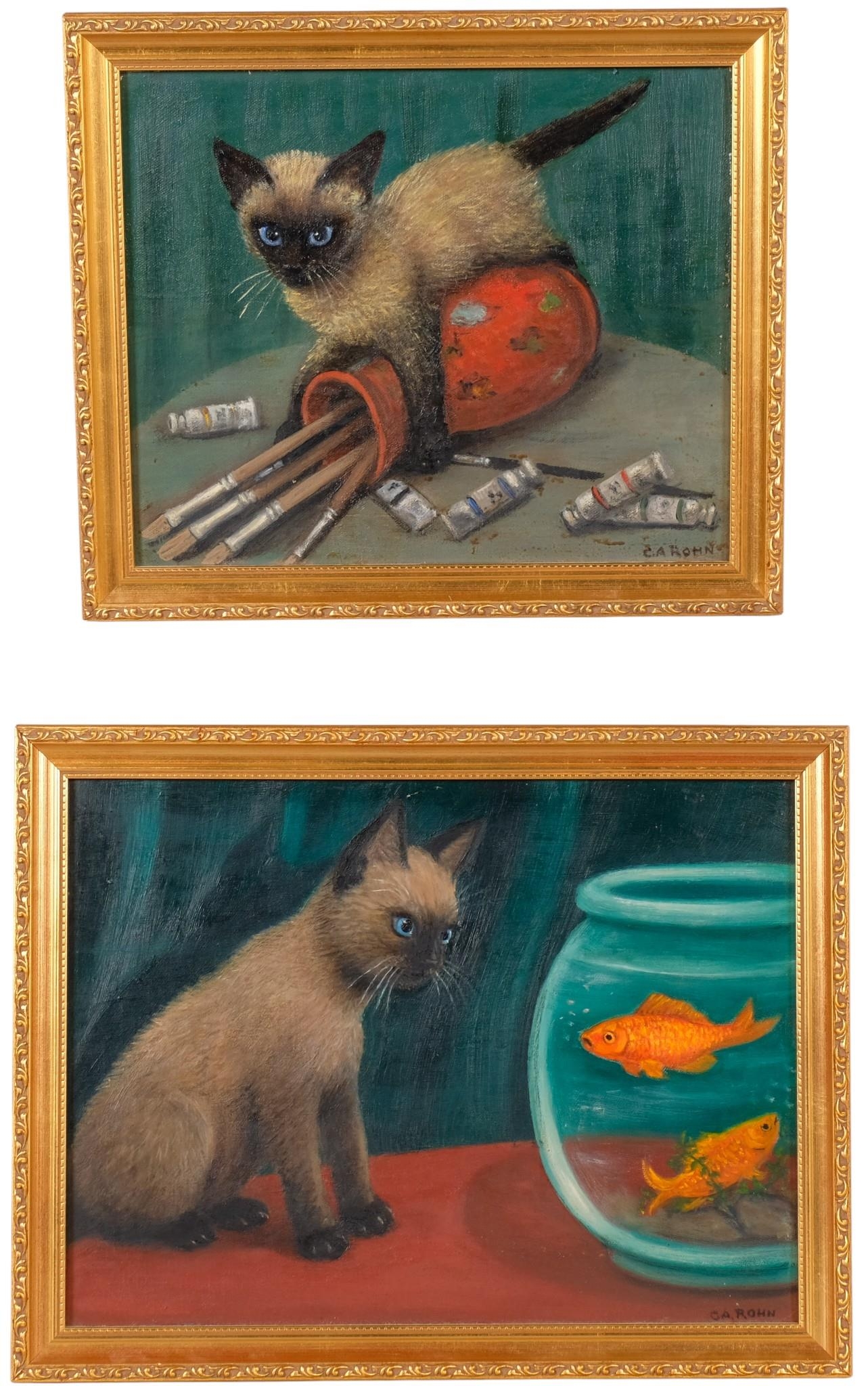 C A Rohn, 2 studies of playing cats, oils on board, largest 30cm x 40cm, framed (2)