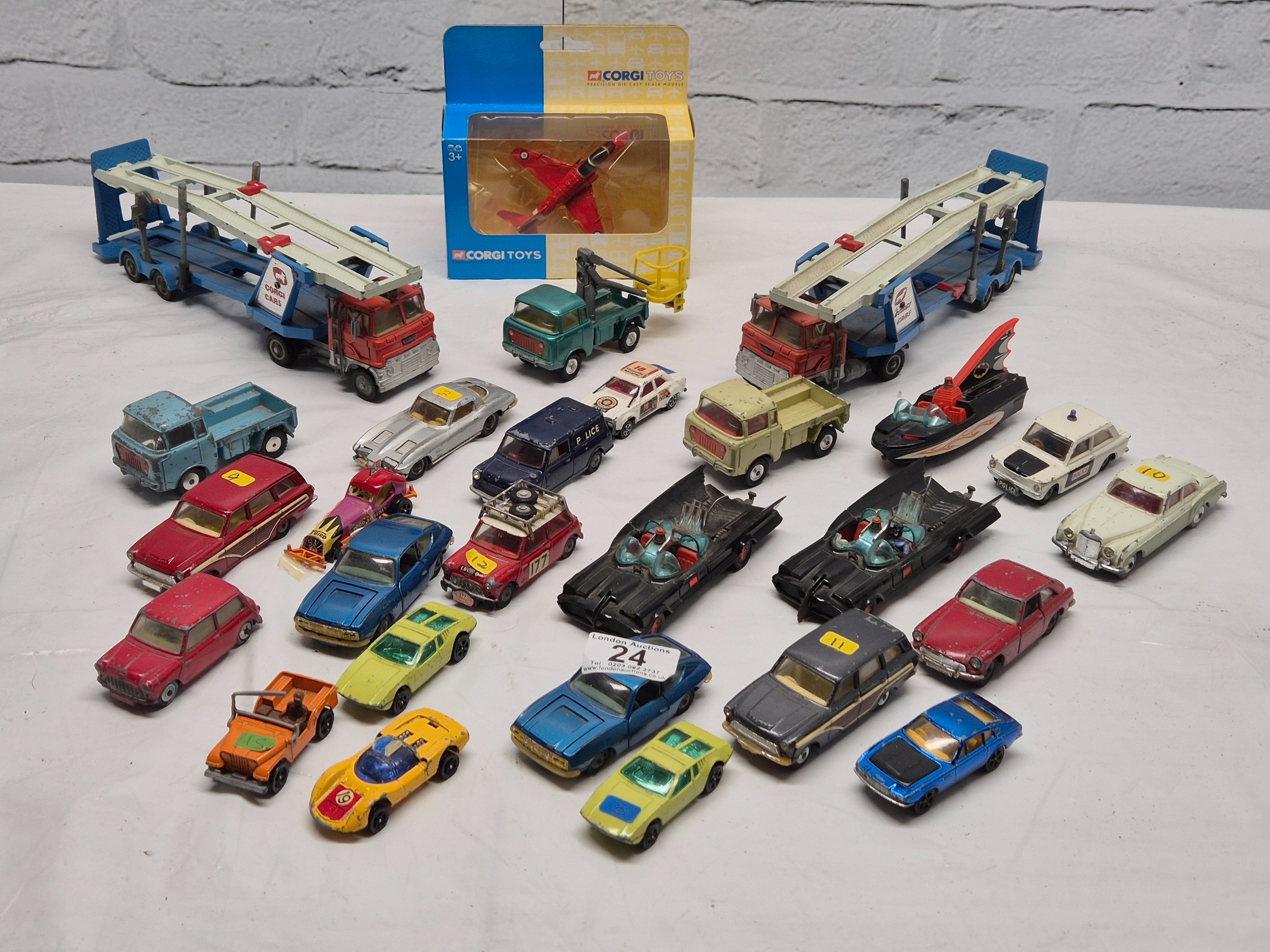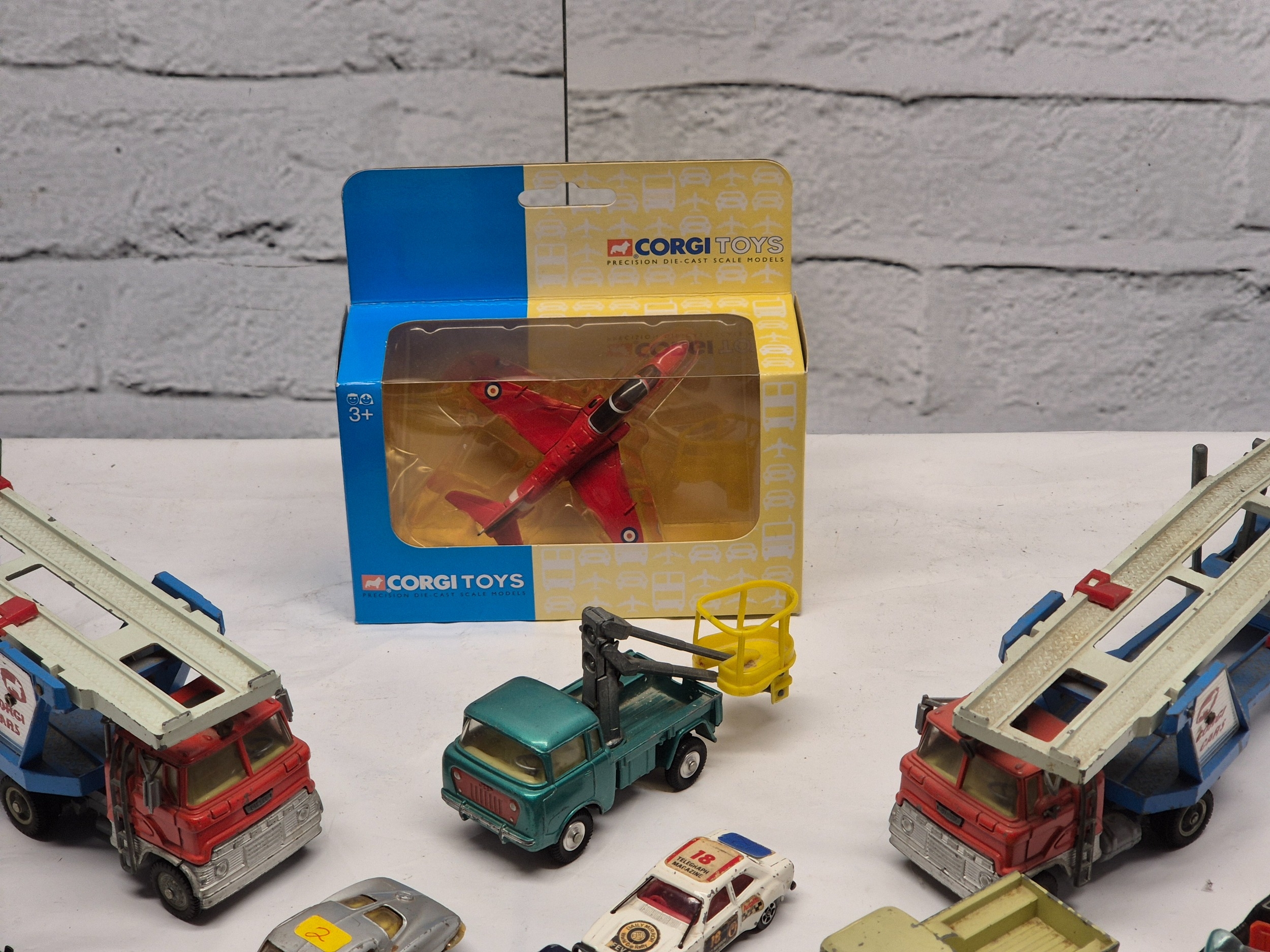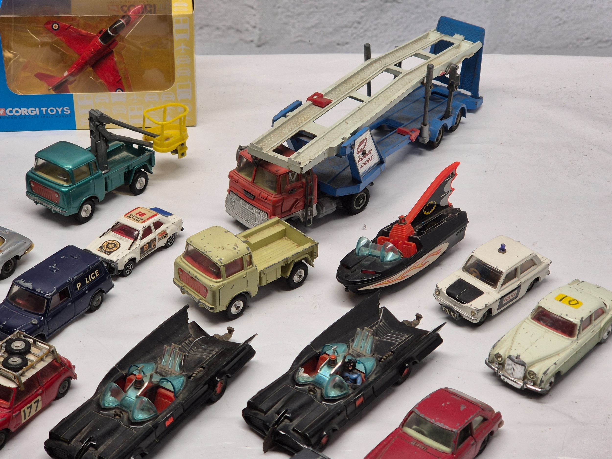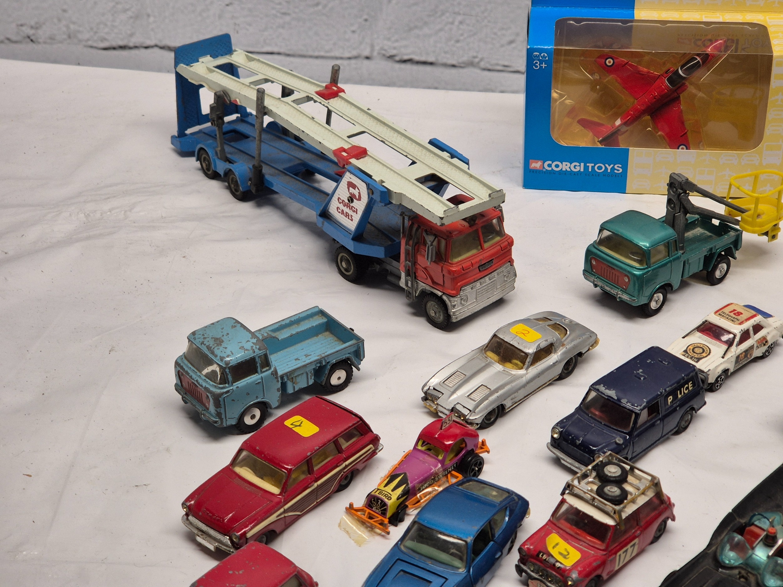 A Collection of Vintage Corgi Cars to include a boxed die-cast jet aircraft