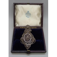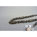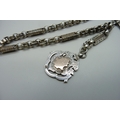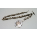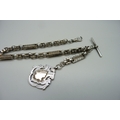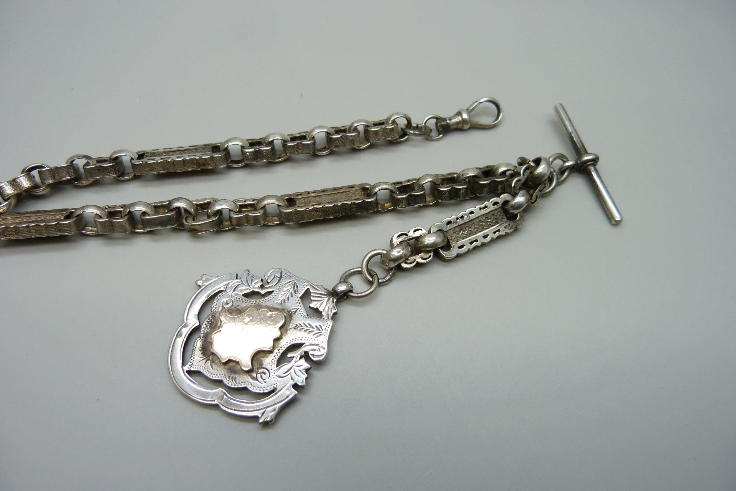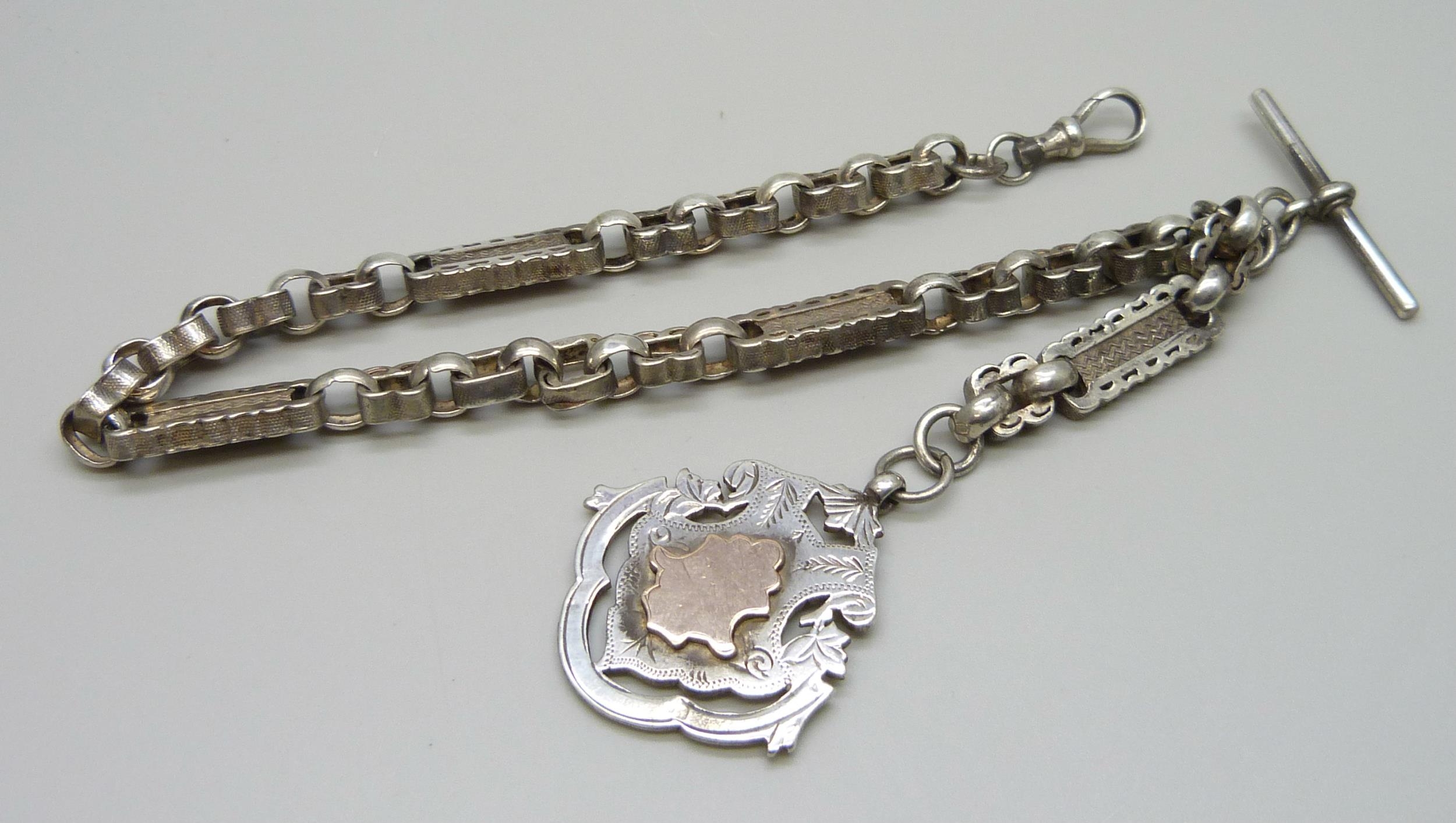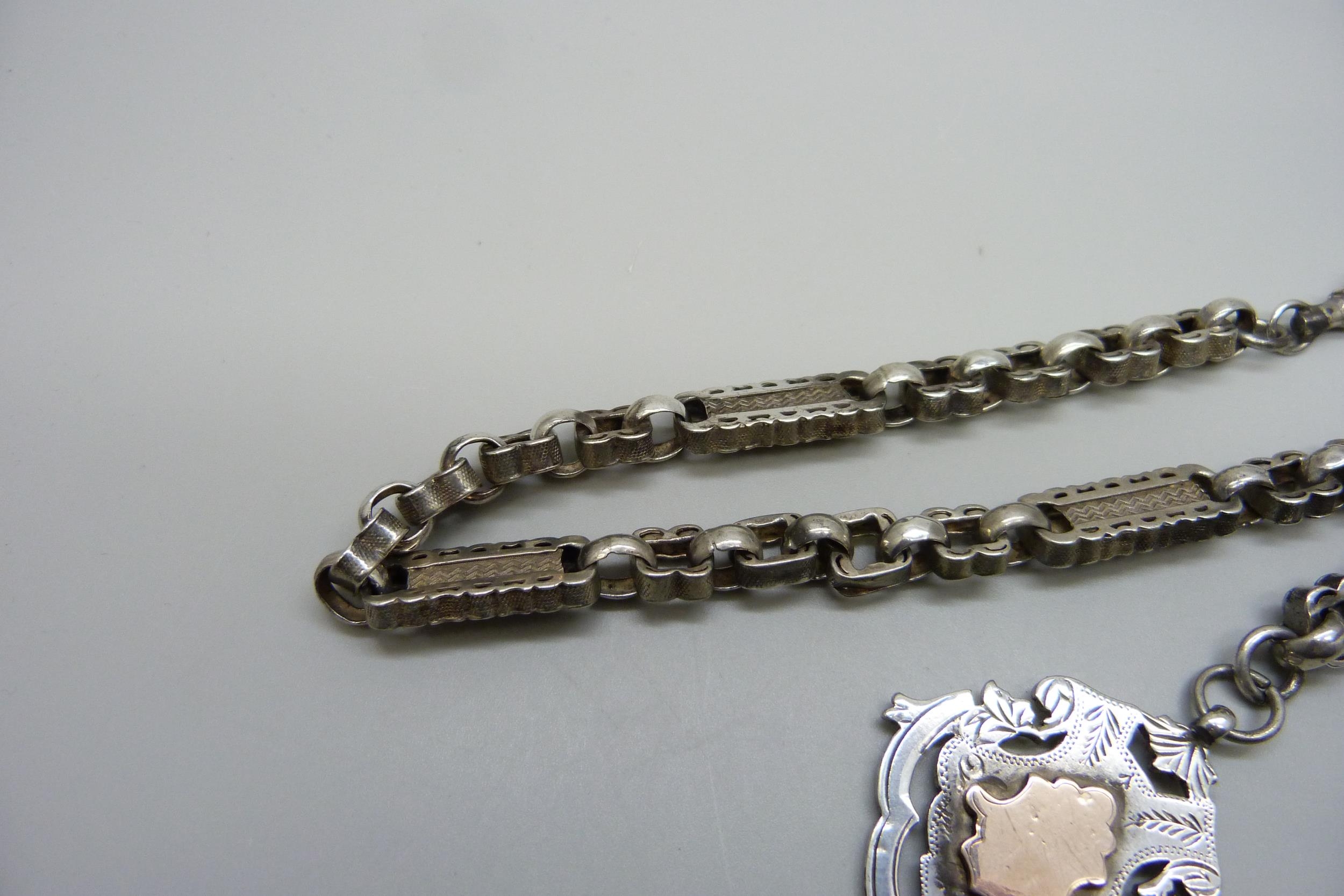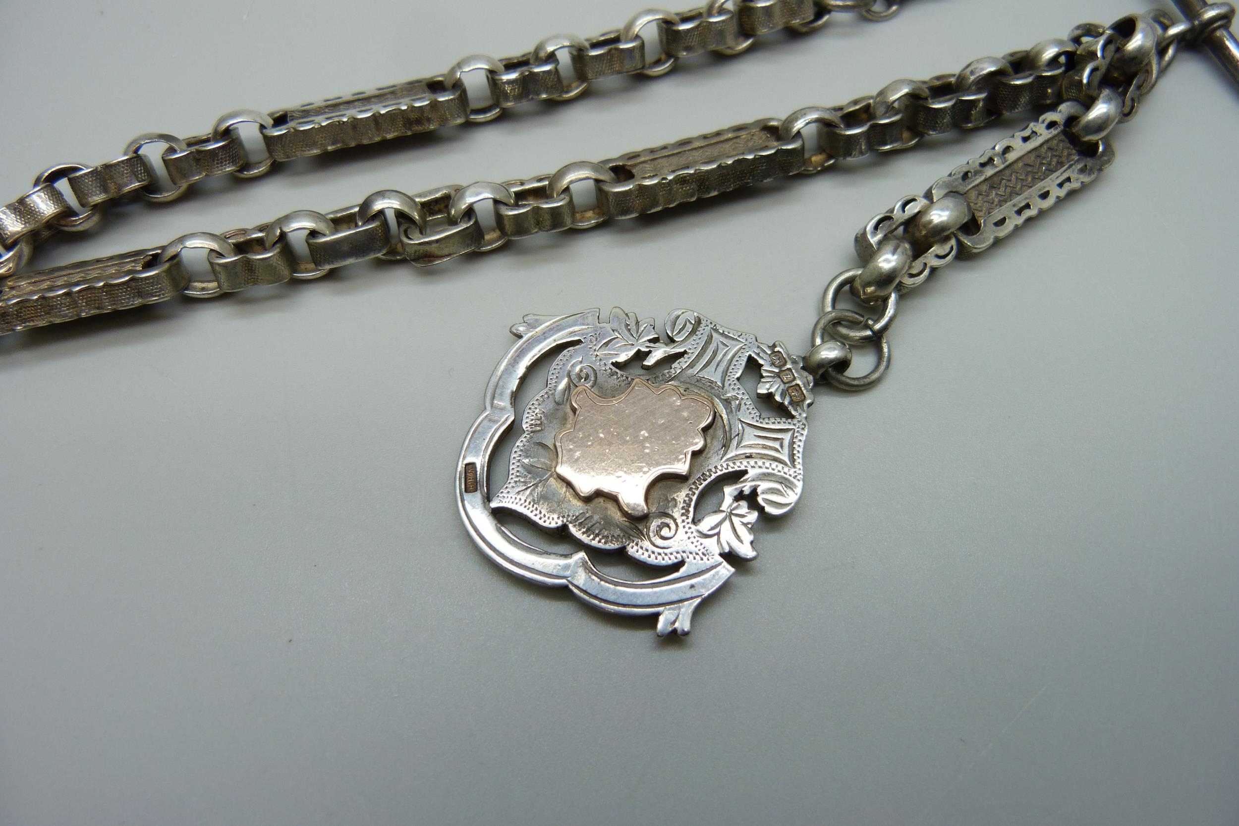 A Victorian white metal fancy link Albert chain and a silver fob with gold overlay, Birmingham 1899, chain 38cm, 67g