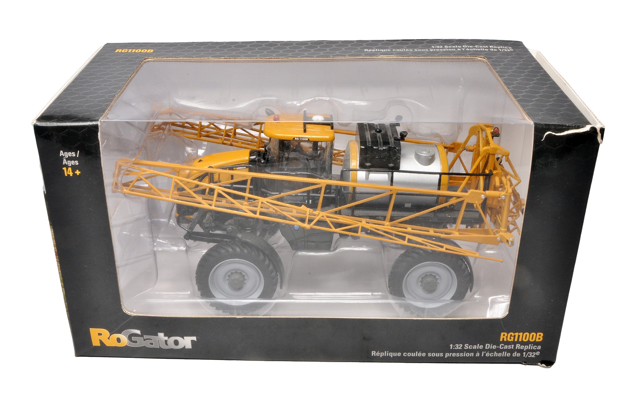 USK Scale Models 1/32 farm model issue comprising RoGator RG1100B Sprayer. Likely displayed but no obvious signs of fault - some handling wear expected. With original packaging and box (box has a front corner tear).