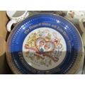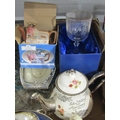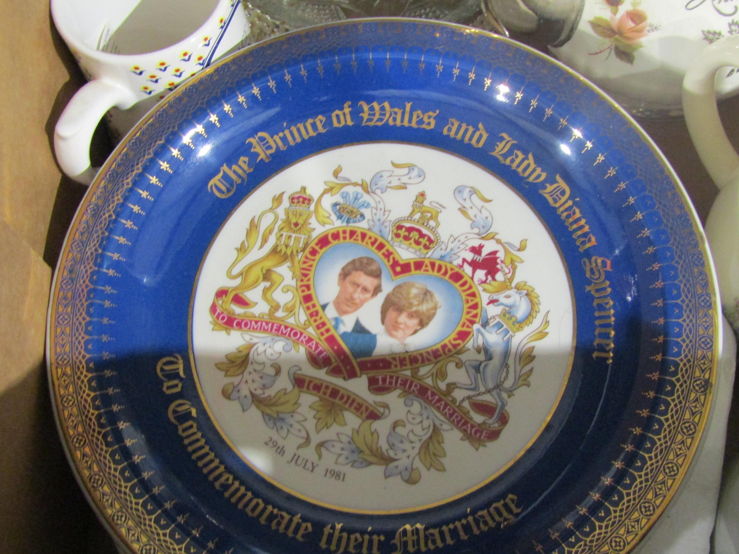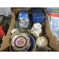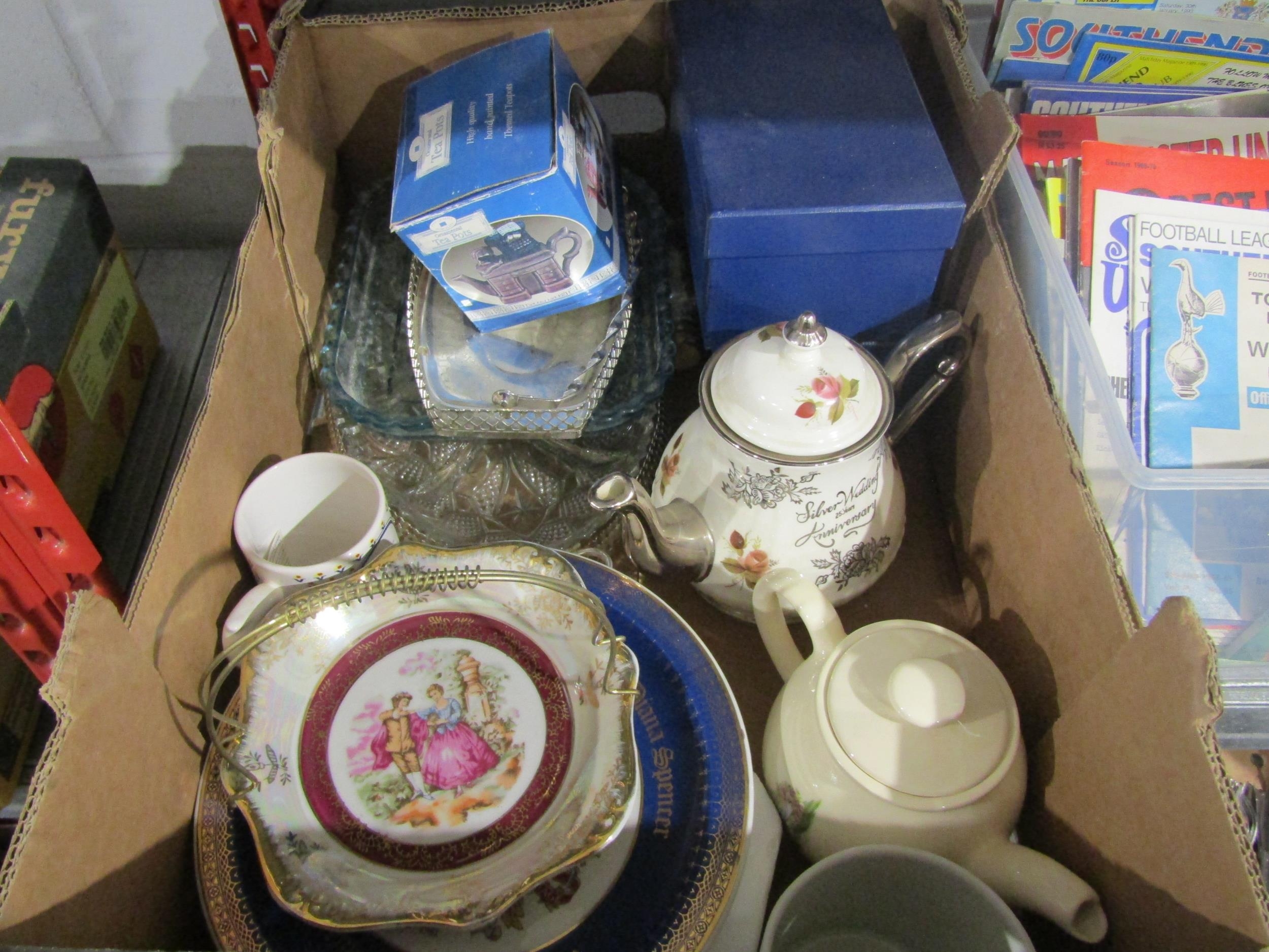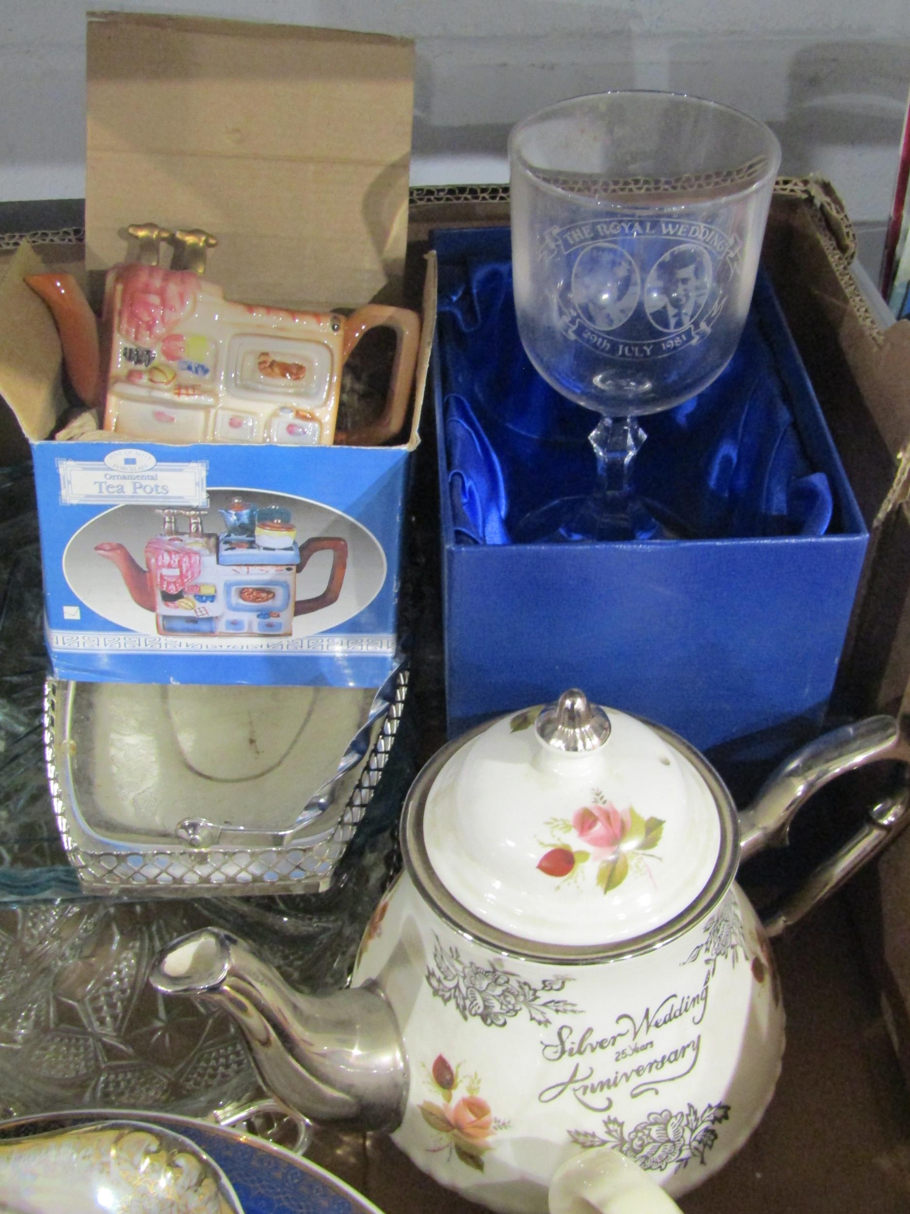A box containing three teapots, Four piece Kensington glass bon-bon dishes, Charles and Diana Wedding glass vases amd plate set
