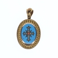 Antique Enamel Coral and Split Pearl Tombac Locket Pendant with Cross Design. Measures approx. 5 x 2.9cm. The closure is in working order, there is a small chip to the enamel, glass inside is cracked, all stones are intact. Weighs in total 16.9g.