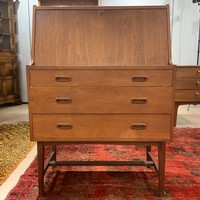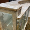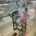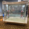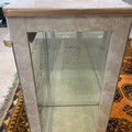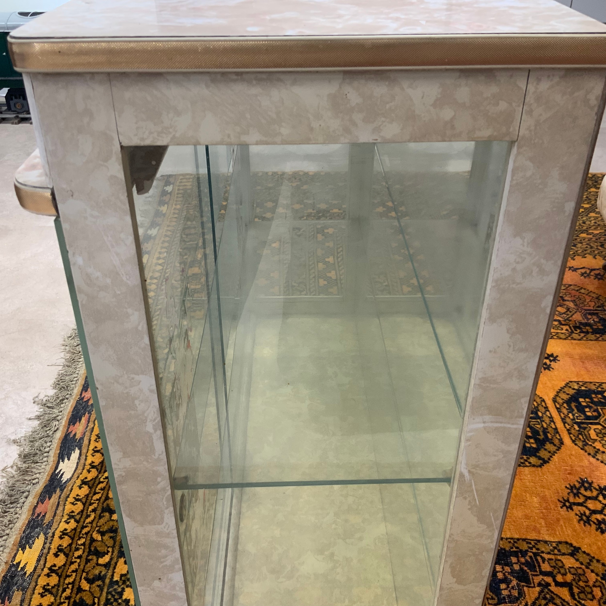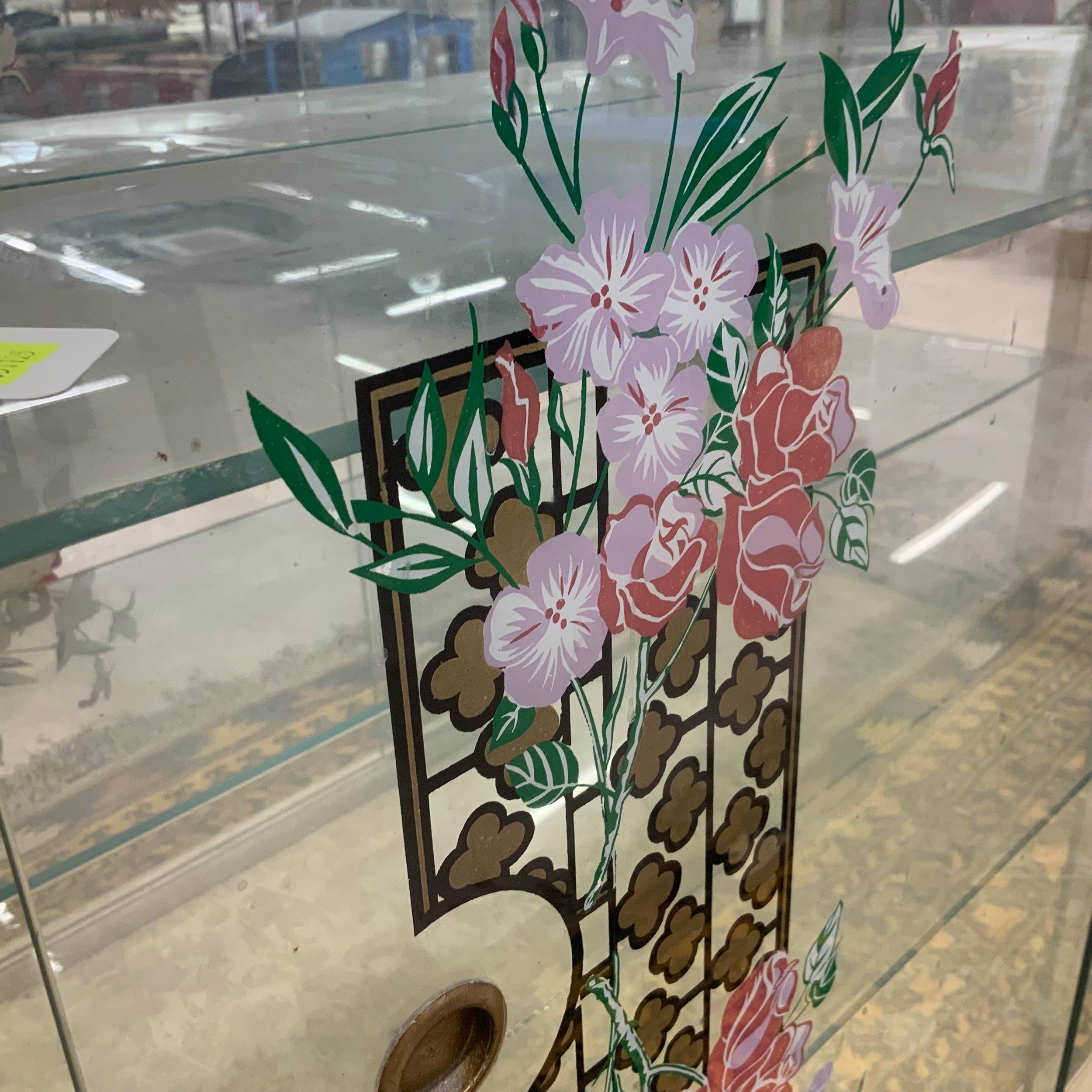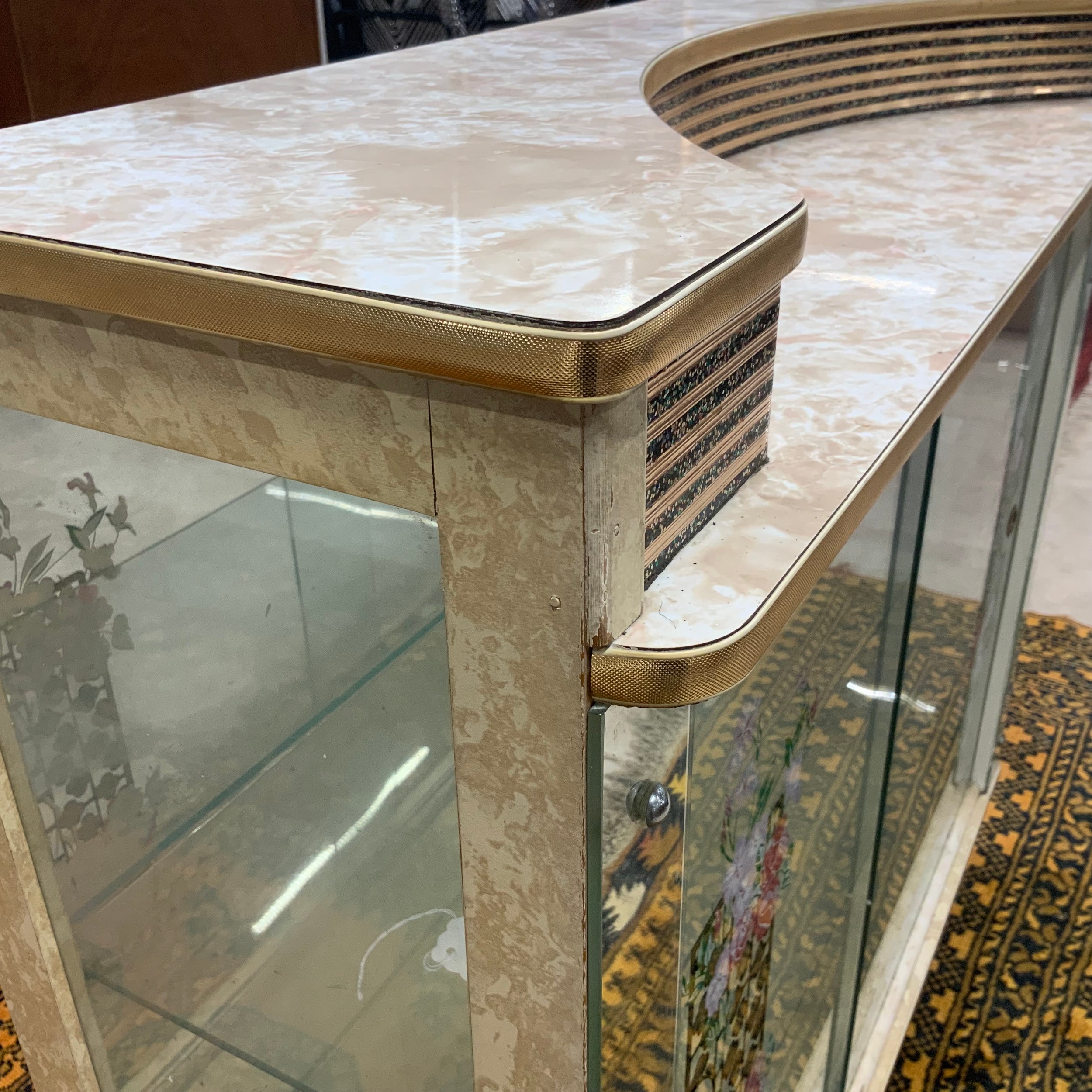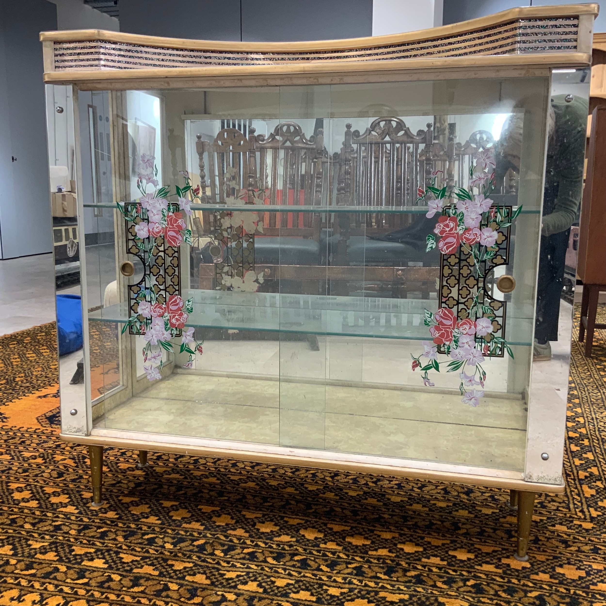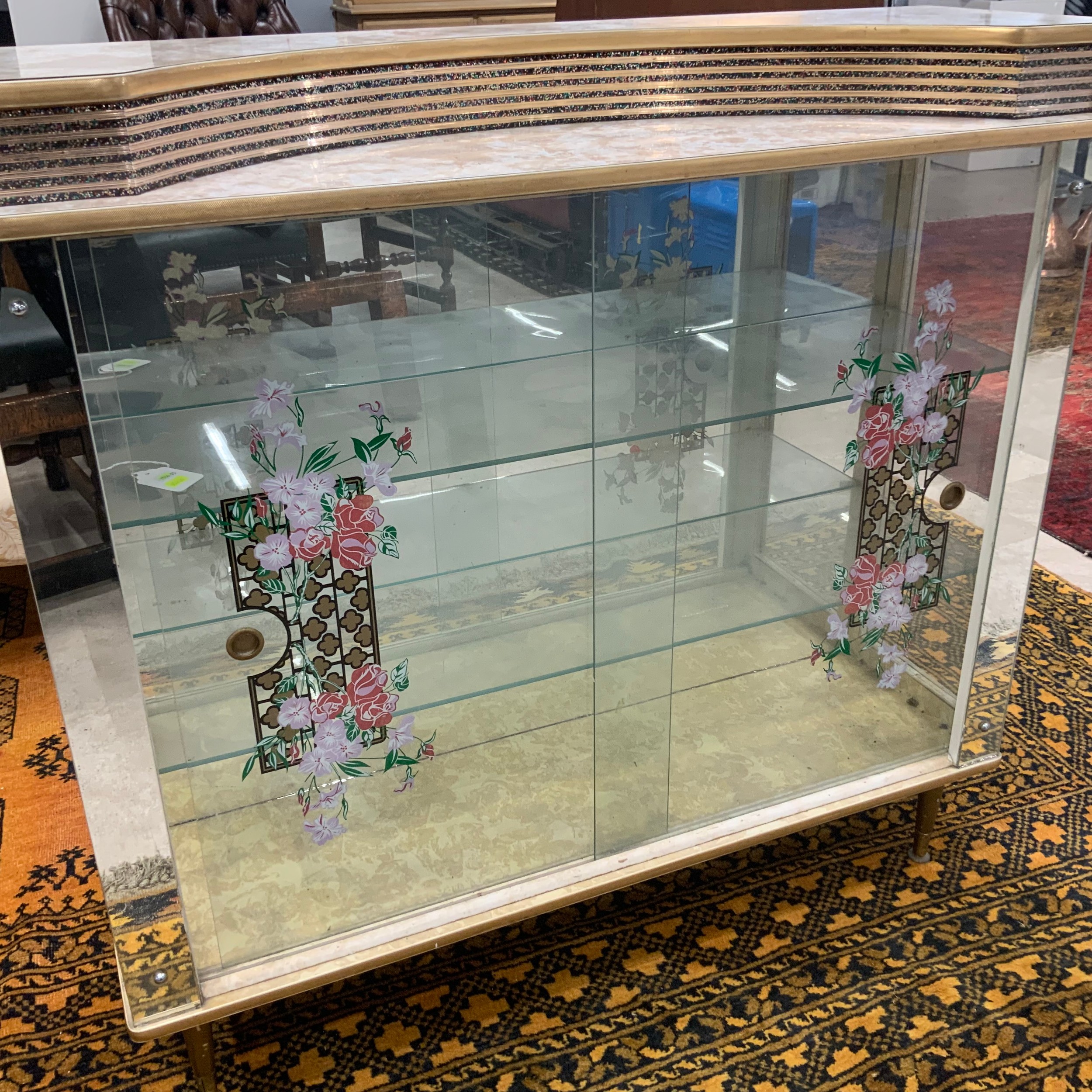 A vintage display cabinet, with a formica top, sliding glass doors decorated with flowers, standing on tapering legs, 104.5cm long, 32cm deep, 102cm high.