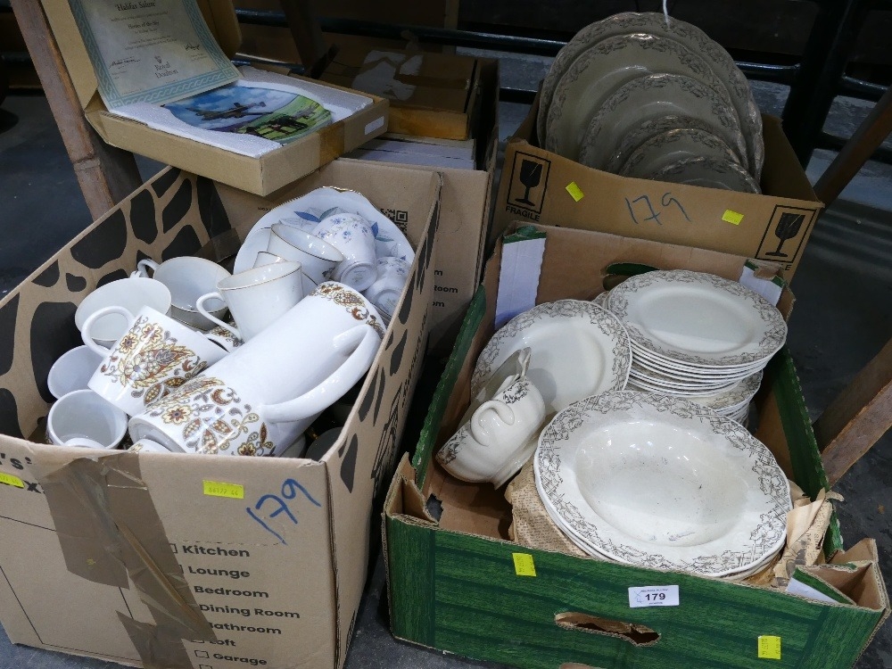 Four boxes of dinnerware, part tea sets, boxed collectors' plates etc