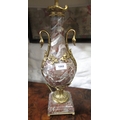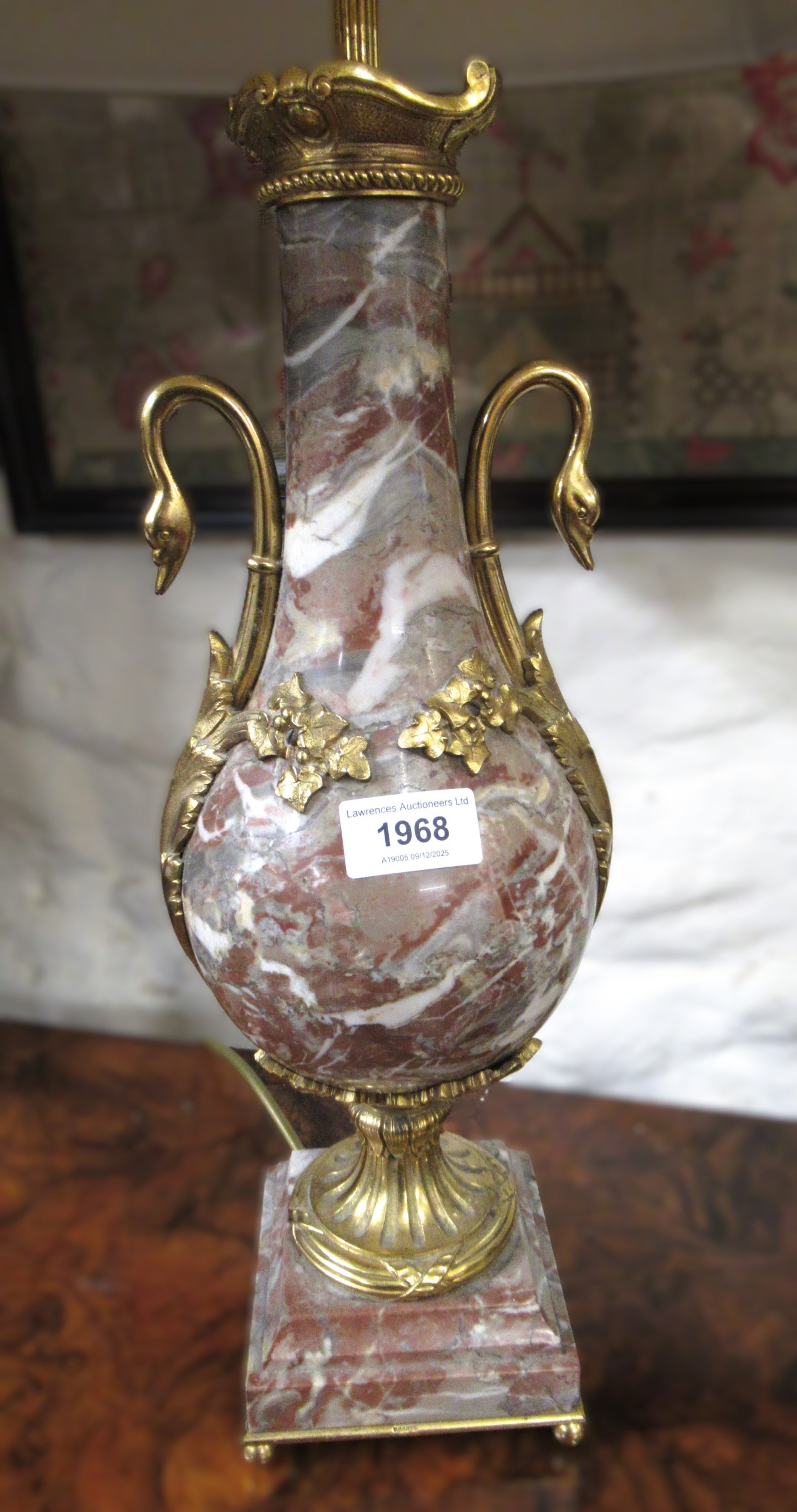 Pair of 20th Century French ormolu mounted rouge marble table lamps with shades (minus two feet)