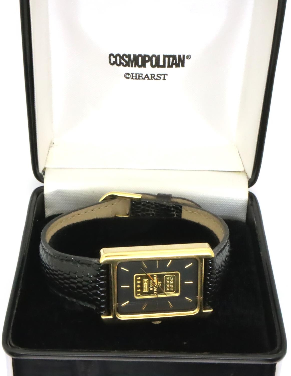 Swiss wristwatch, the black rectangular dial set with a fine gold ingot. P&P Group 1 (£14+VAT for the first lot and £1+VAT for subsequent lots)