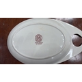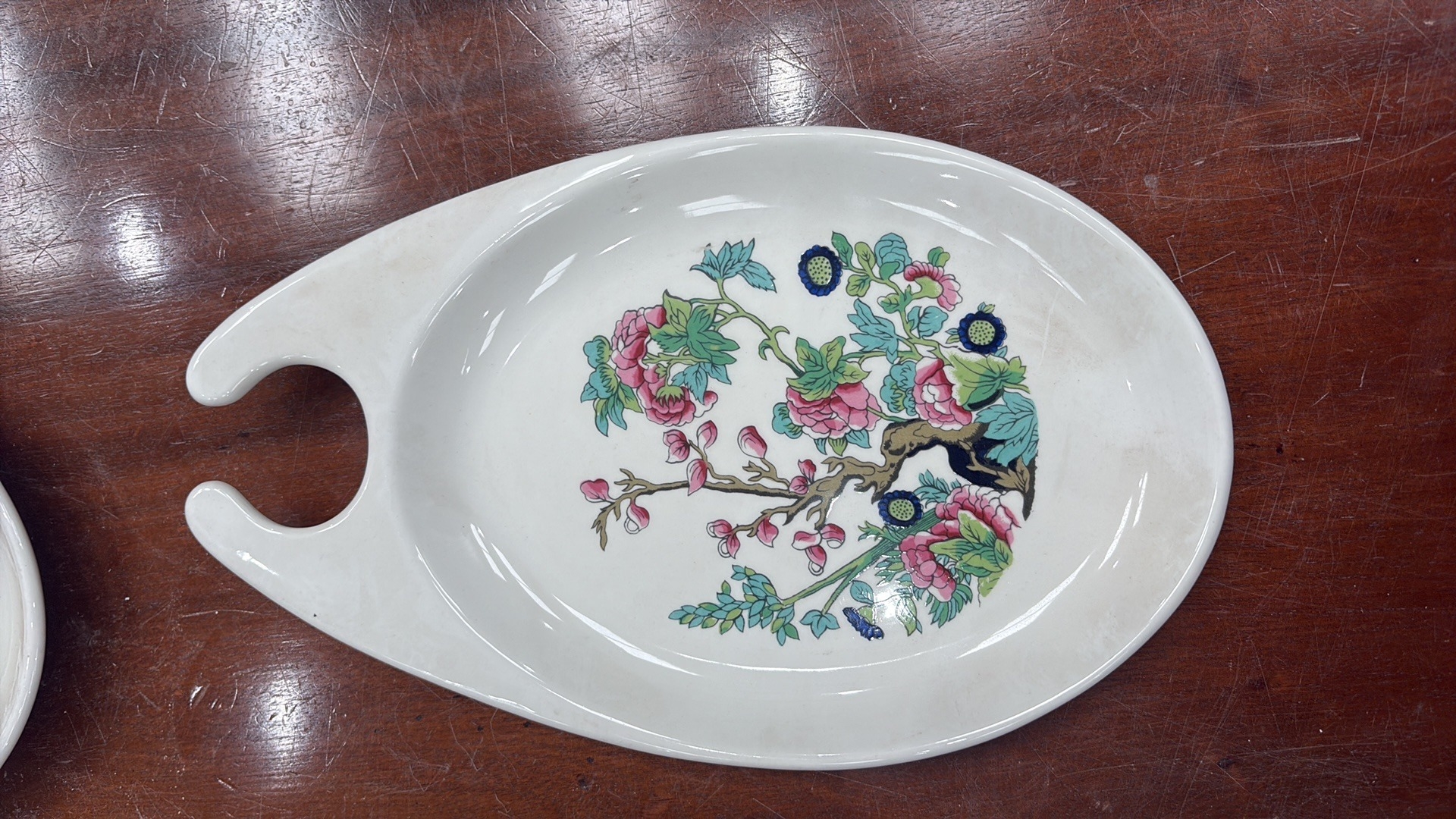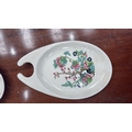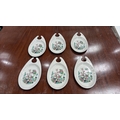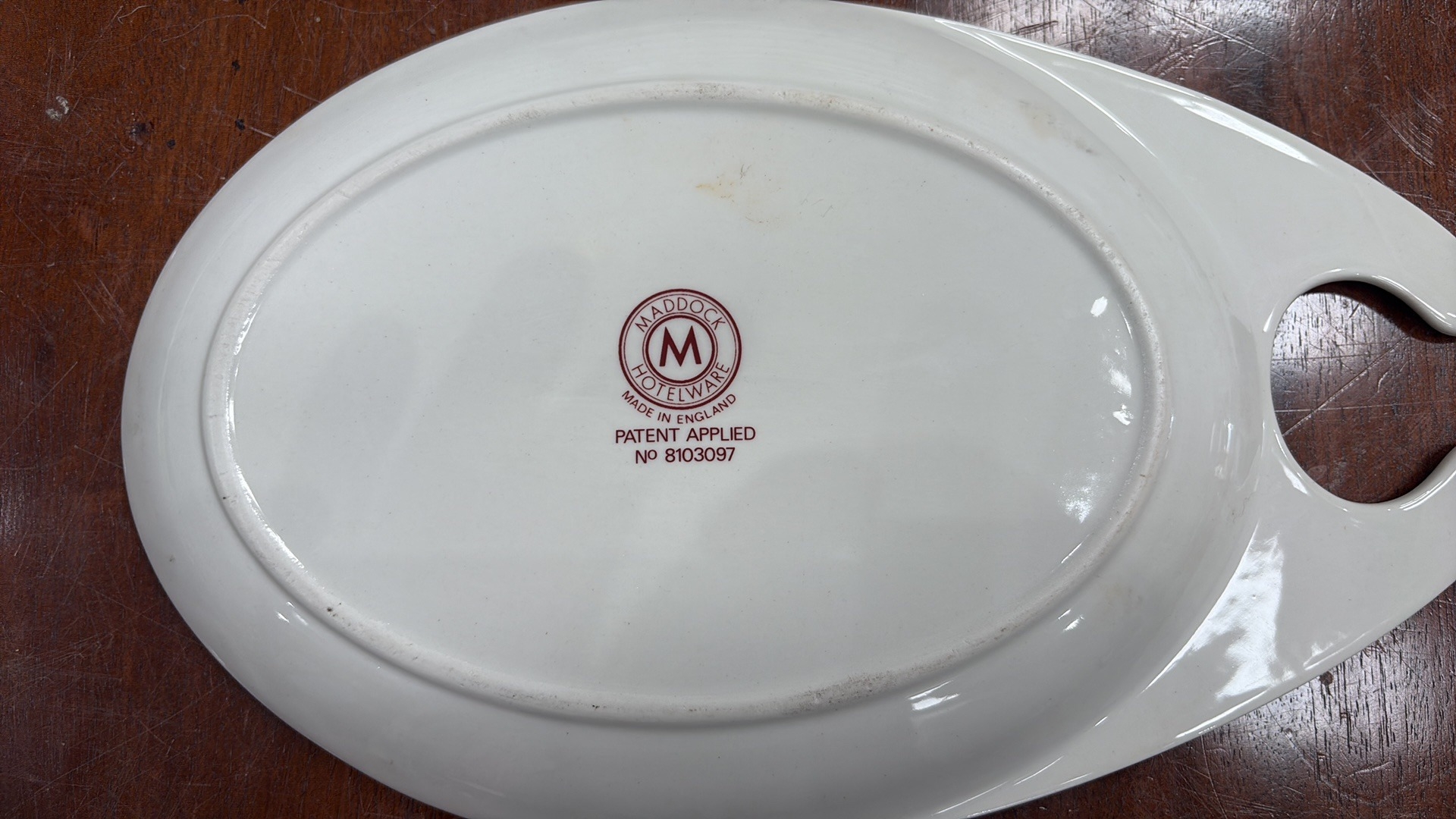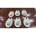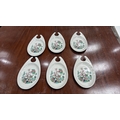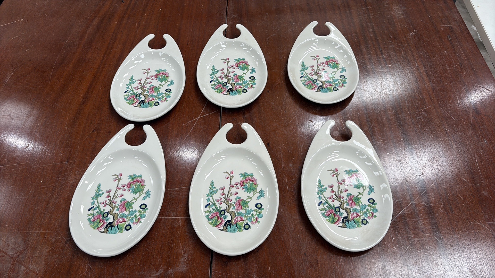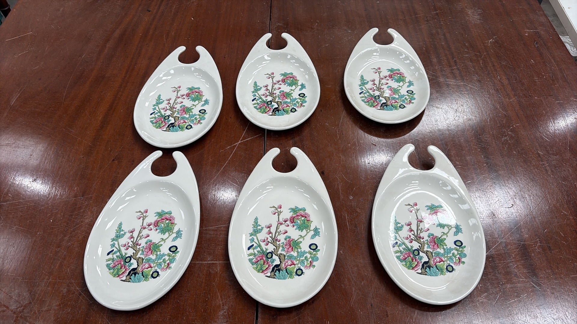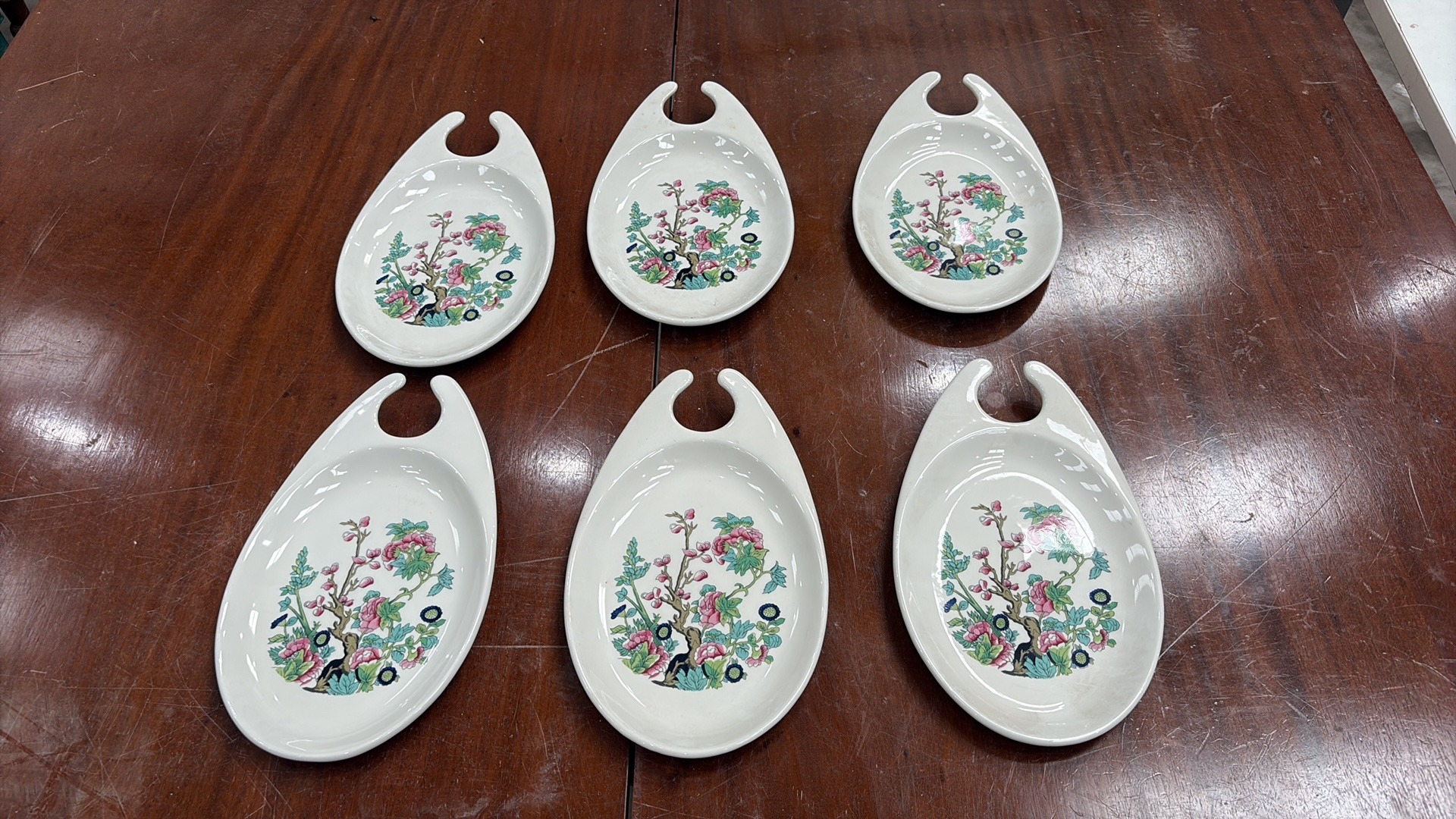 Set of 6 Maddock Hotelware white ceramic hook-handled side dishes, transfer printed with stylised oriental blossoming branch motifs, each underside stamped ‘Maddock Hotelware, Made in England, Patent Applied No 8103097’.