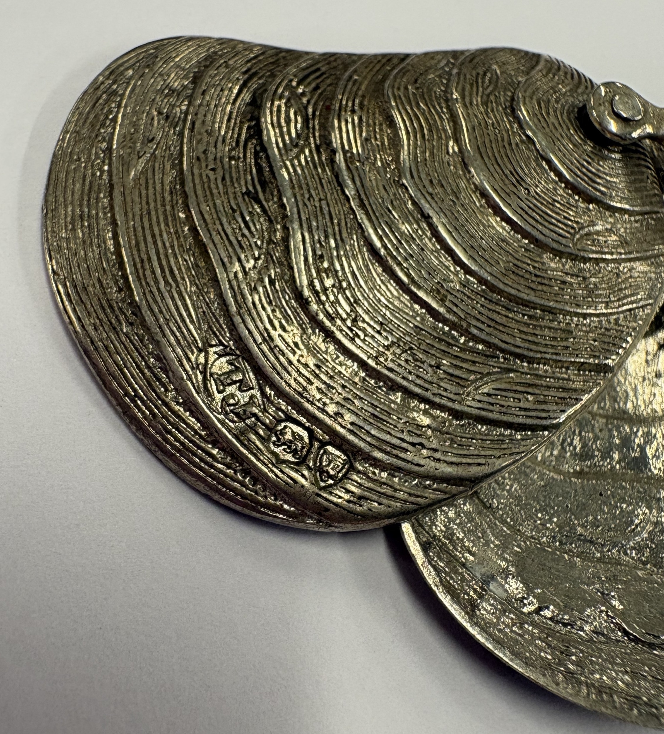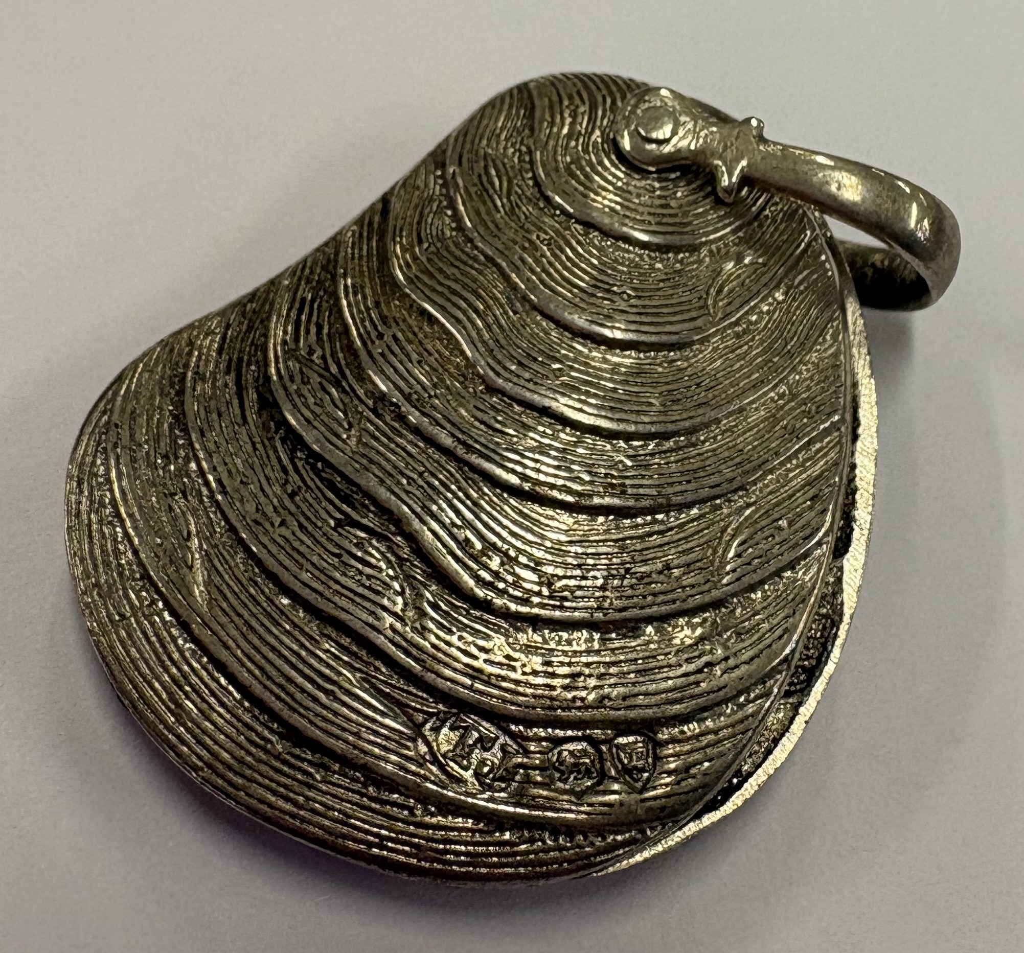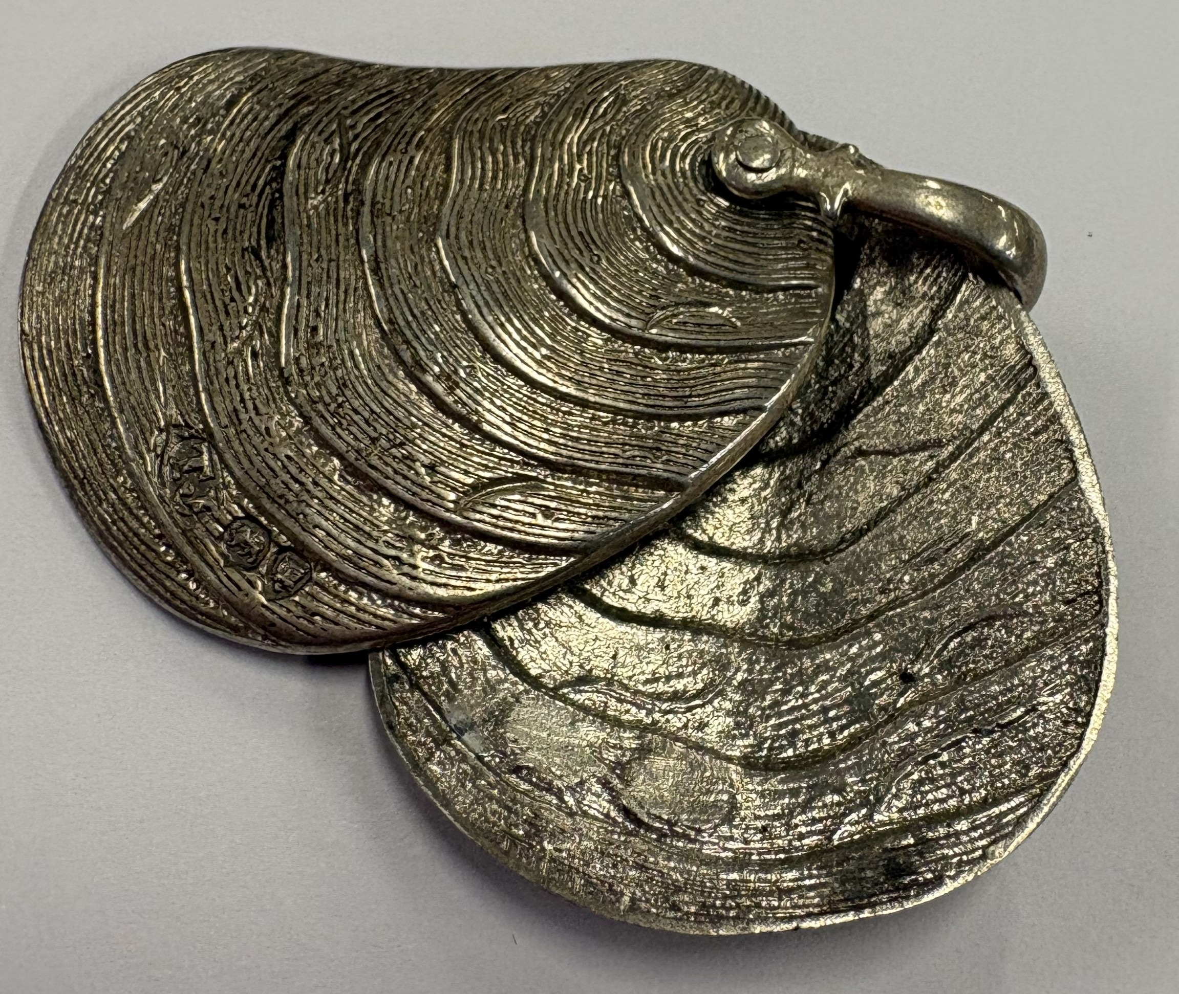 A rare silver case with pivot mechanism in the form of a shell. London 1874. By Thomas Johnson. Approx. 21 grams. Est. £300 - £400.