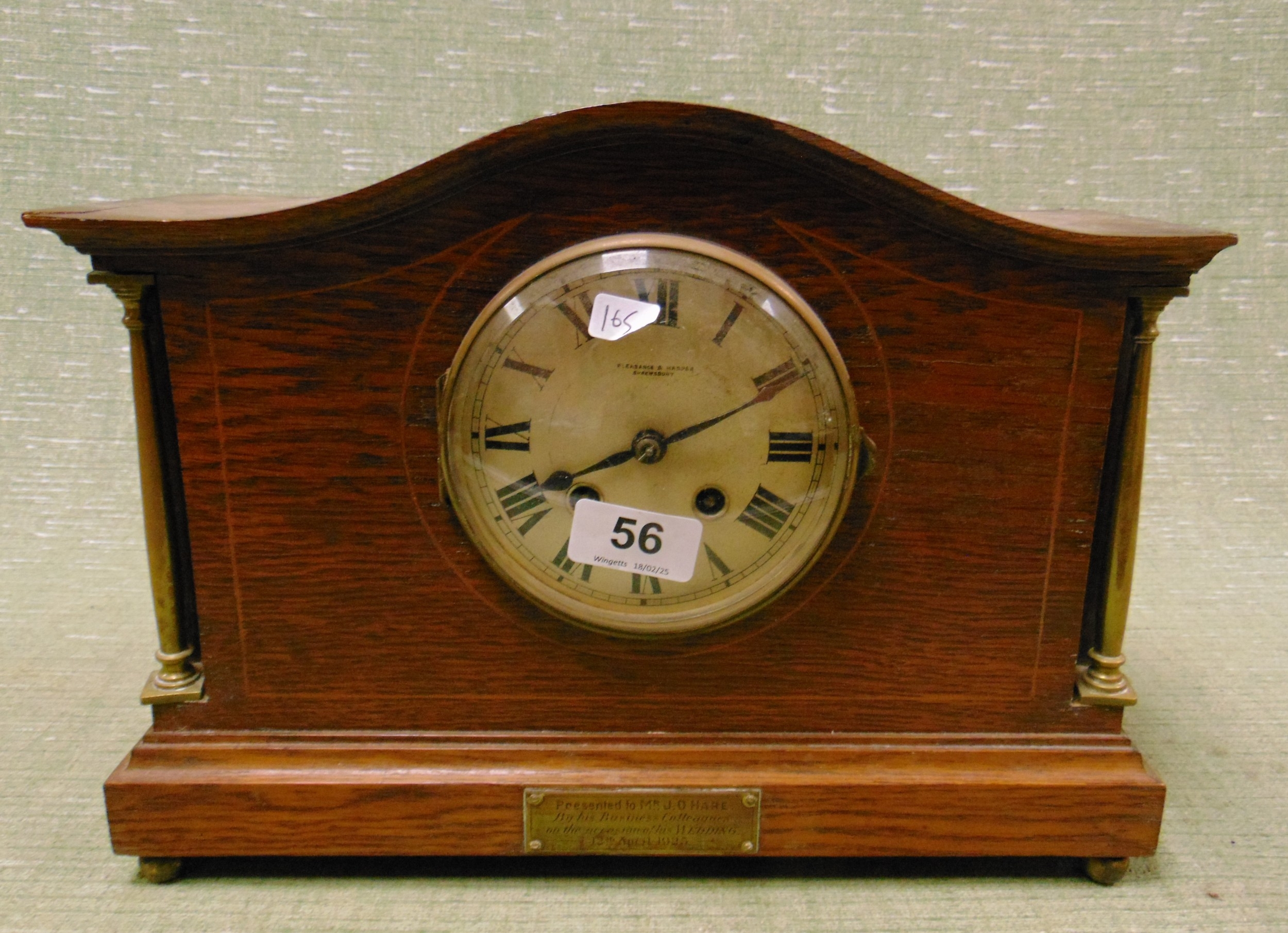 Pleasance & Harper Shrewsbury oak cased mantle clock, 10 x 14 x 5" deep.