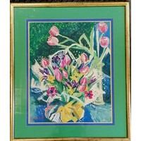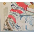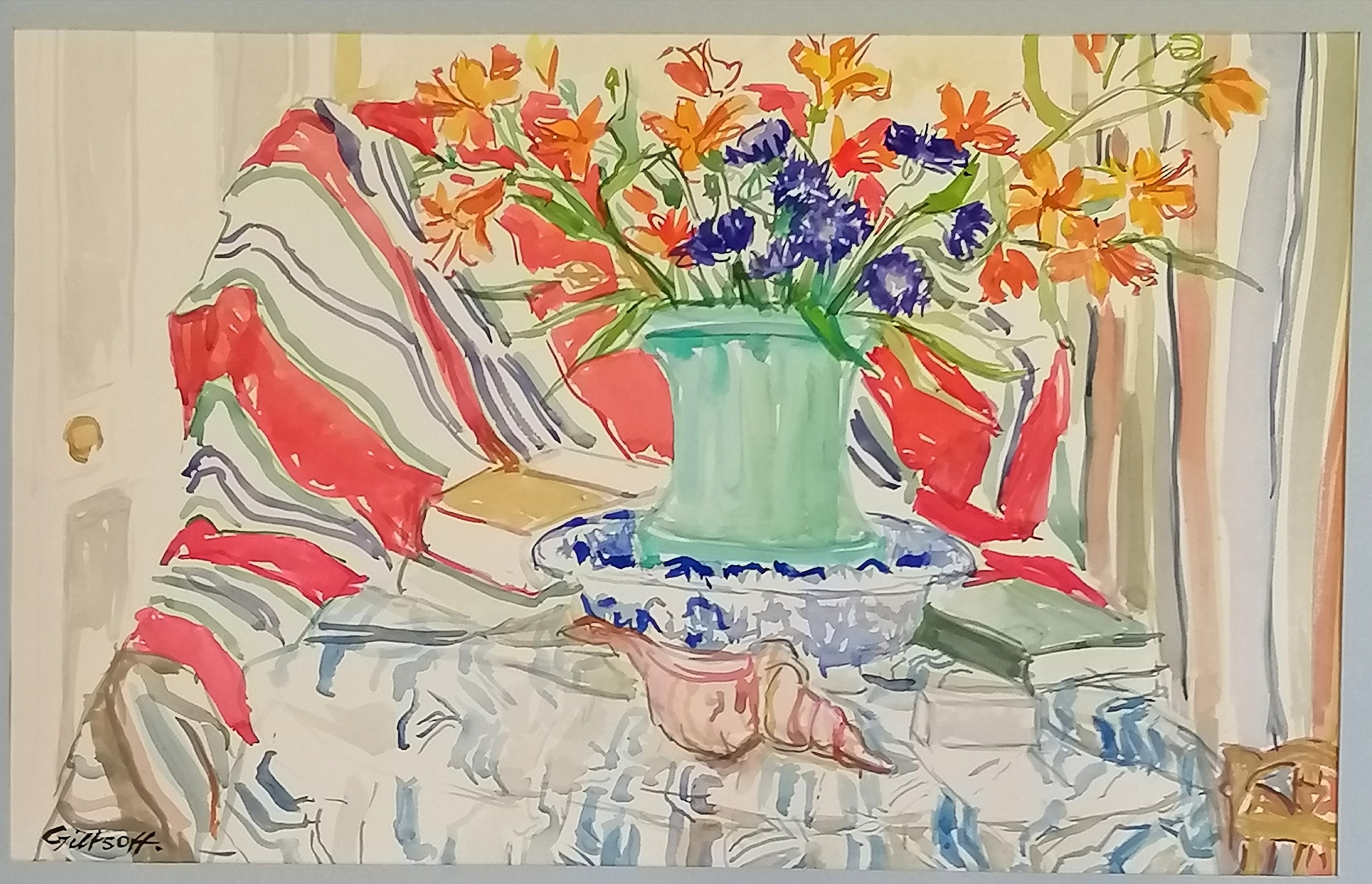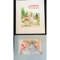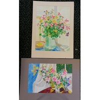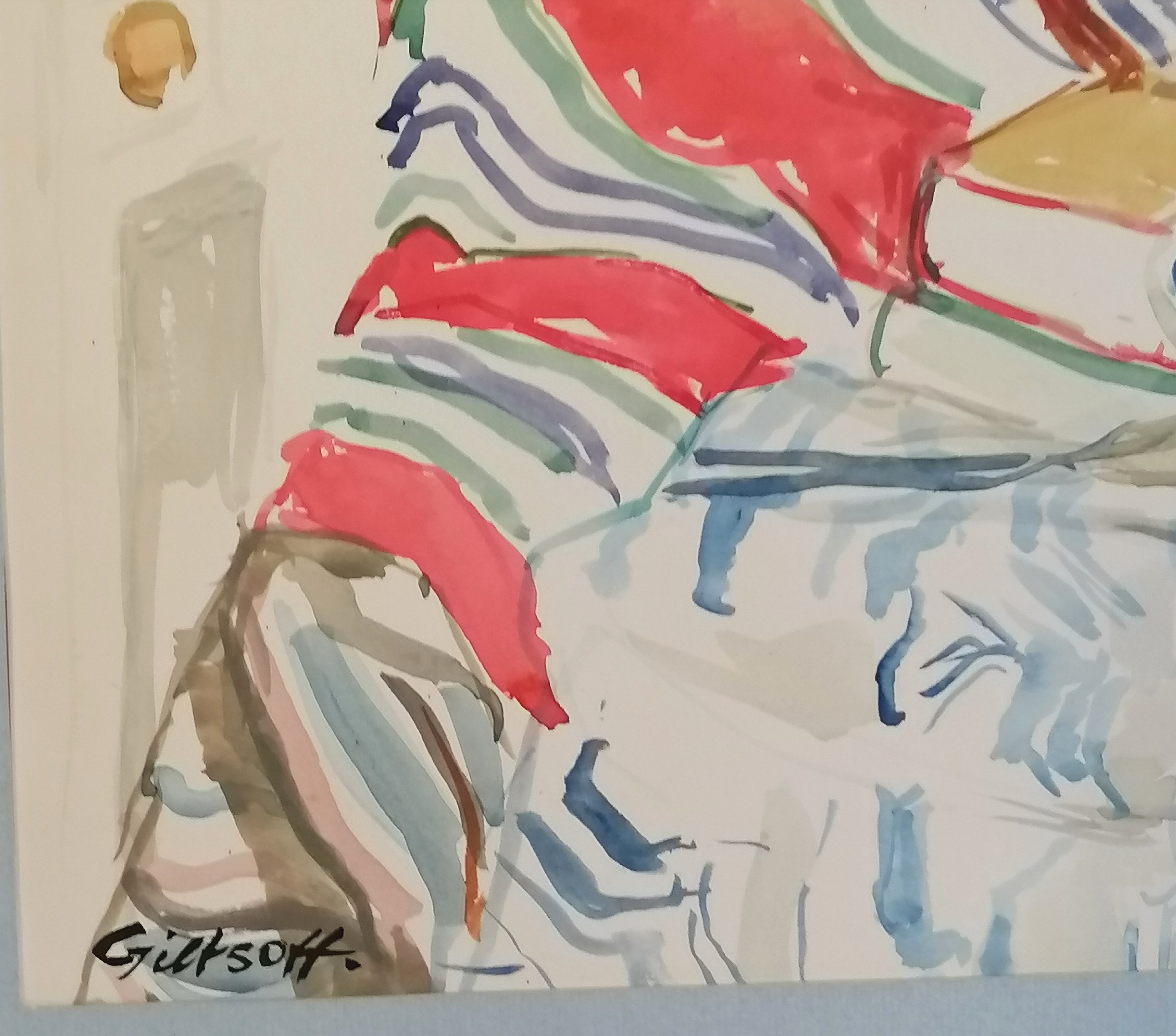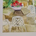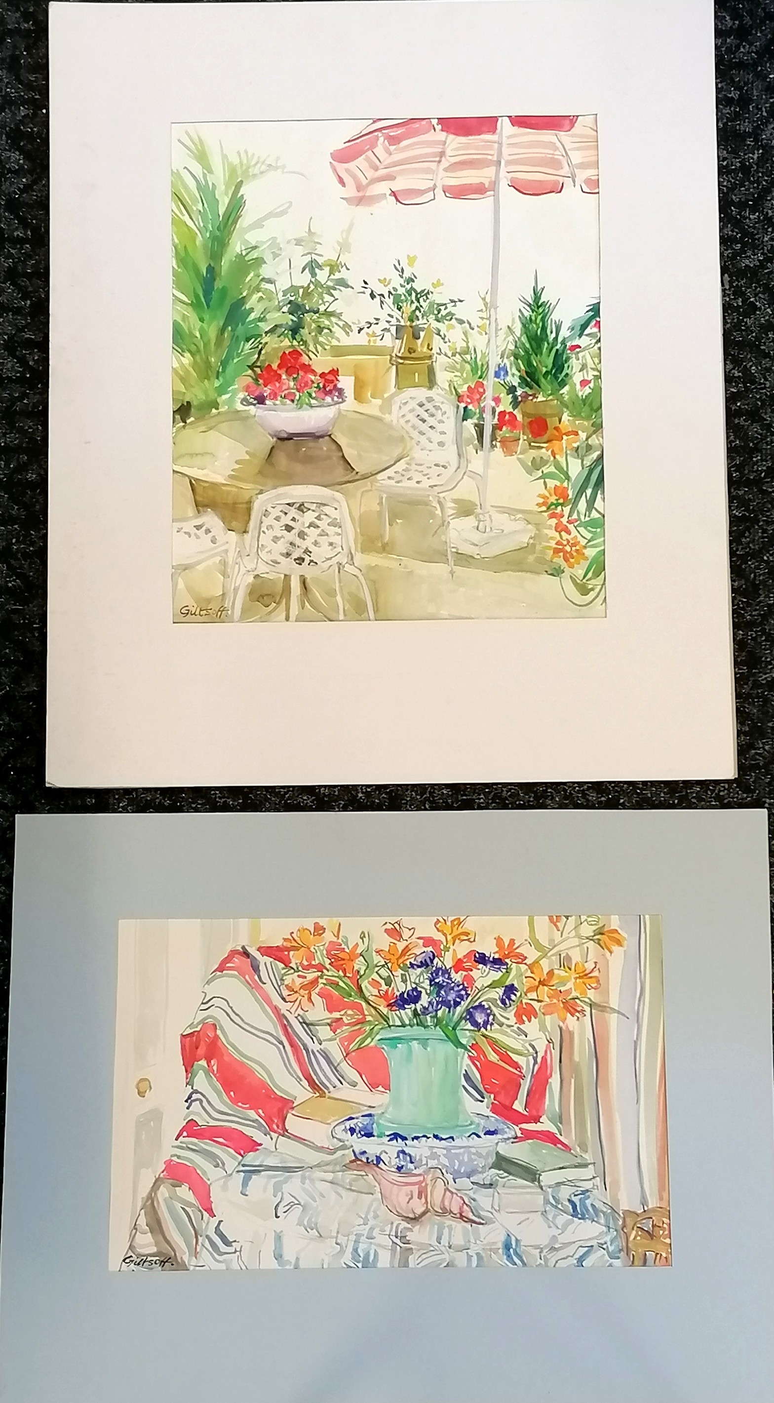 2 mounted contemporary watercolours of a garden table and chairs 80cm x 67cm and vase with striped fabric signed Giltsoff by Natalie Giltsoff