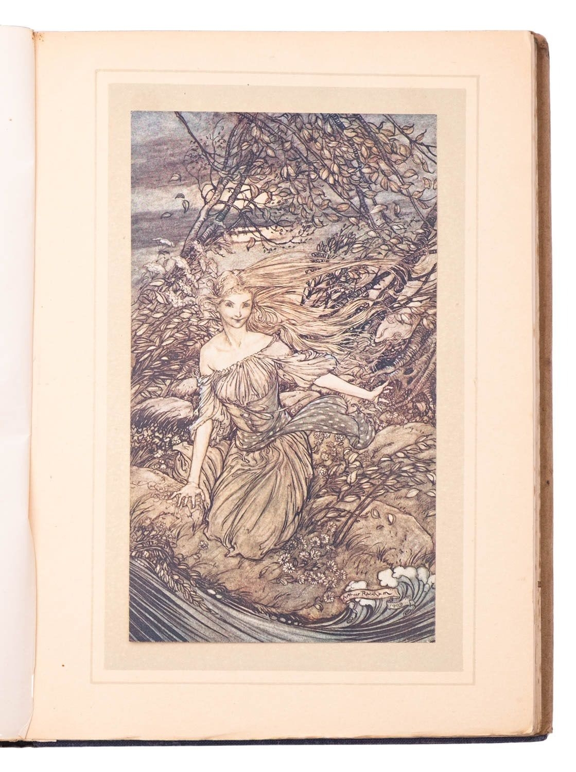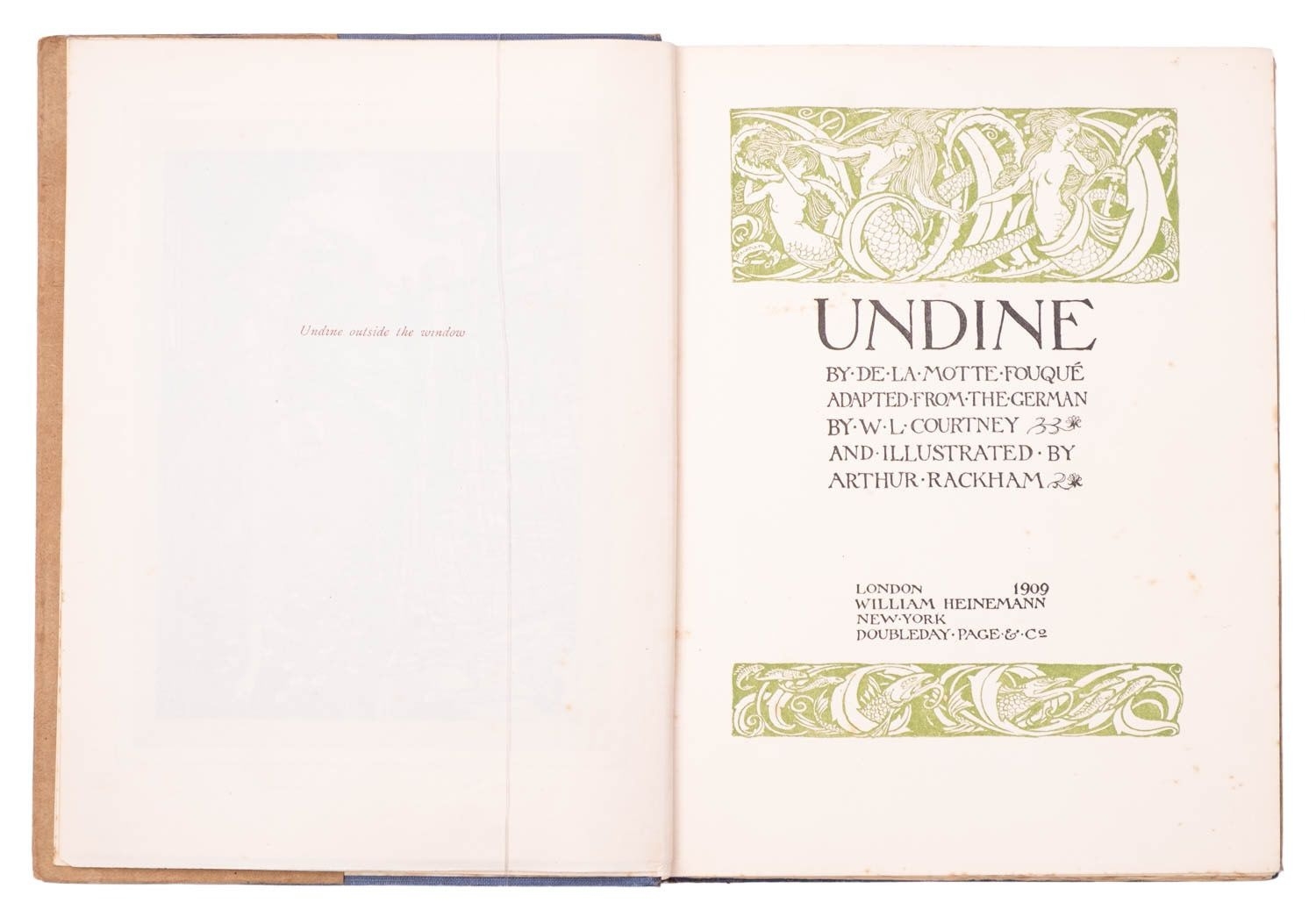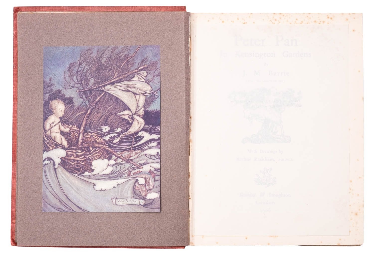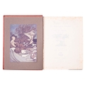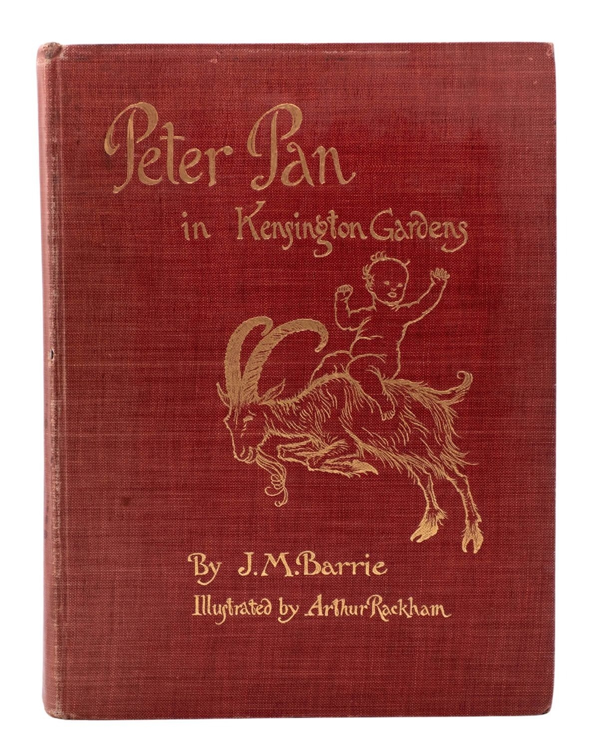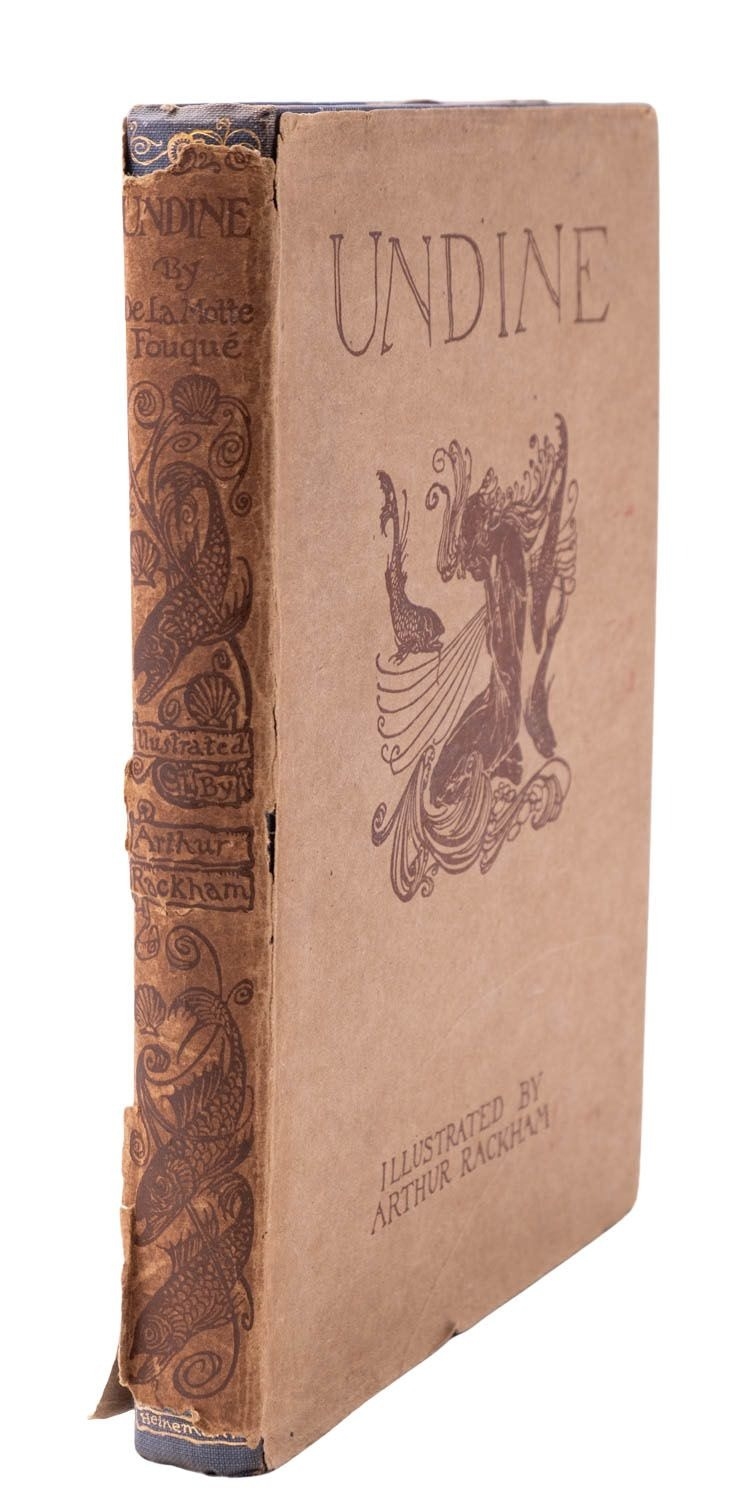 RACKHAM, Arthur (illust.). Peter Pan in Kensington Gardens, 1st trade edition, London: Hodder & Stoughton, 1906, 50 tipped-in col. plates, captioned tissue guards (some spotting), spotting (primarily at front and edges not affecting plates), frontis. leaf becoming detached, orig. russett pictorial cloth gilt rubbed, 4to; IDEM (illust.). Undine, 1st edition thus, London: William Heinemann, 1909, 15 tipped-in col. plates, captioned tissue guards (some spotting), spotting (primarily at front and edges not affecting plates), orig. blue pictorial cloth gilt rubbed, top edge blue, dustjacket (chipped), 4to. (2)