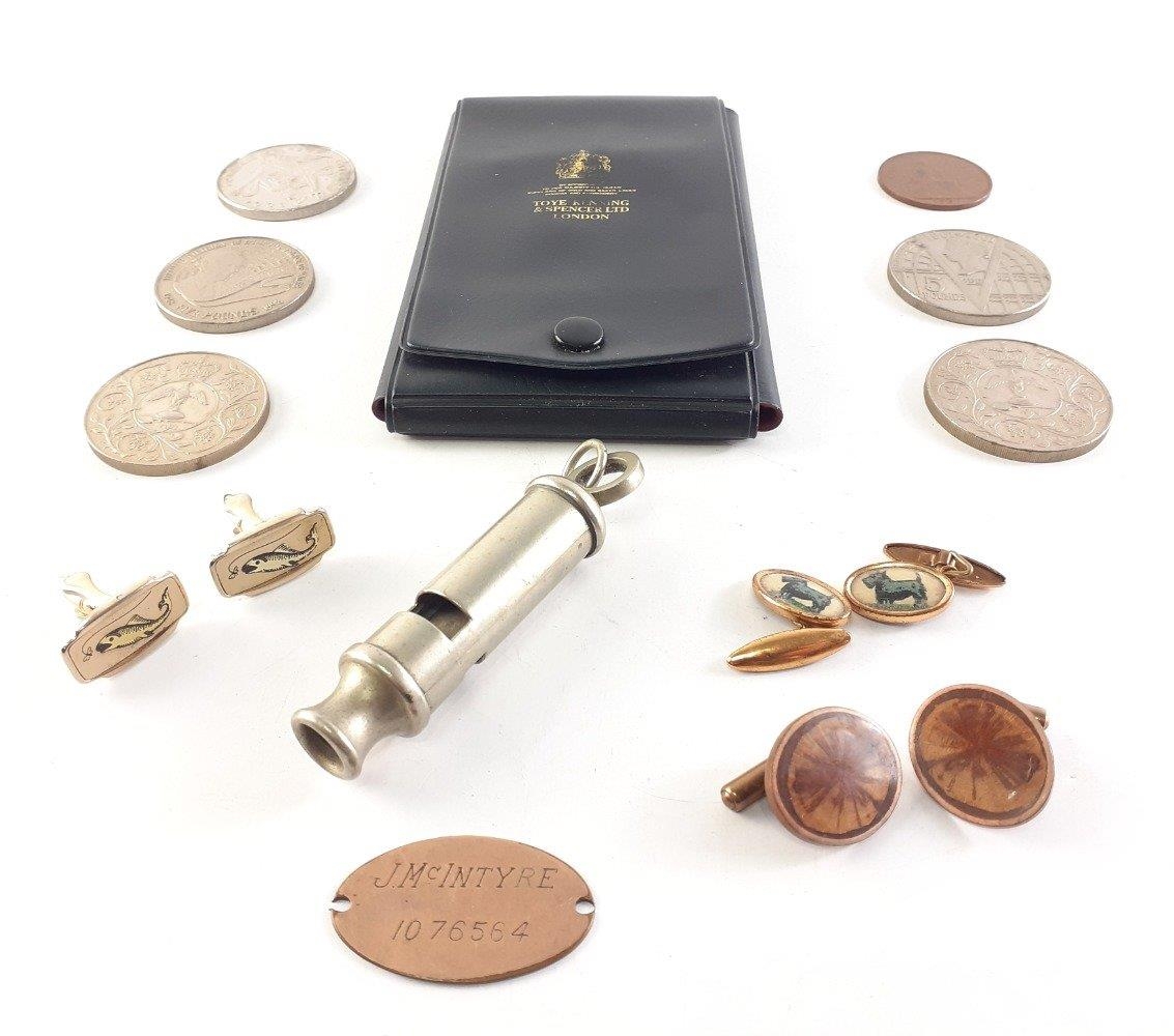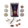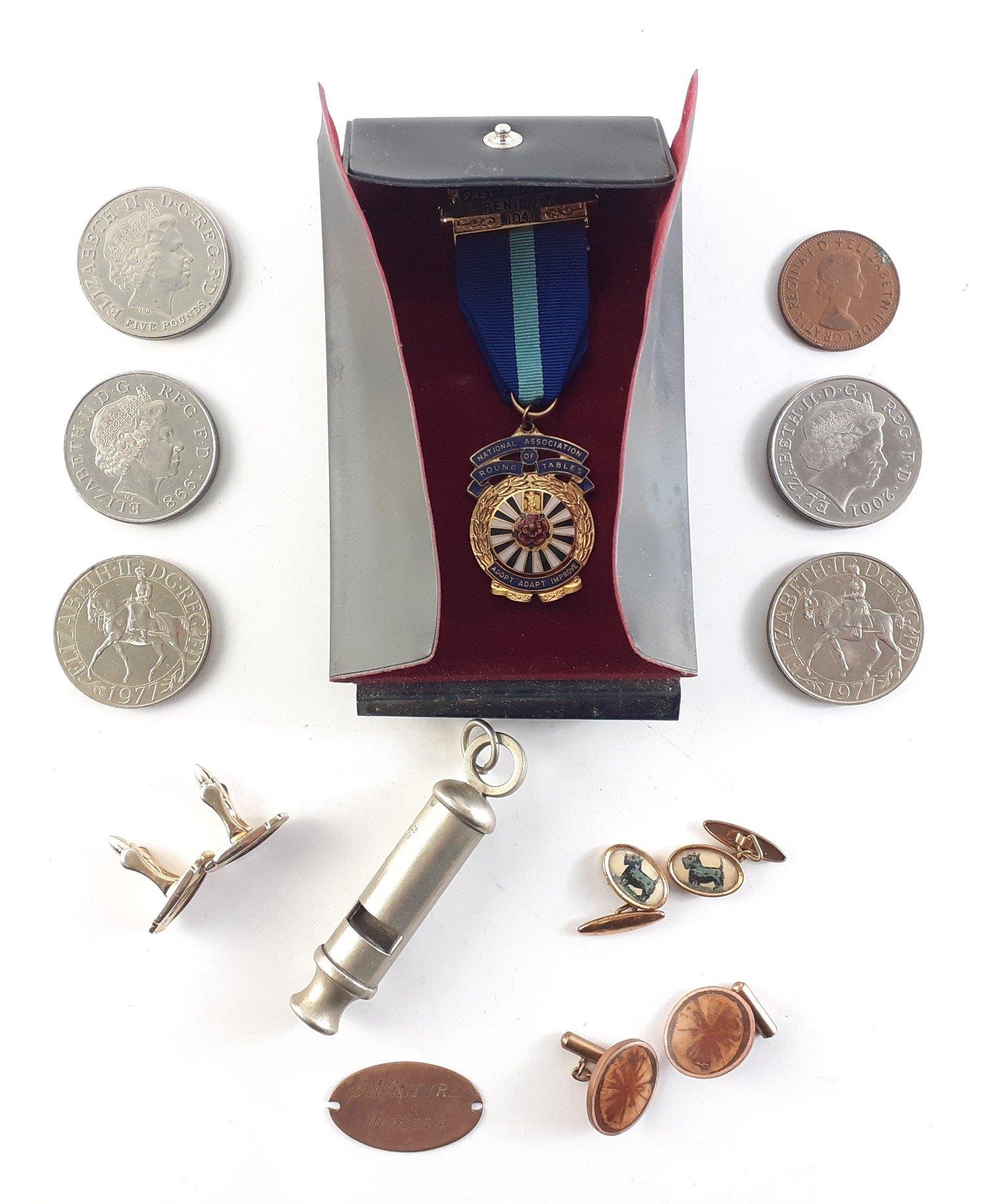 Cased Masonic Jewel, cufflinks, whistle and some Crowns