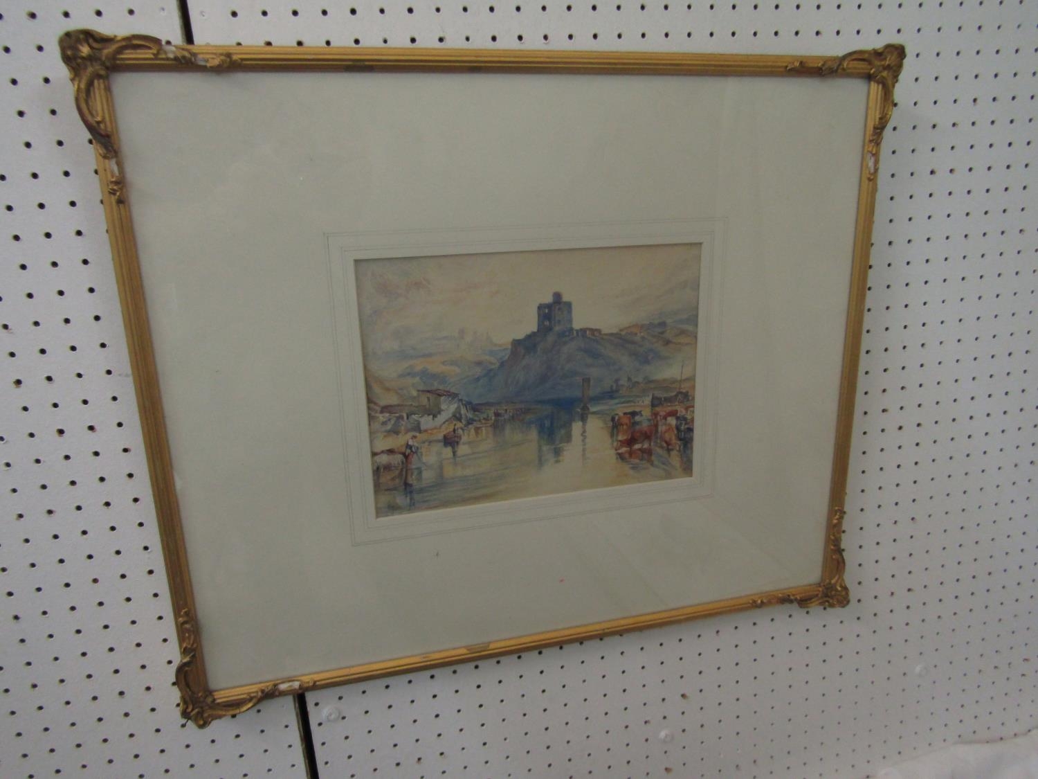 After JMW Turner - Norham Castle, watercolour on paper, signed with initials WCT, 20 x 26.5cm approx in moulded gilt frame