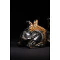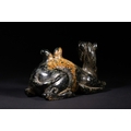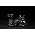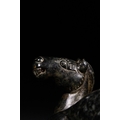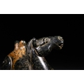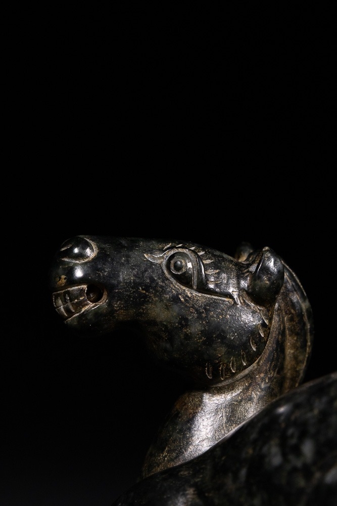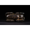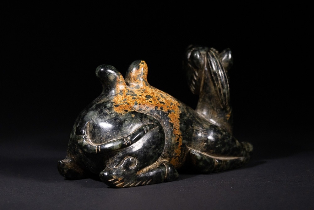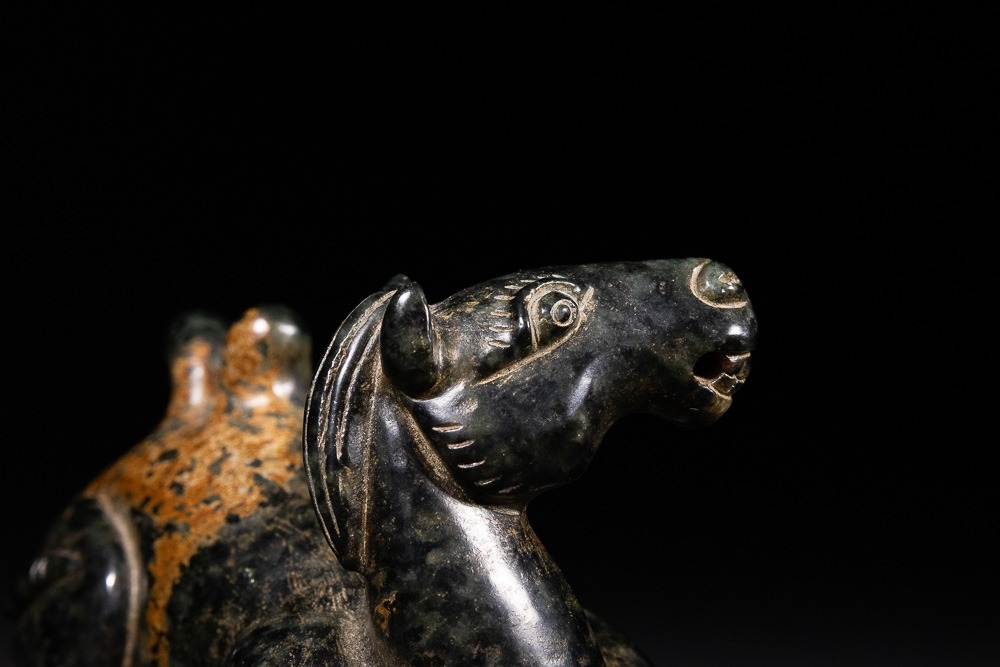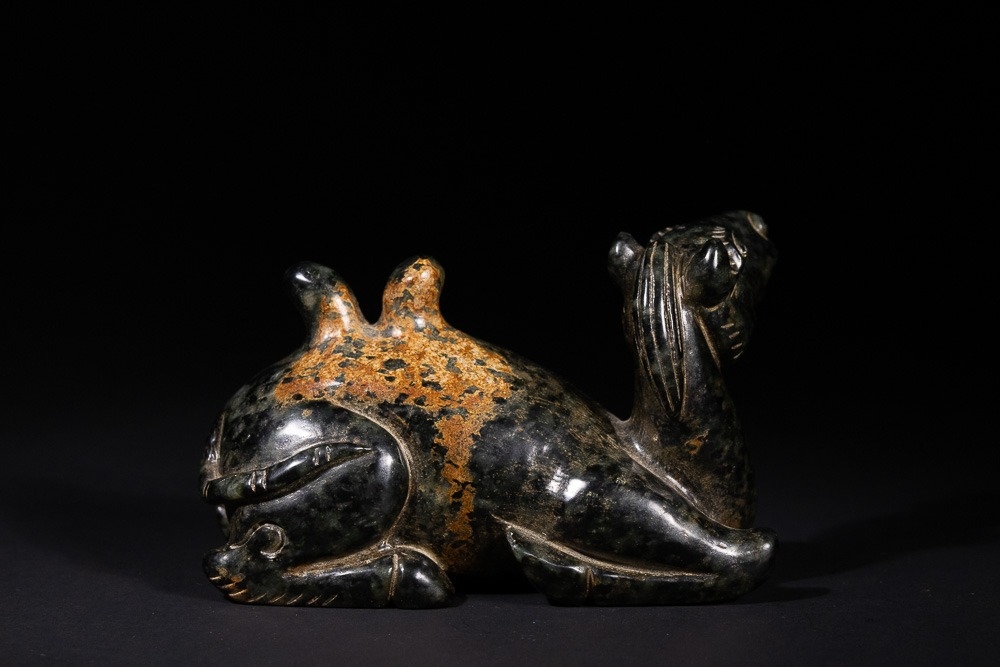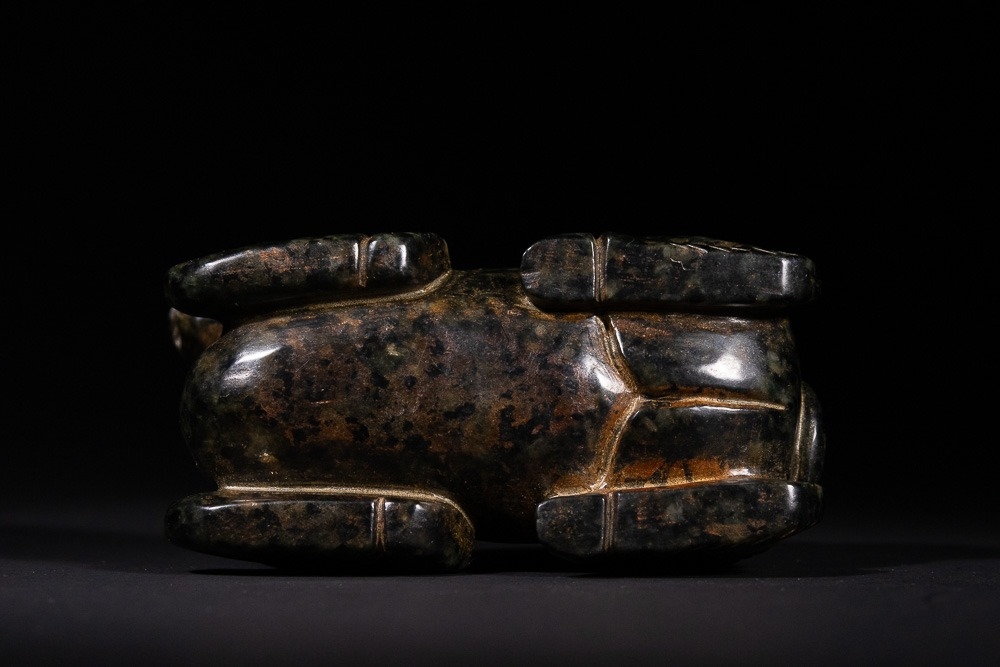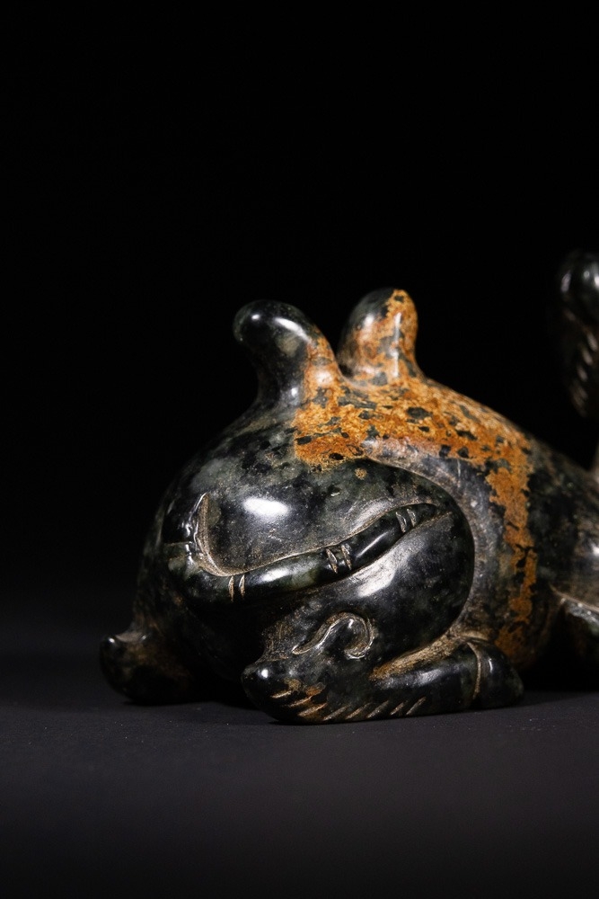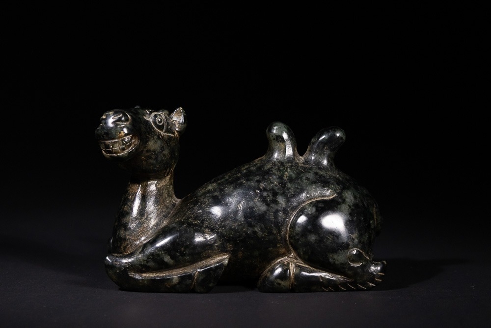 A Chinese Hetian Jade Recumbent Two-Humped Camel - A Chinese Hetian Jade Recumbent Two-Humped Camel. This carved sculptural figure depicts a recumbent two-humped camel, rendered in a stylized, archaic manner. It is crafted from a dark green hardstone, likely jade, exhibiting natural mottled patterns and significant russet and brownish alteration or patination, particularly on its back and sides. The camel features incised details for its mane, eyes, mouth, and hooves, suggesting decorative elements.