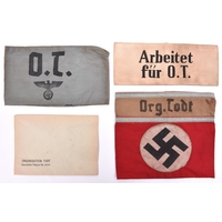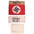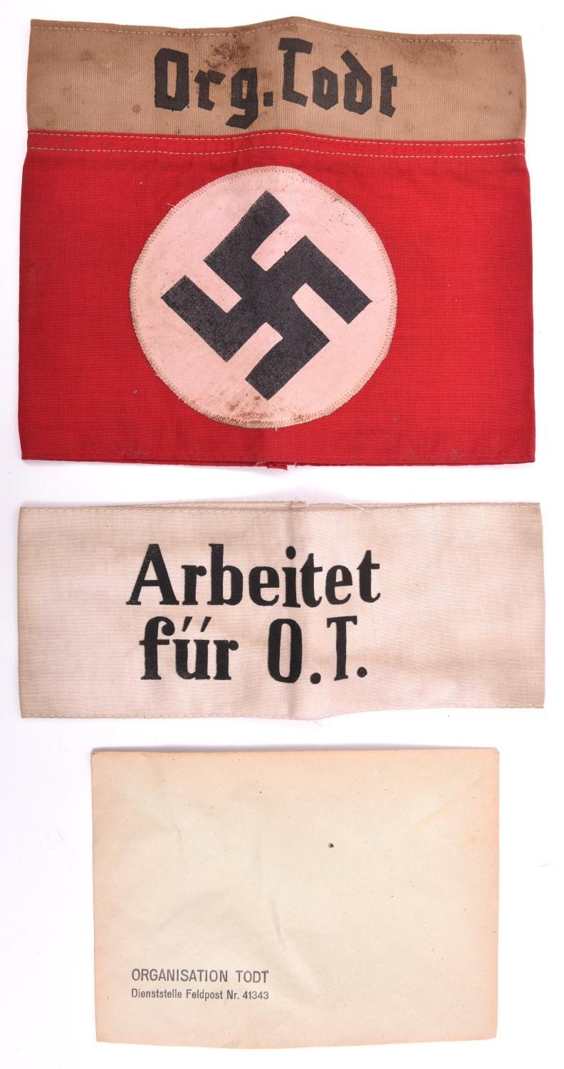 A large Org-Todt armband, party type with khaki named top section; also a white armband printed “Arbeitet Fur O.T.” GC (2) £60-80