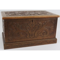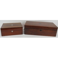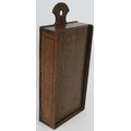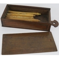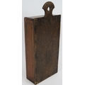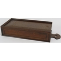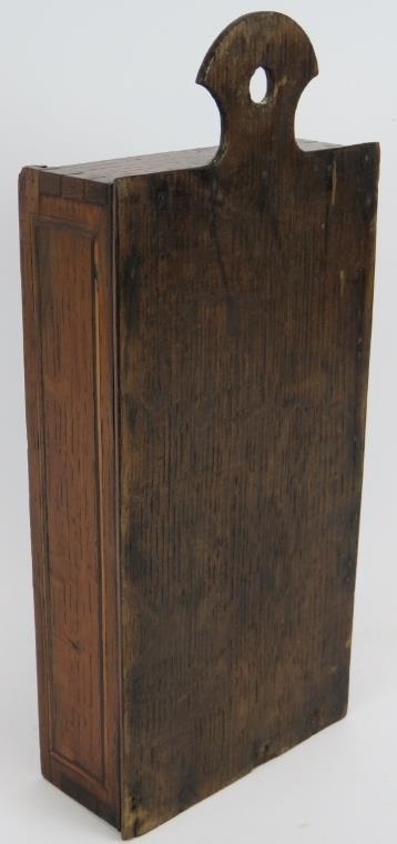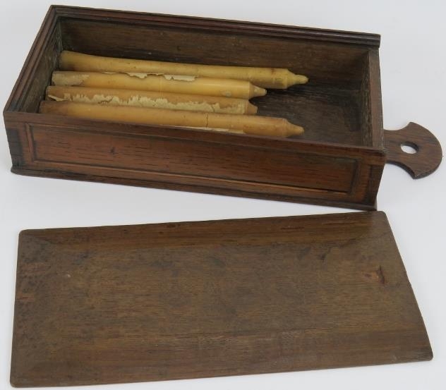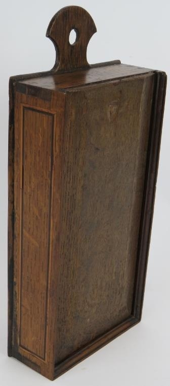 A 19th century oak candle box with inlaid stringing and sliding lid. 16cm x 38cm.