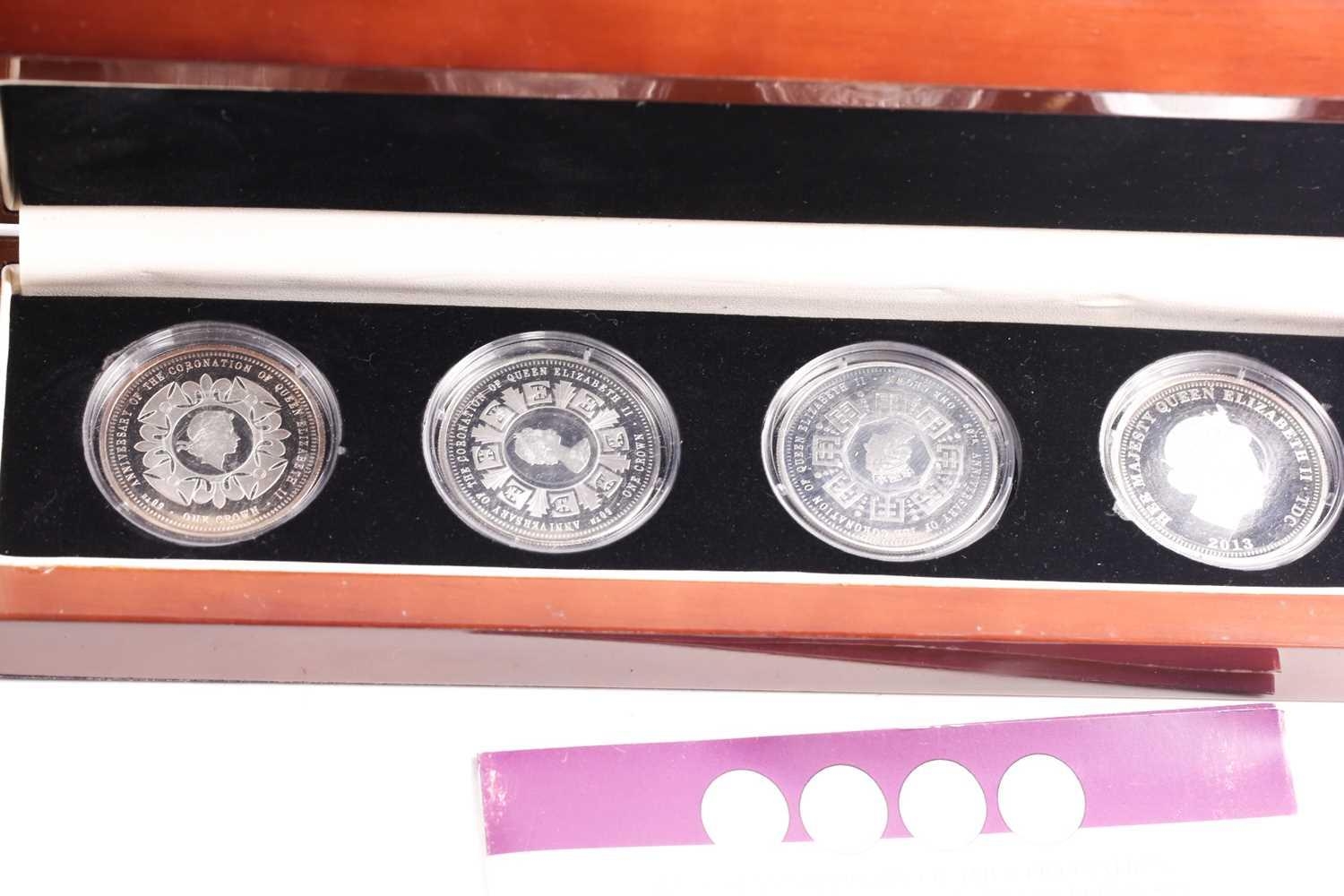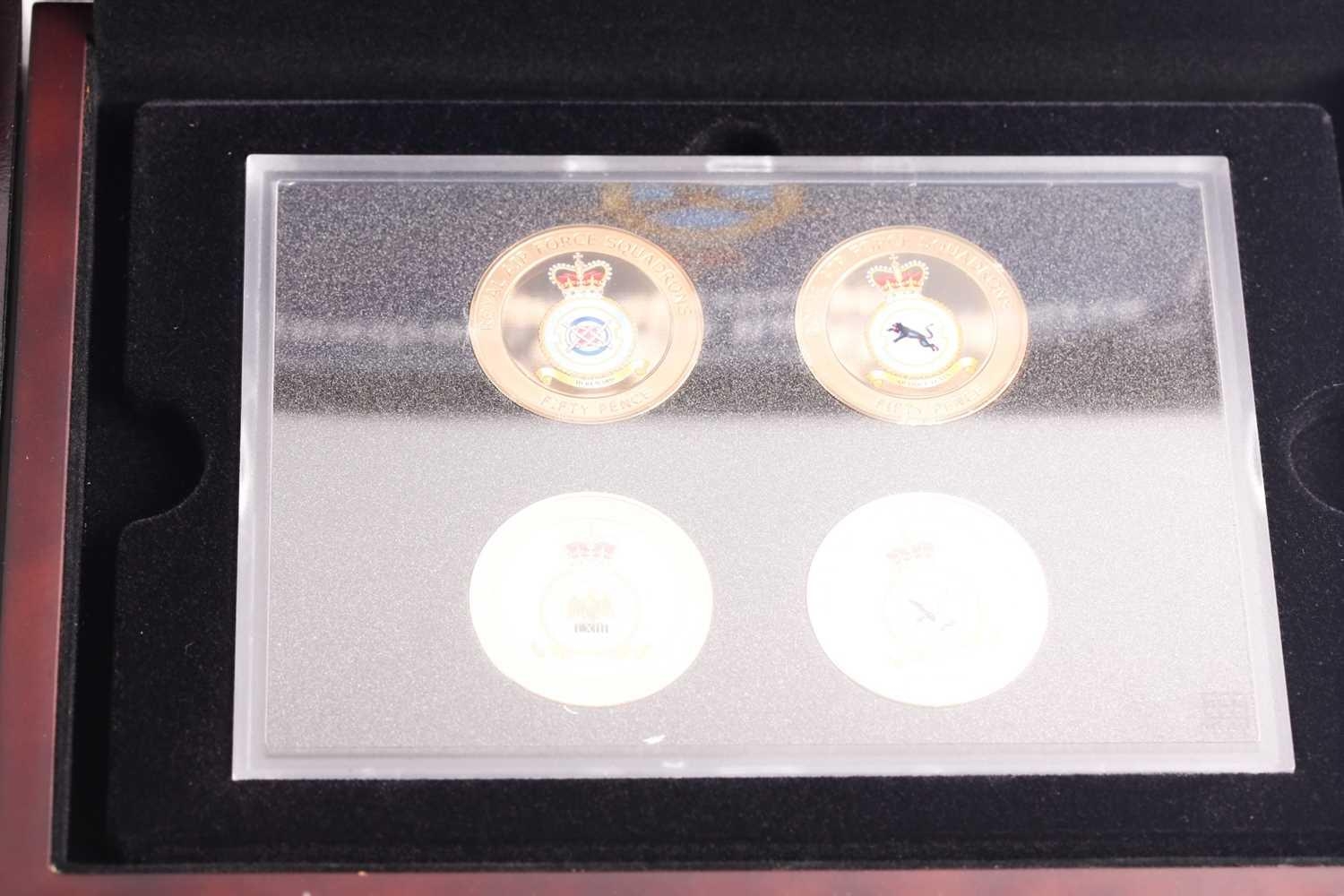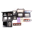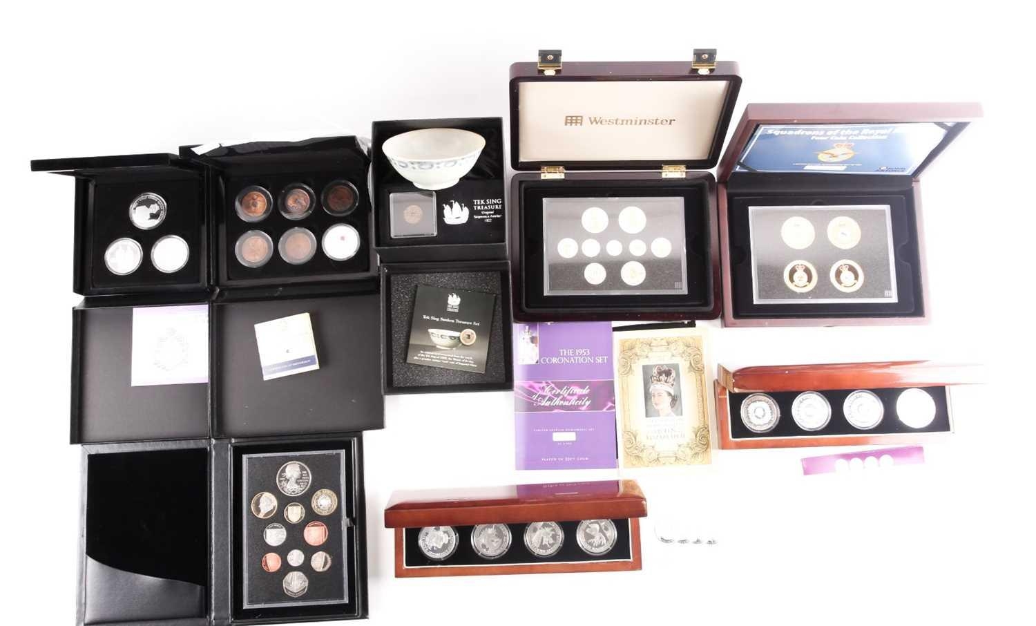 Eight boxed sets of commemorative coins, comprising: 'Squadrons of the Royal Air Force' four-coin set (2013, 15/995 issued), Westminster 1953 Coronation Set, London Office Mint Heraldic Beasts Pure Silver Crown Set, 60th Anniversary of the Coronation (QEII) Pure Silver Crown Set, Royal Mint 2012 United Kingdom Proof Set, Bradford Exchange Armistice Day Silver Crown and Five WWI Pennies, Bradford Exchange QEII 88th Birthday Silver Crown Set and Tek Sing Sunken Treasure Set (1822 Shipwreck Artefact).