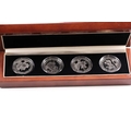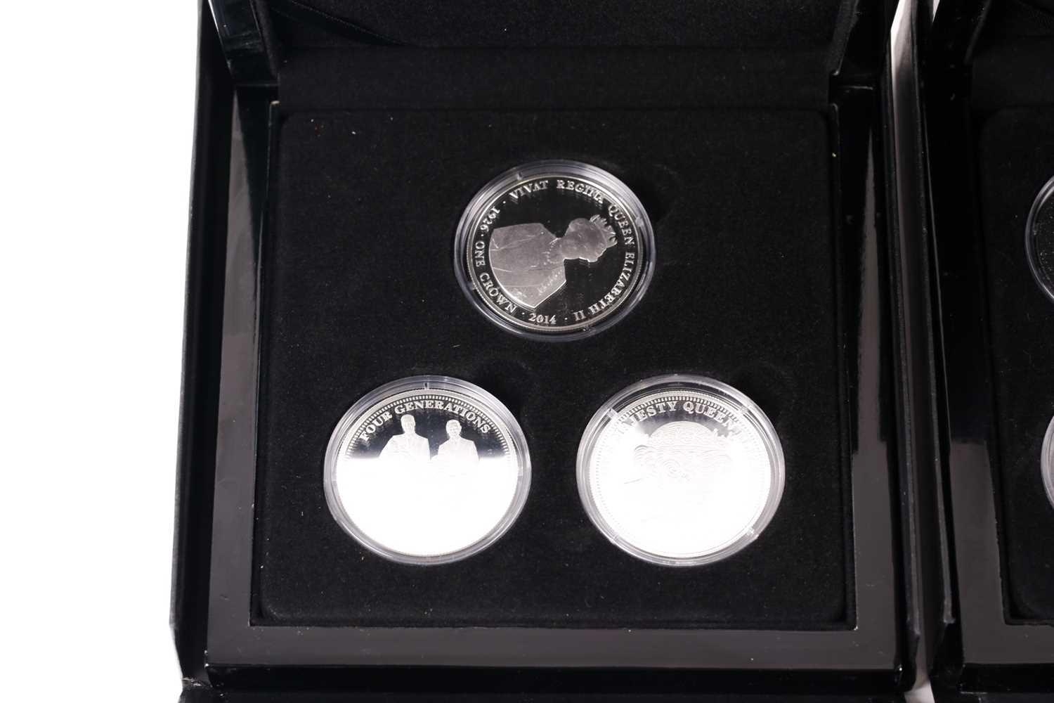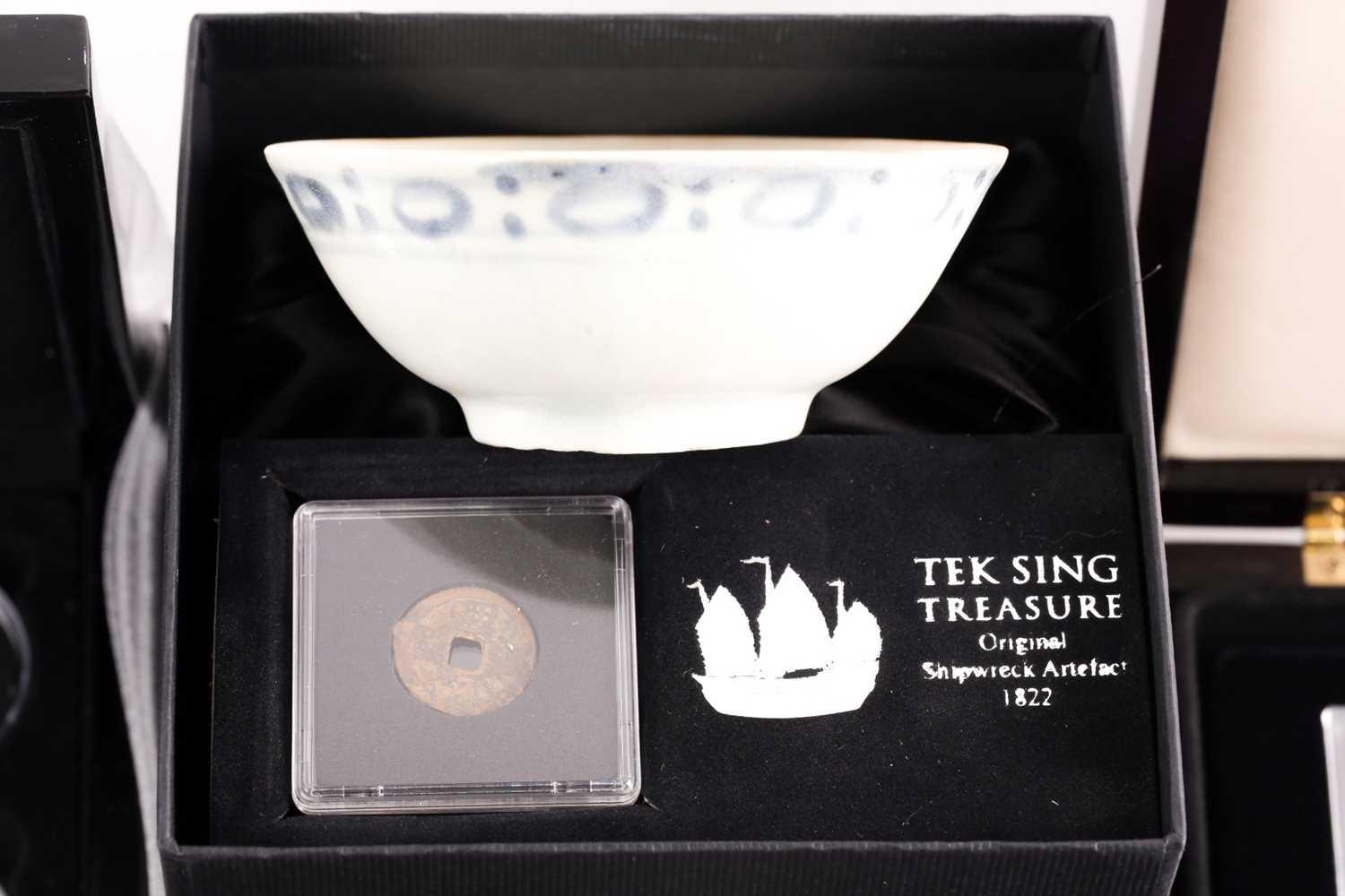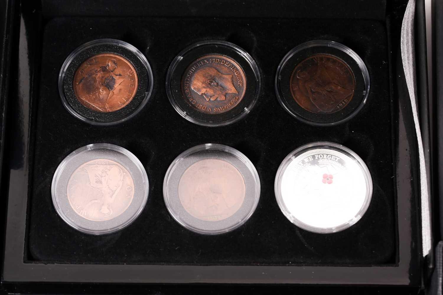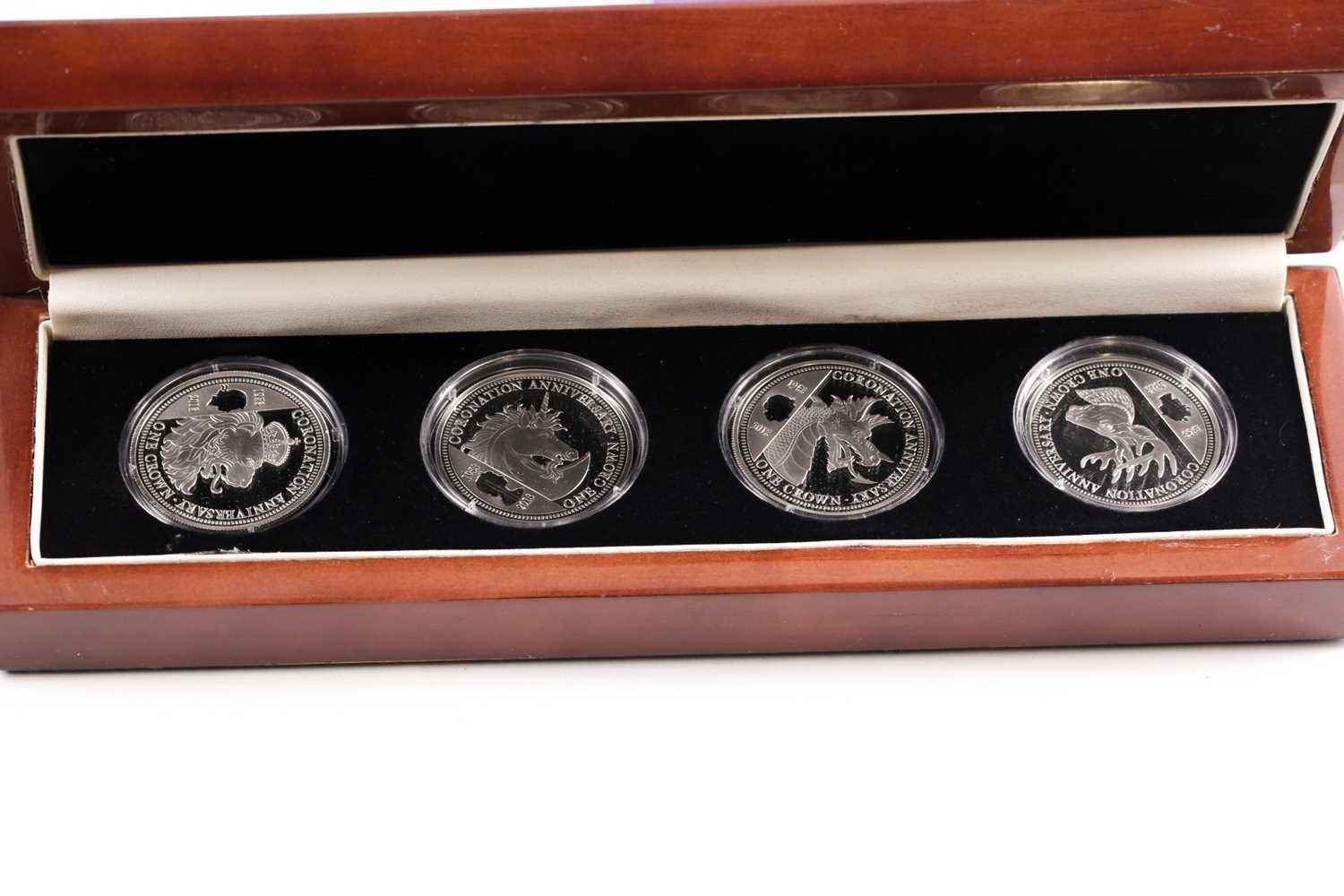Eight boxed sets of commemorative coins, comprising: 'Squadrons of the Royal Air Force' four-coin set (2013, 15/995 issued), Westminster 1953 Coronation Set, London Office Mint Heraldic Beasts Pure Silver Crown Set, 60th Anniversary of the Coronation (QEII) Pure Silver Crown Set, Royal Mint 2012 United Kingdom Proof Set, Bradford Exchange Armistice Day Silver Crown and Five WWI Pennies, Bradford Exchange QEII 88th Birthday Silver Crown Set and Tek Sing Sunken Treasure Set (1822 Shipwreck Artefact).