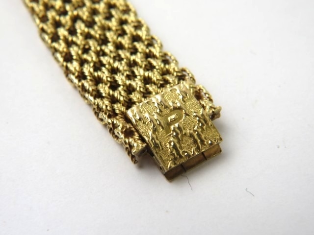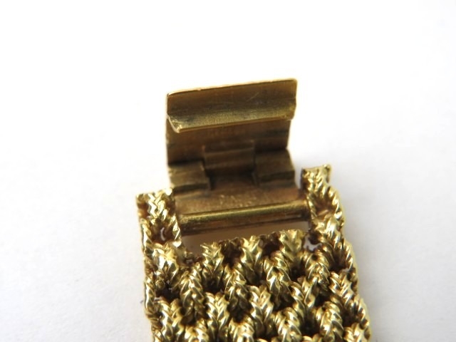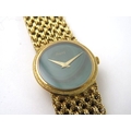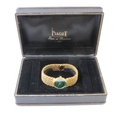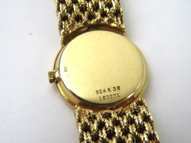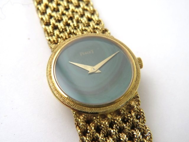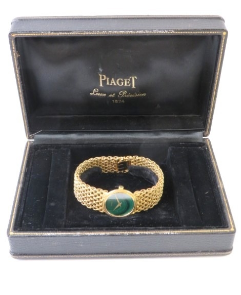 A vintage PIAGET ladies' 18ct yellow gold mechanical wind slim wristwatch with malachite dial, on an articulated woven 18ct gold bracelet strap, clasp stamped ‘P’ Piaget 750 MODE DEPOSE’ , case no. 924N38 183271’ Swiss pincoin, approx. 55.8g. With original fitted box and provenance history of the watch available to view.