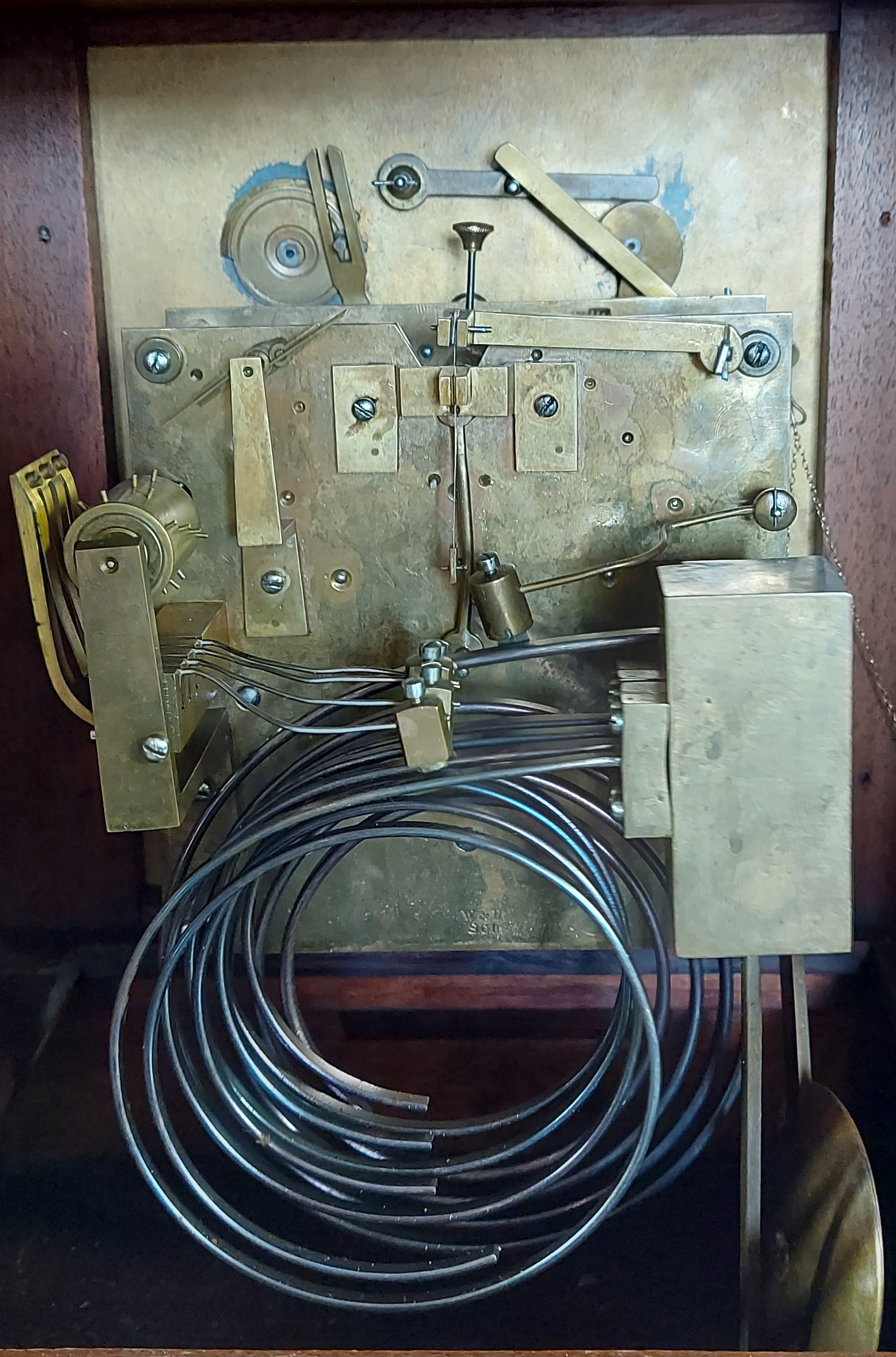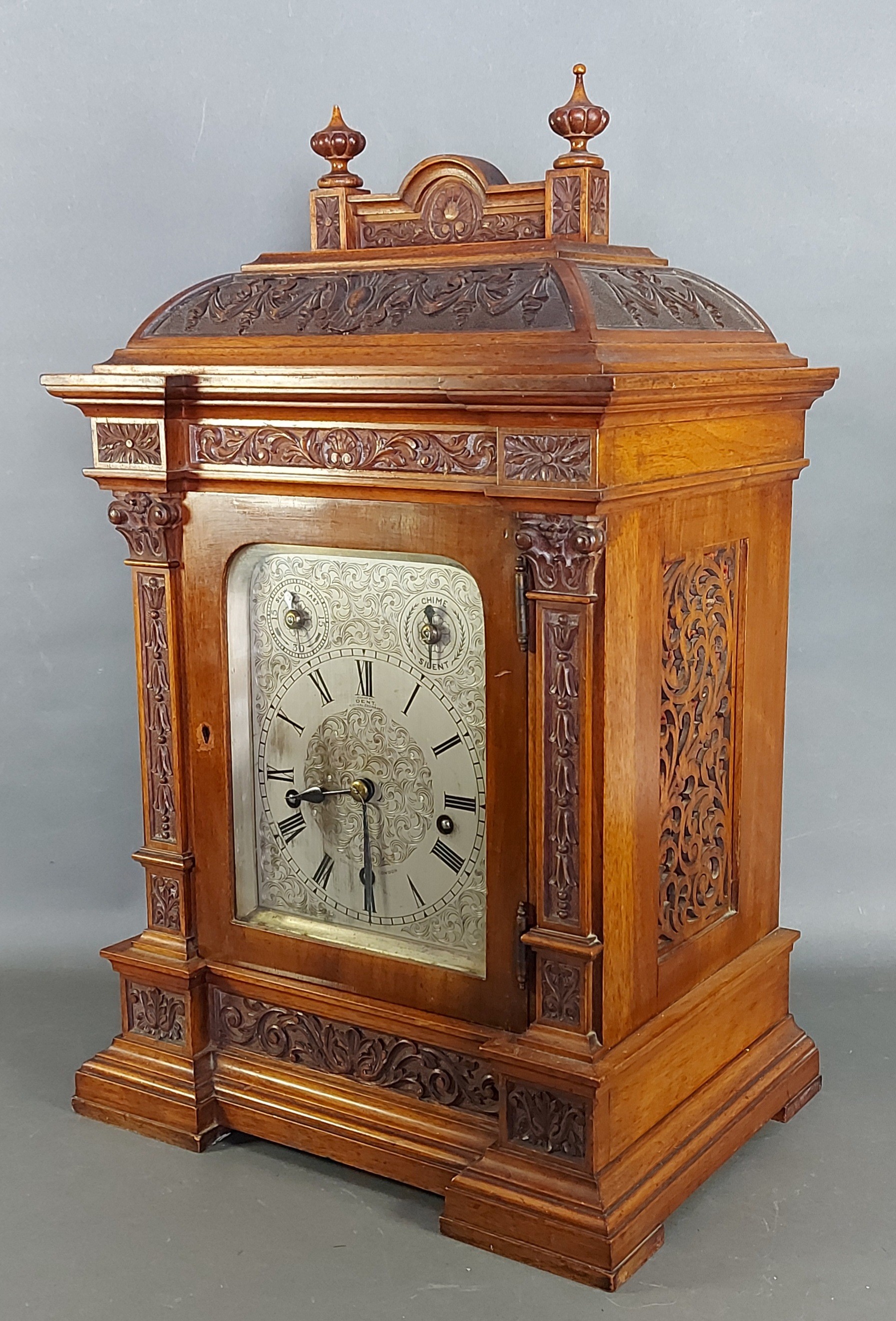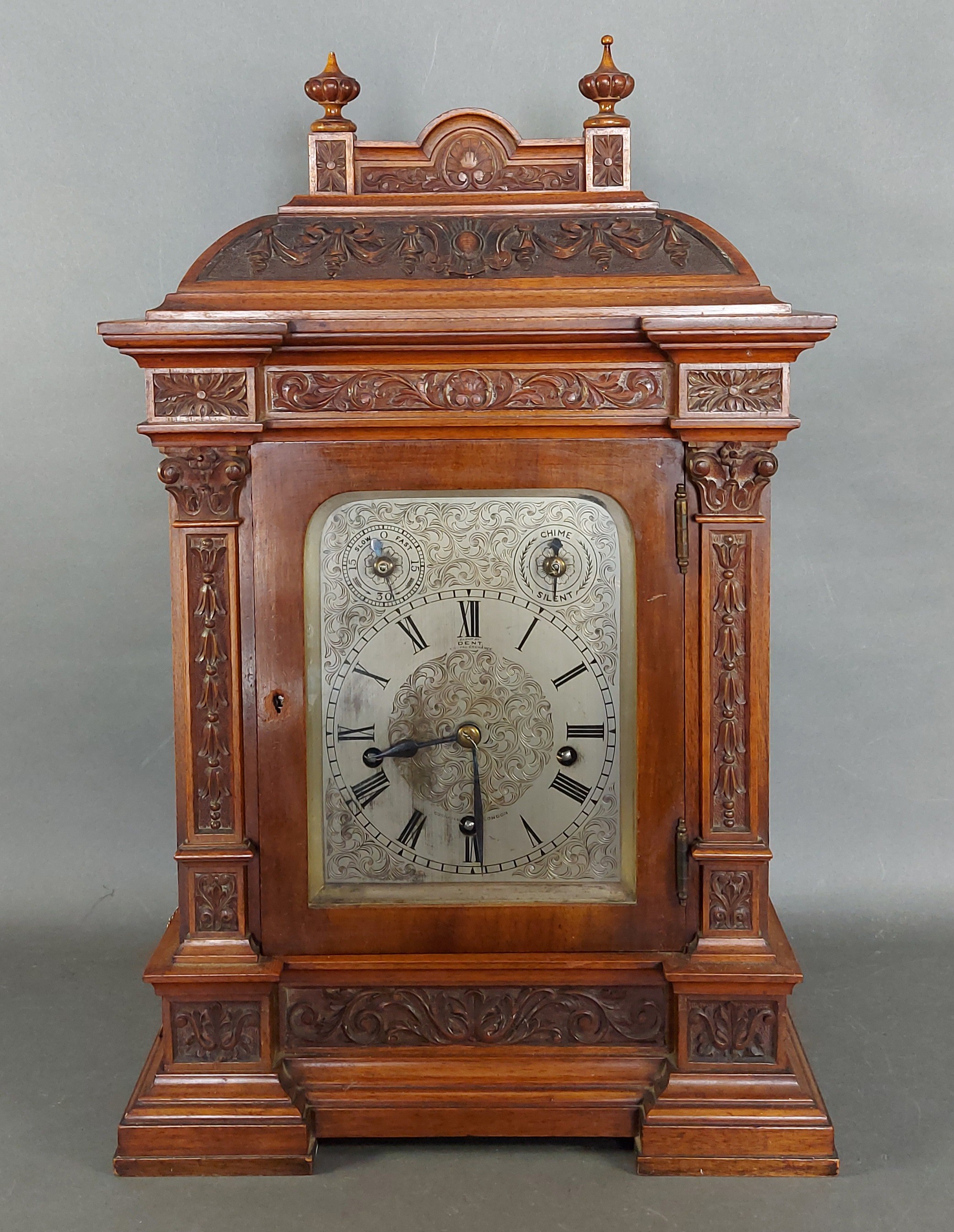 A late Victorian mantle clock, the silvered dial inscribed Dent, Royal Exchange, Cornhill London, with three train musical movement, subsidiary strike silent and slow fast dials, 52cms tall