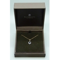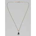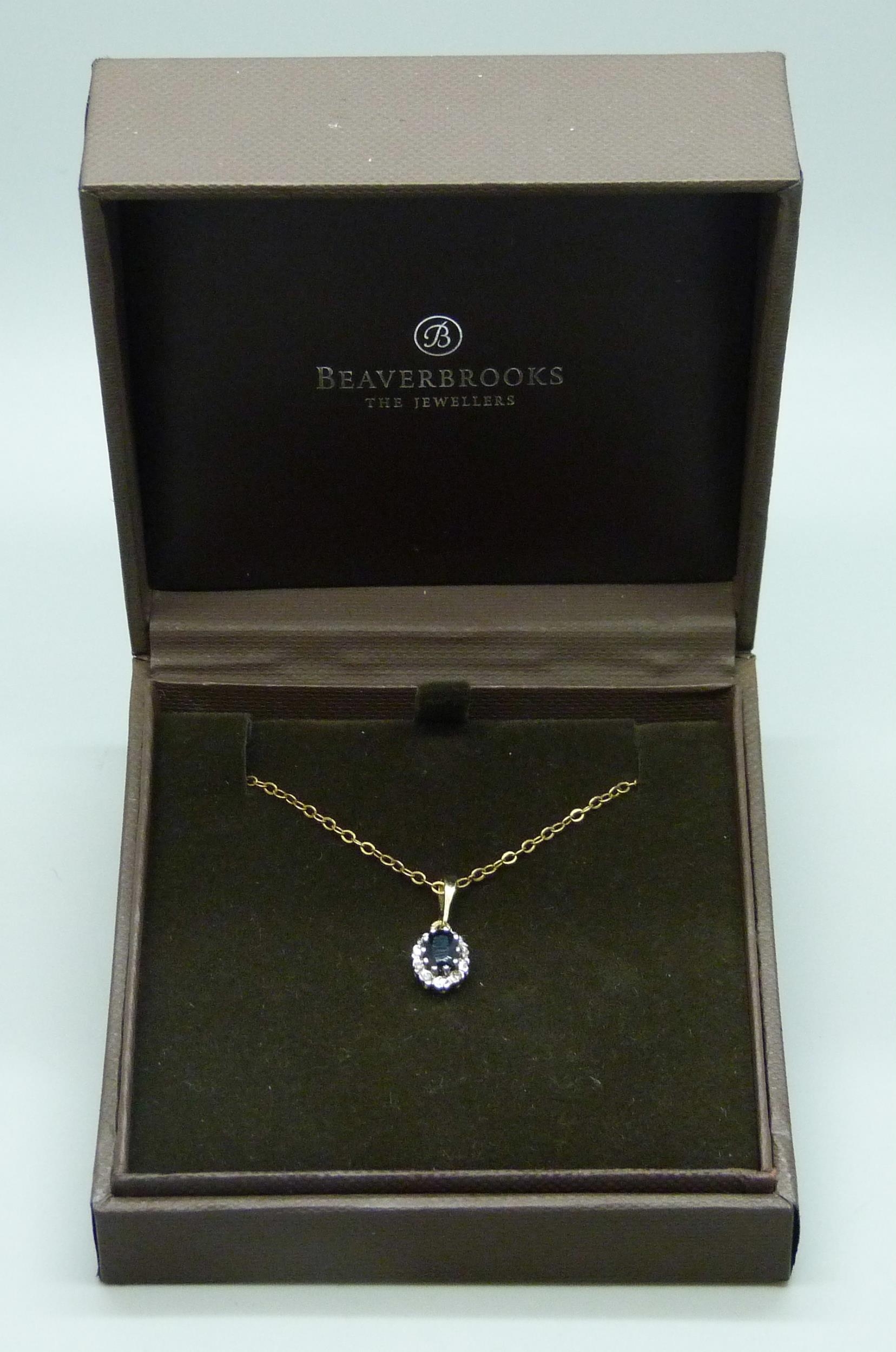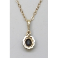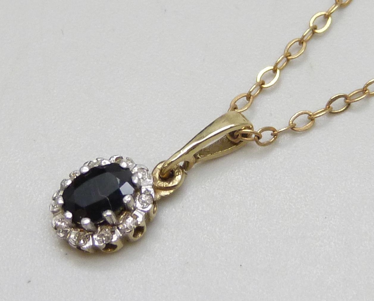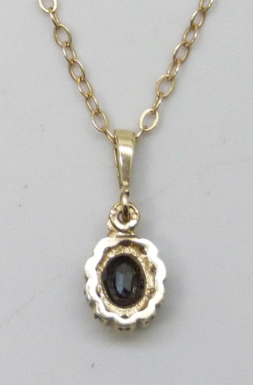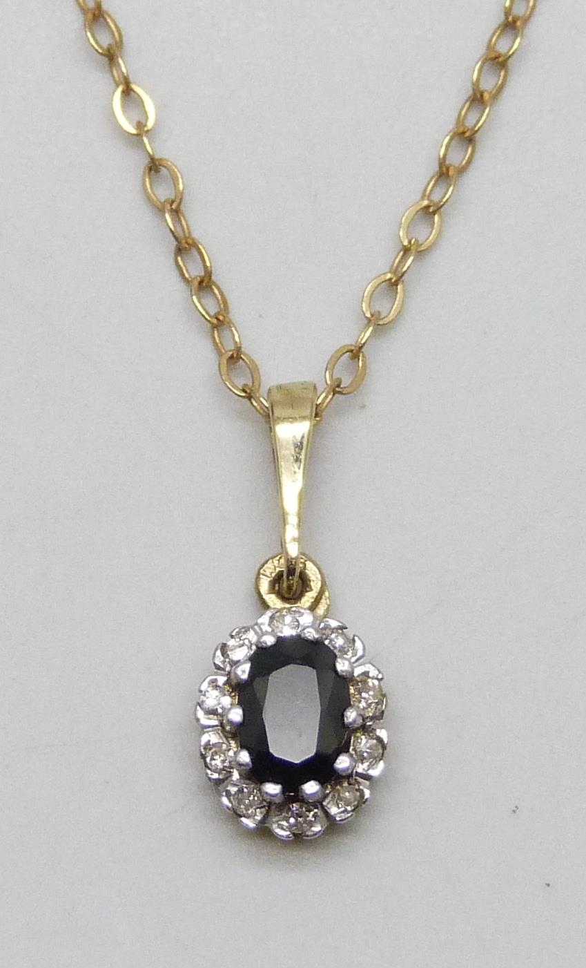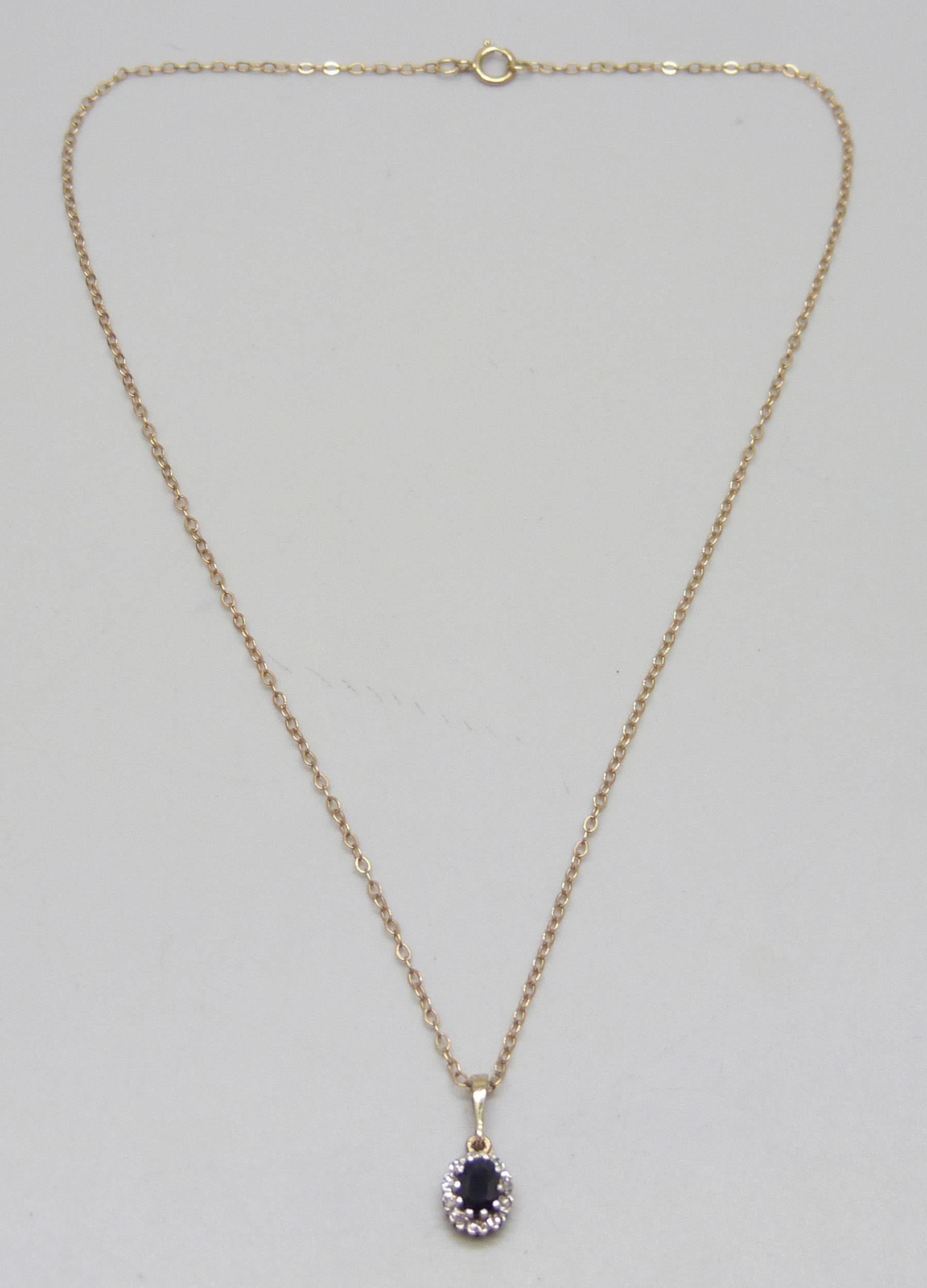 A 9ct gold, sapphire and diamond cluster pendant on a 9ct gold necklace chain (repair to clasp), 1.9g total, pendant 1.8cm including bail