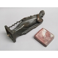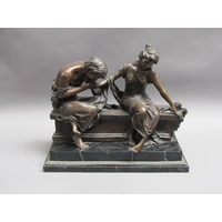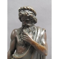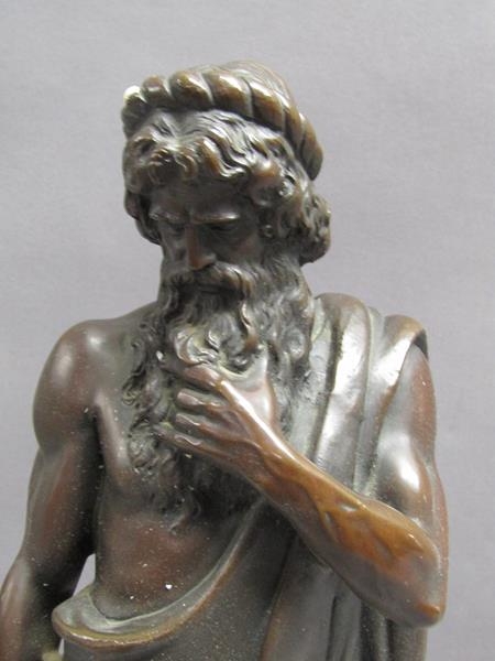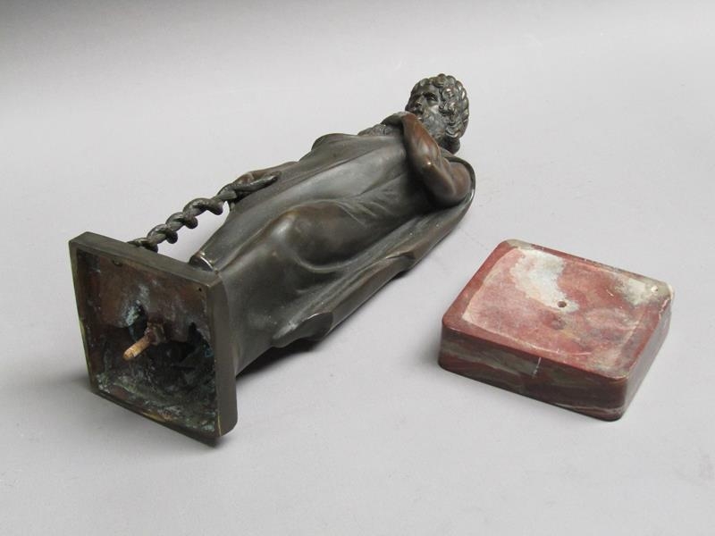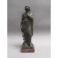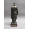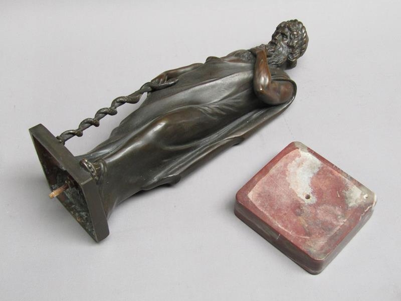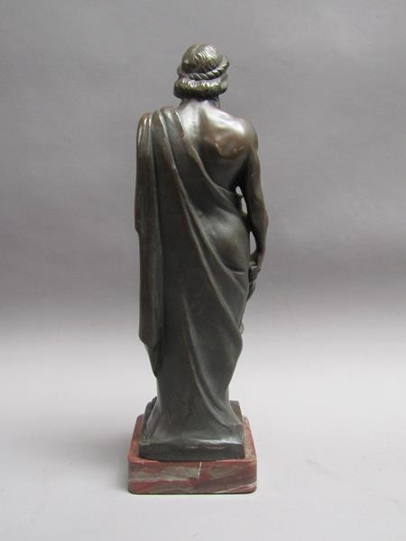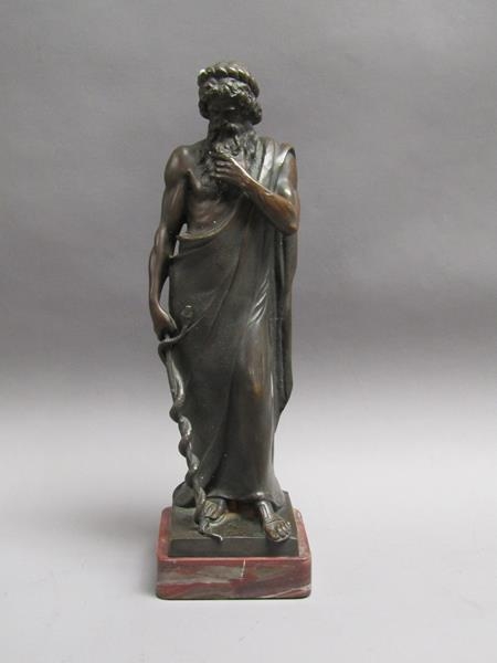 A patinated bronze figure of a robed ancient Asciepius (God of medicine), with the rod of Asciepues in his right hand, signed 'F.Jeffland?' and supported on a ruby red vein marble base, bronze 39cm h, overall 42cm h.