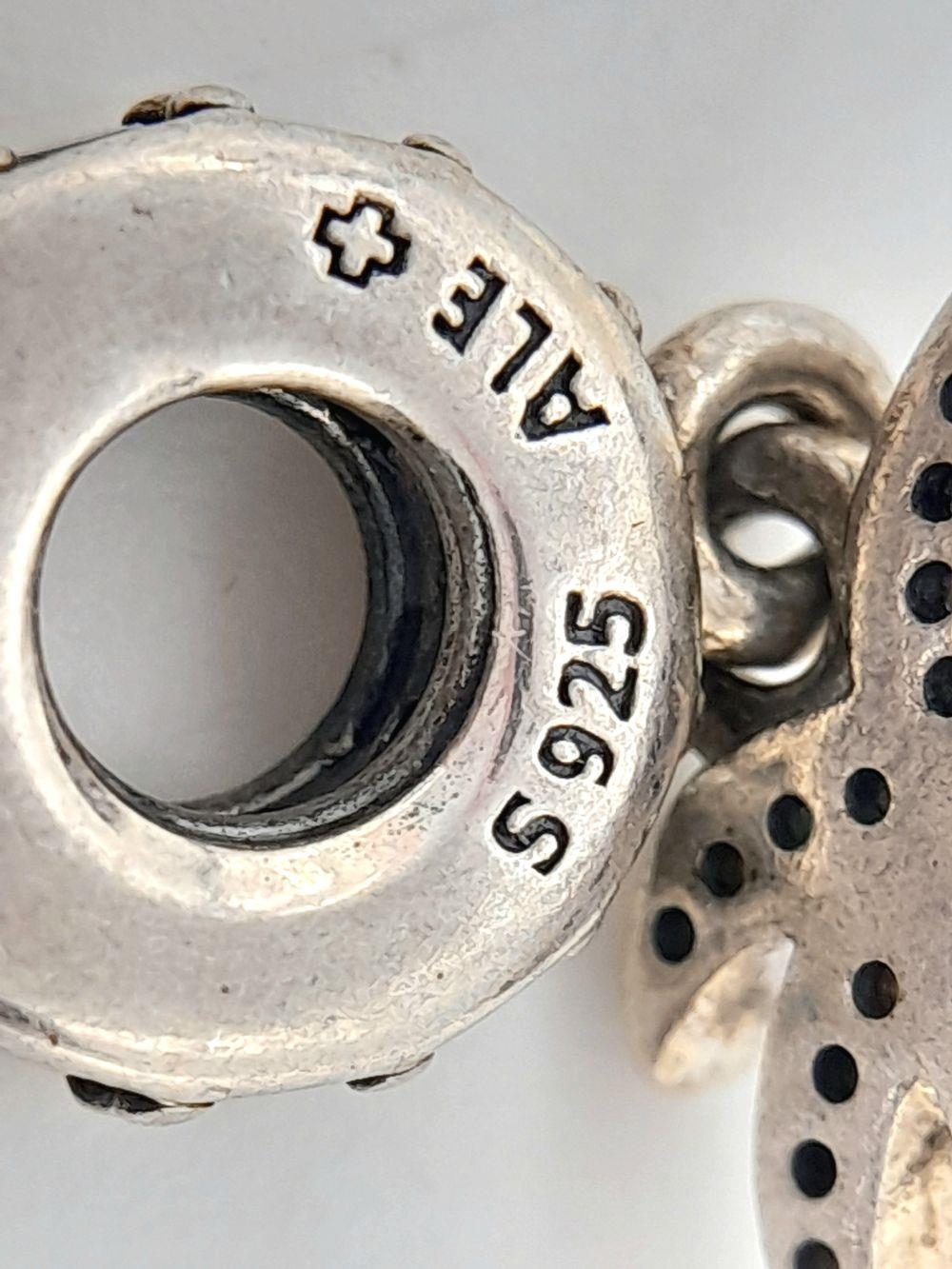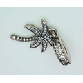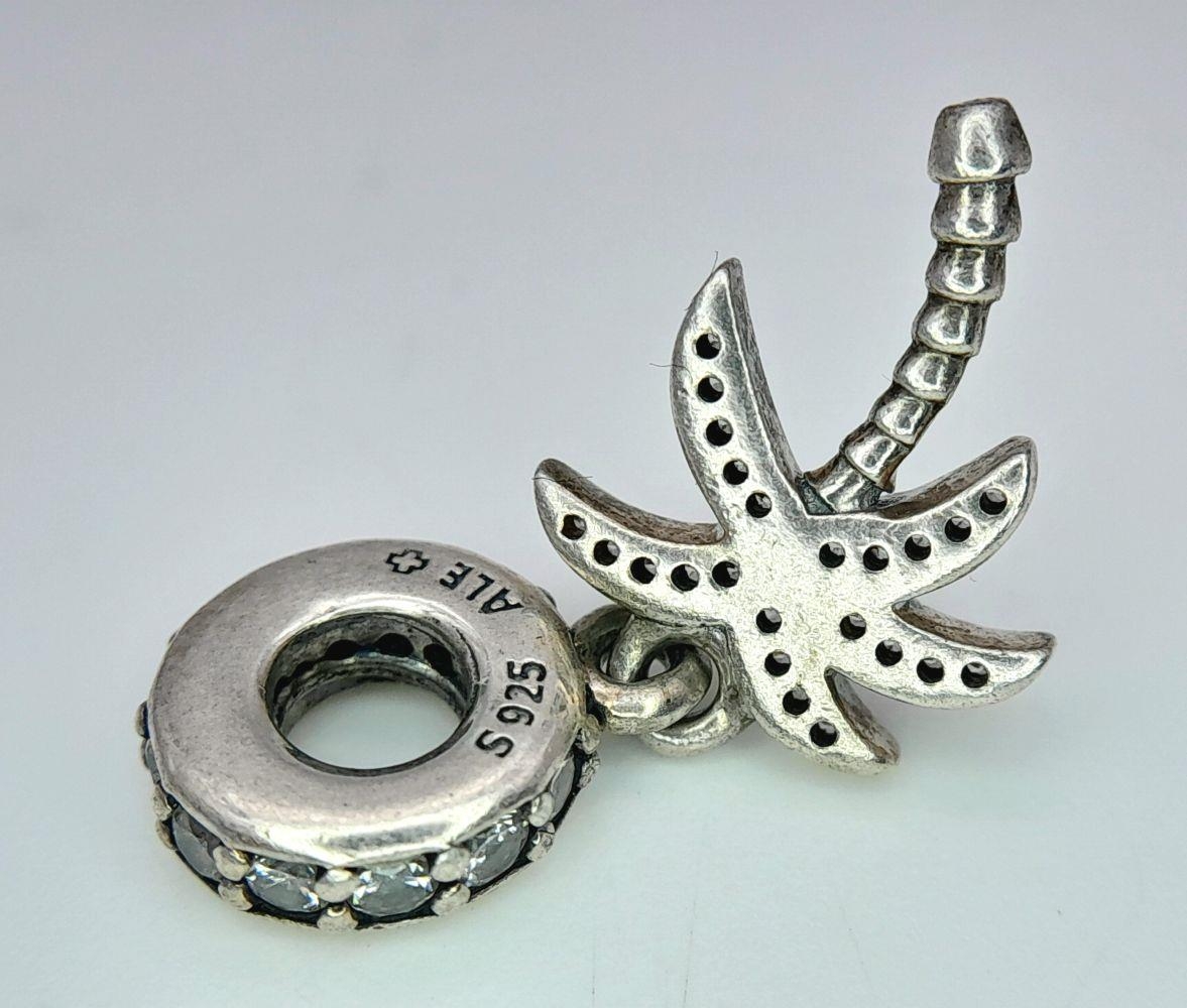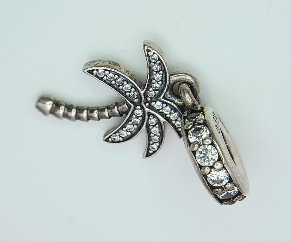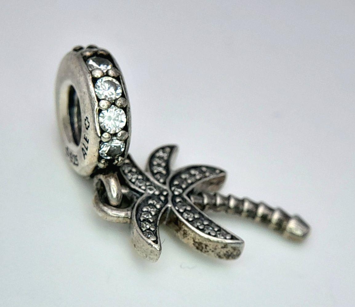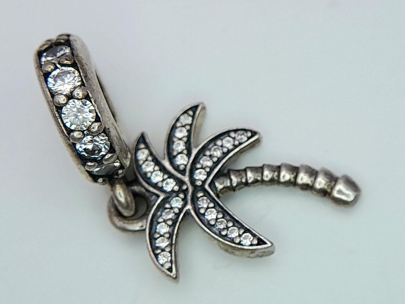 A PANDORA STERLING SILVER STONE SET PALM TREE DANGLE CHARM 2.6G TOTAL WEIGHT, 2.5CM x 1CM. Ref: SC 8034