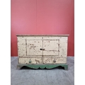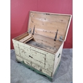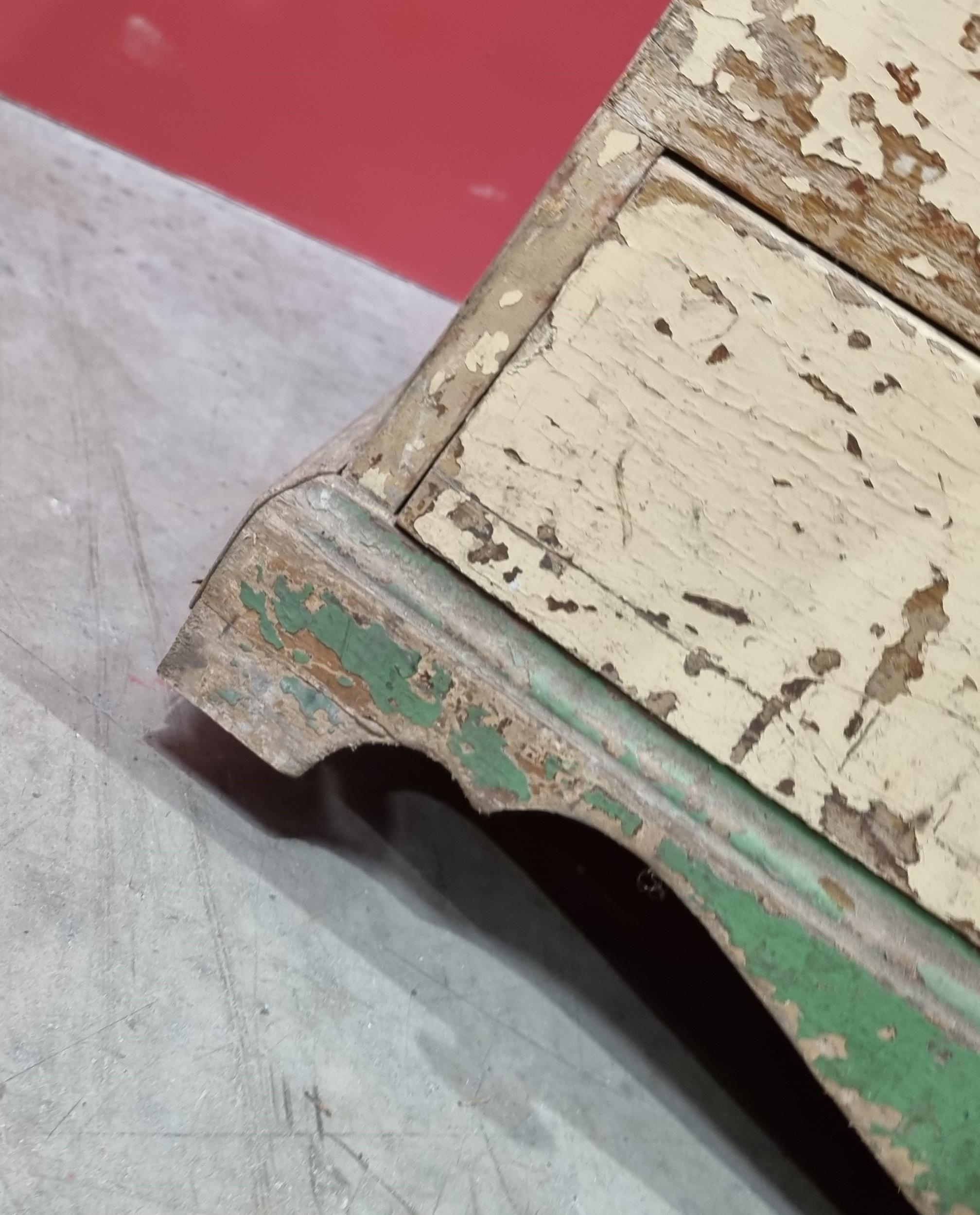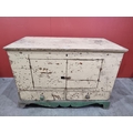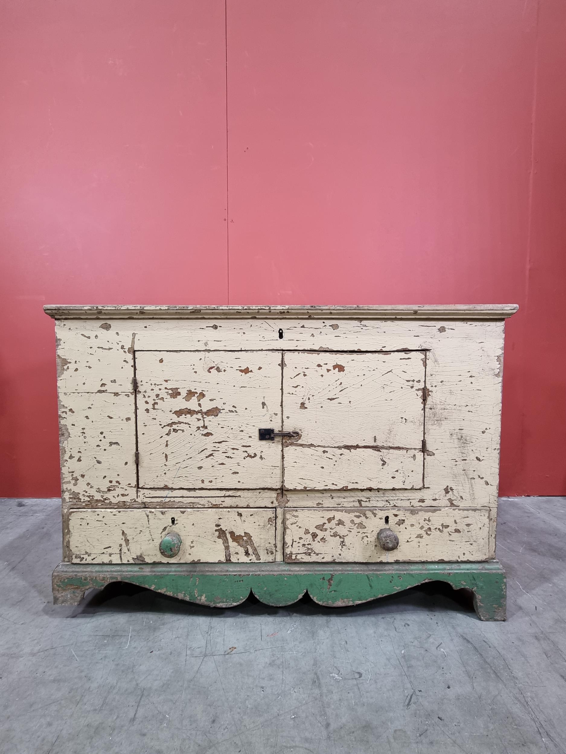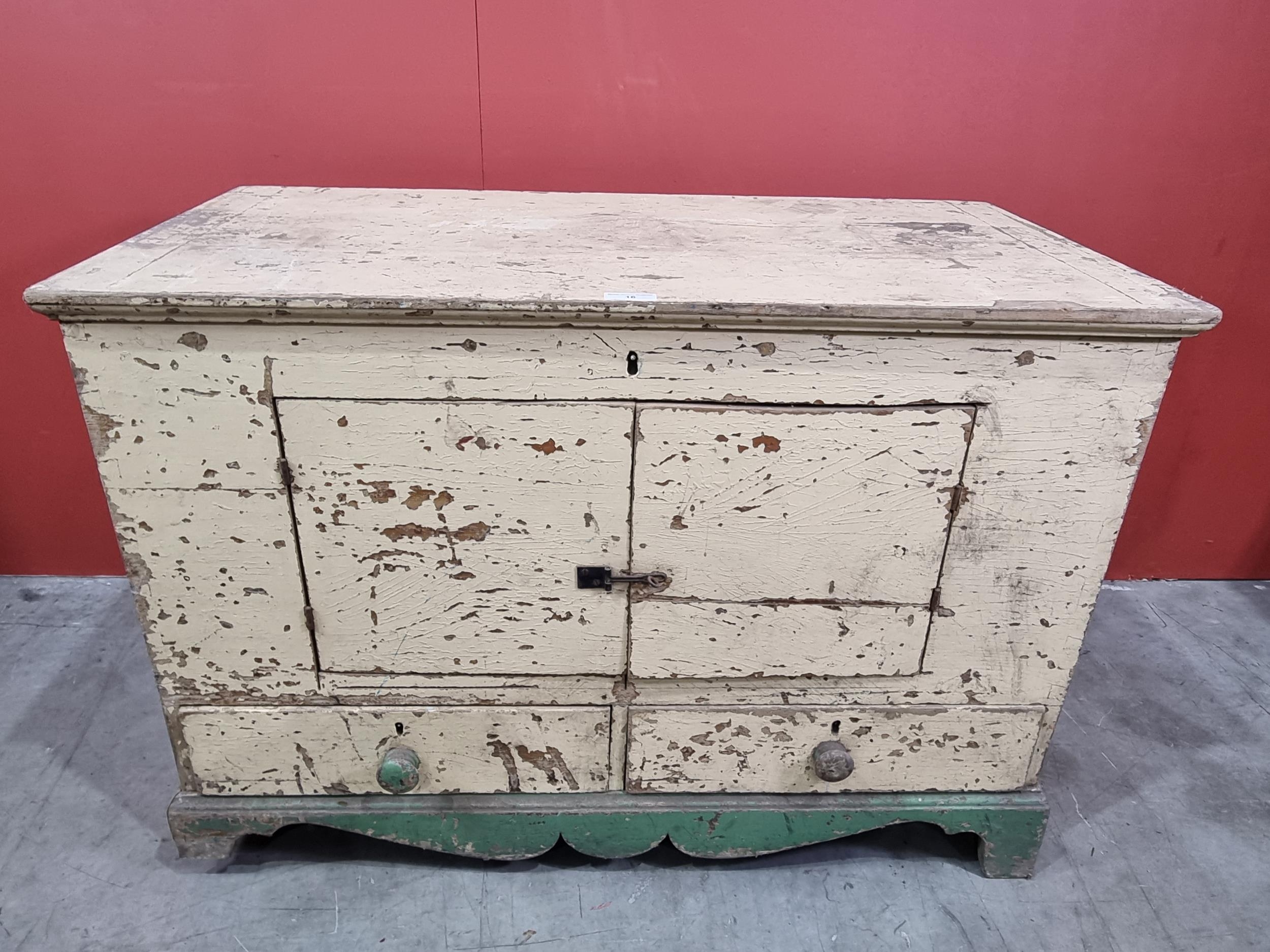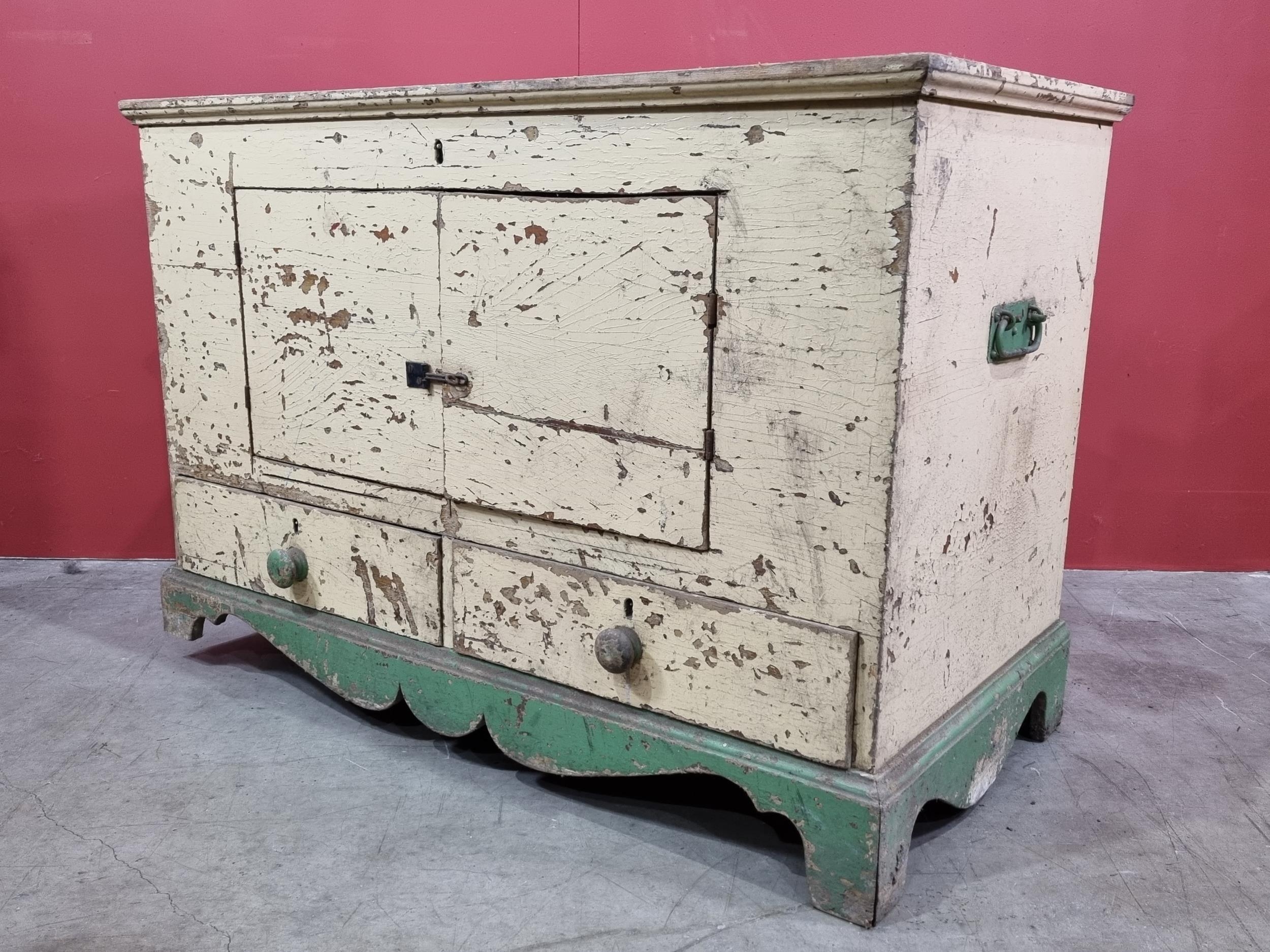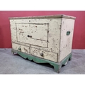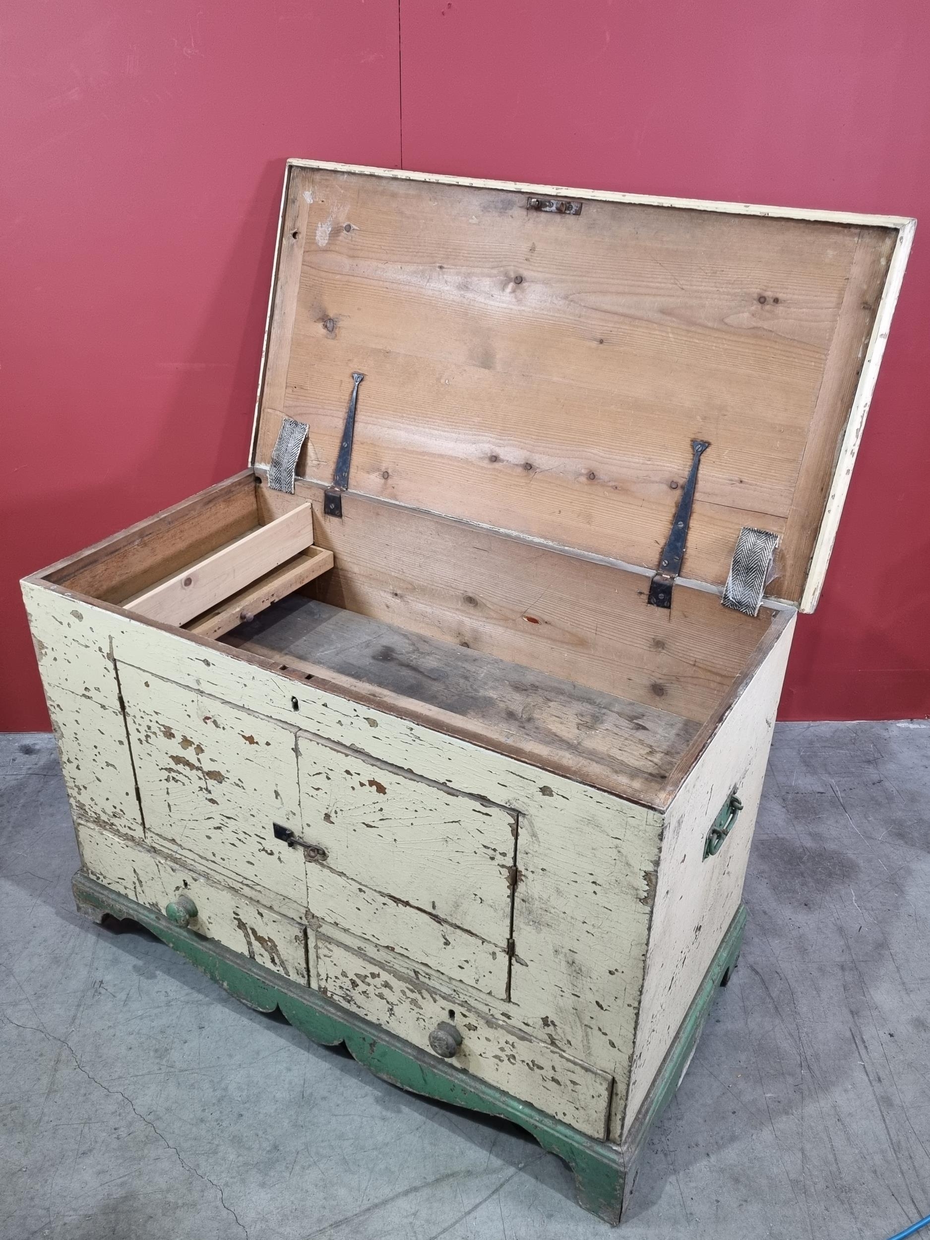 A cream and green painted pine Mule Chest, the lift up lid enclosing candle box and fitted drawer, the front with later converted doors, above pair of fitted drawers to base and raised on shaped supports, 28in High x 3ft 5in Wide x 21in Deep.