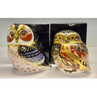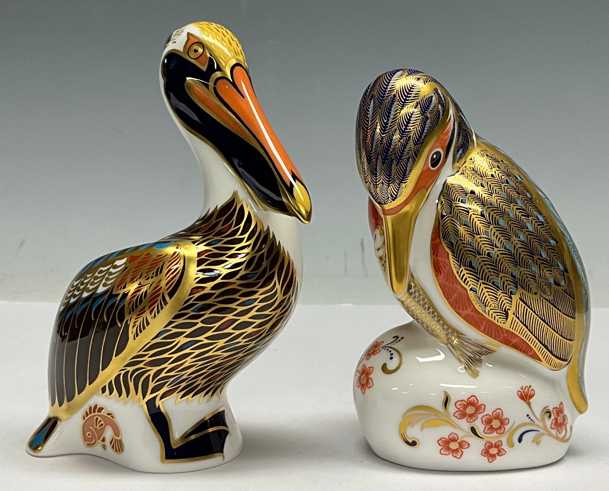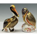 A Royal Crown Derby paperweight, Hadleigh Brown Pelican, special 20th anniversary limited edition of 500, gold stopper, 12.5cm high, printed mark in red; another, Kingfisher, gold stopper, printed mark (2)