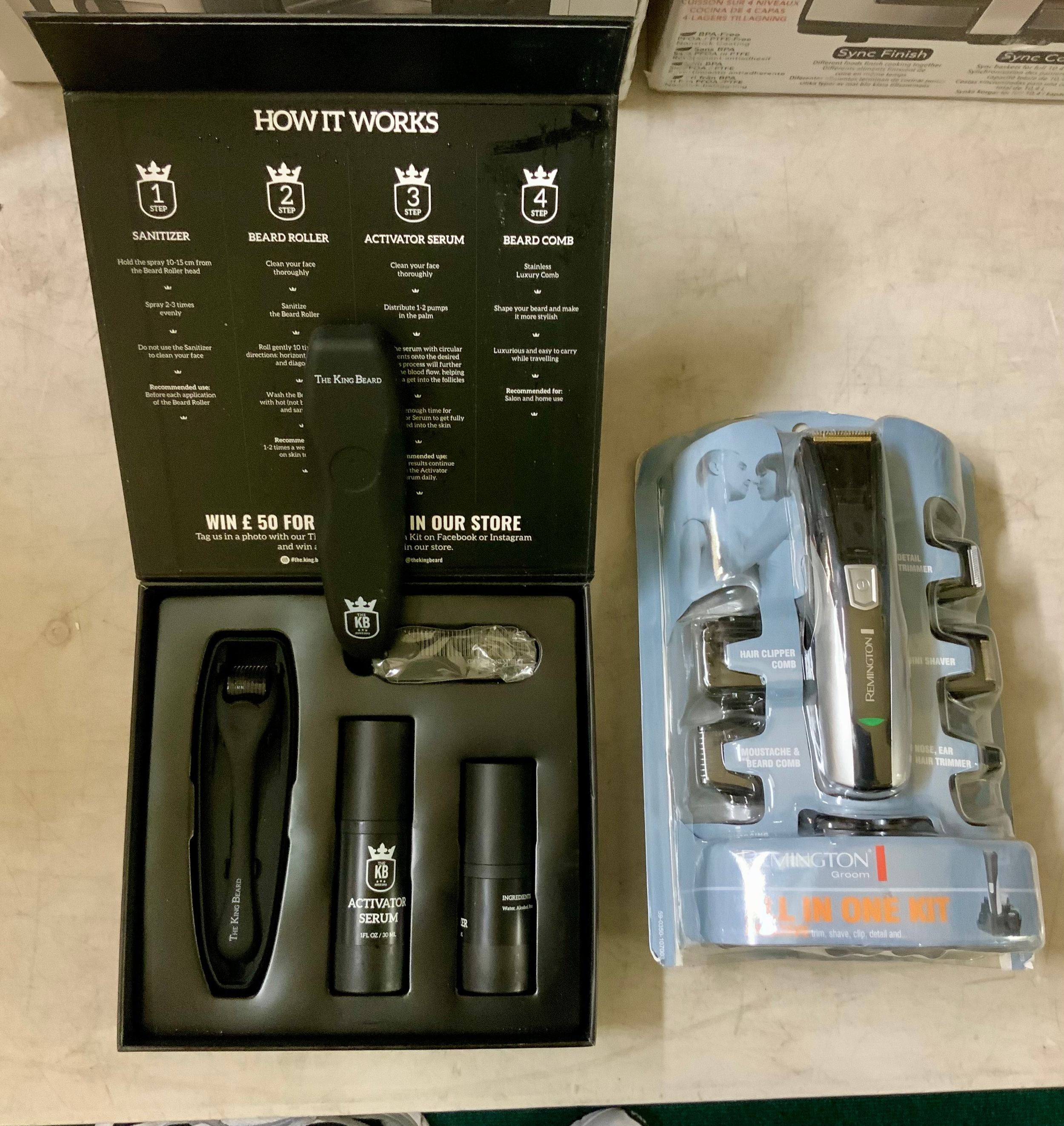 BOXED REMINGTON GROOM ALL IN ONE KIT CREATIVE SHAVER WITH HAIR CLIPPER COMB, MOUSTACHE AND BEARD COMB, DETAIL TRIMMER, MINI SHAVER AND NOSE AND EAR TRIMMER TOGETHER WITH A BOXED THE KING BEARD GROWTH KIT