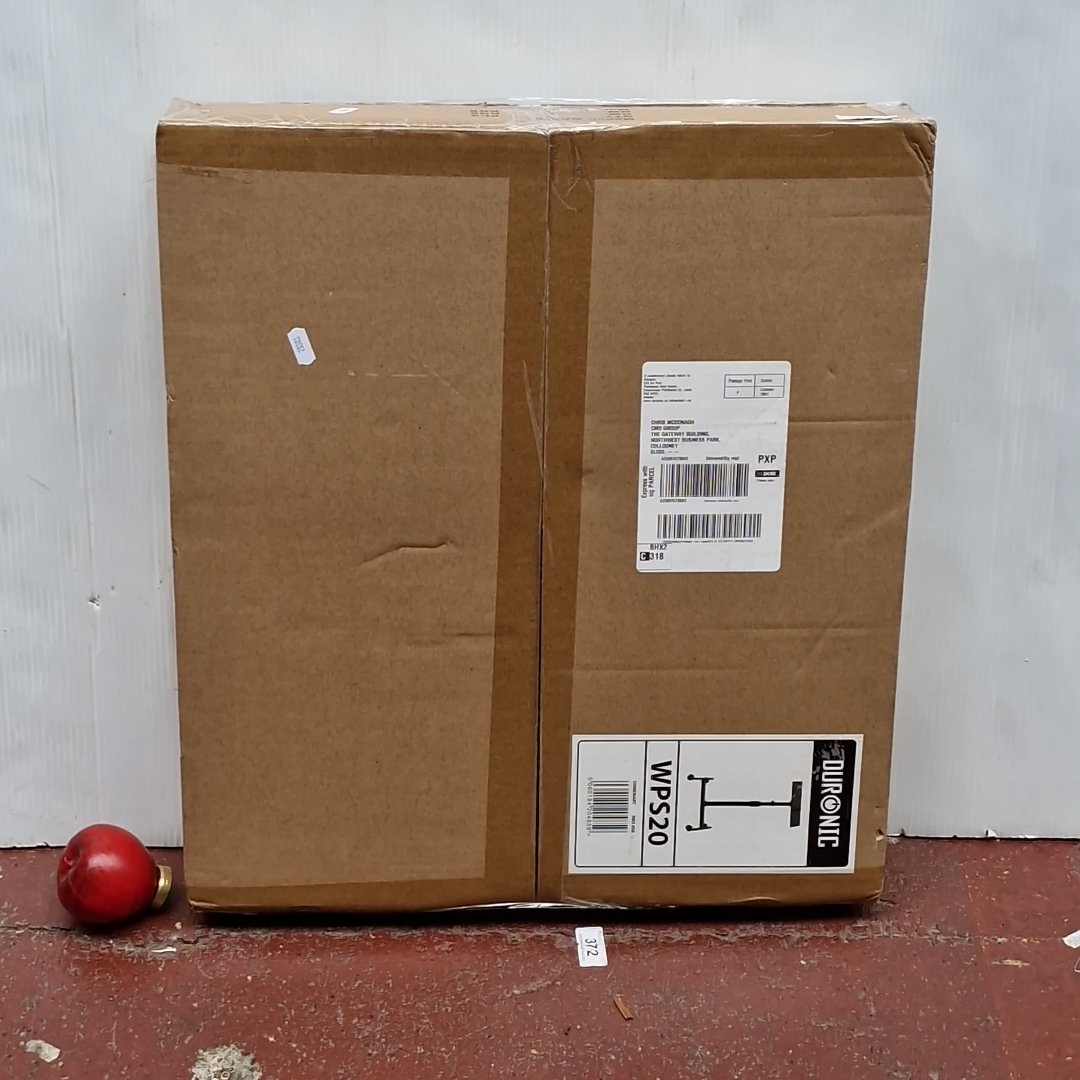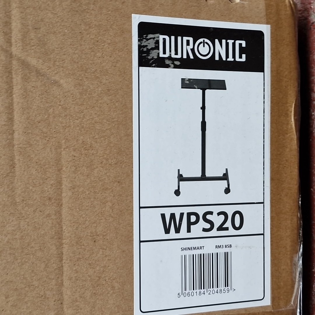 A boxed Duronic model WPS20 height-adjustable rolling stand, with four castors and a rectangular platform, as supplied.