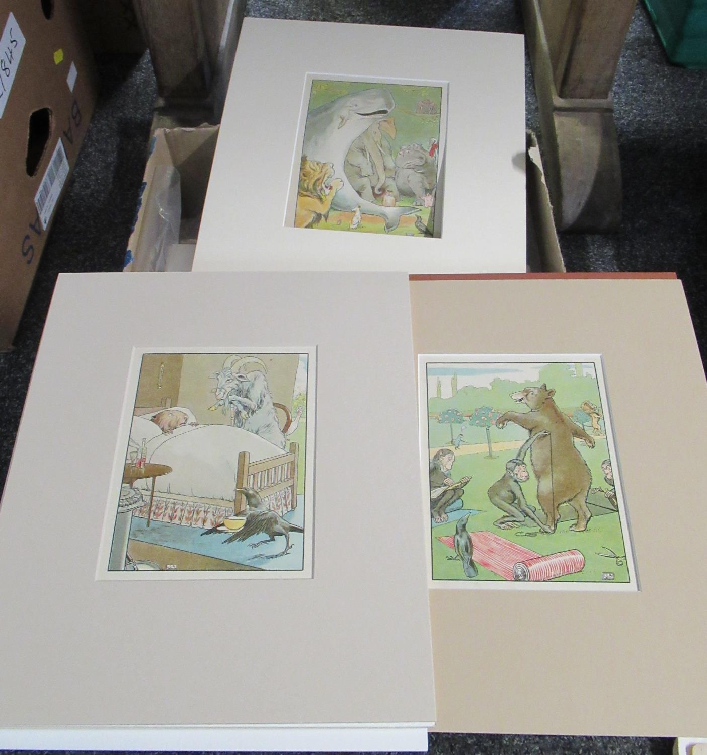 Box of assorted book illustrations, prints etc. to include bird illustrations, L'ornement polychrome illustrations, Arthur Rackham prints etc.