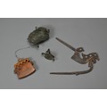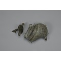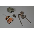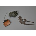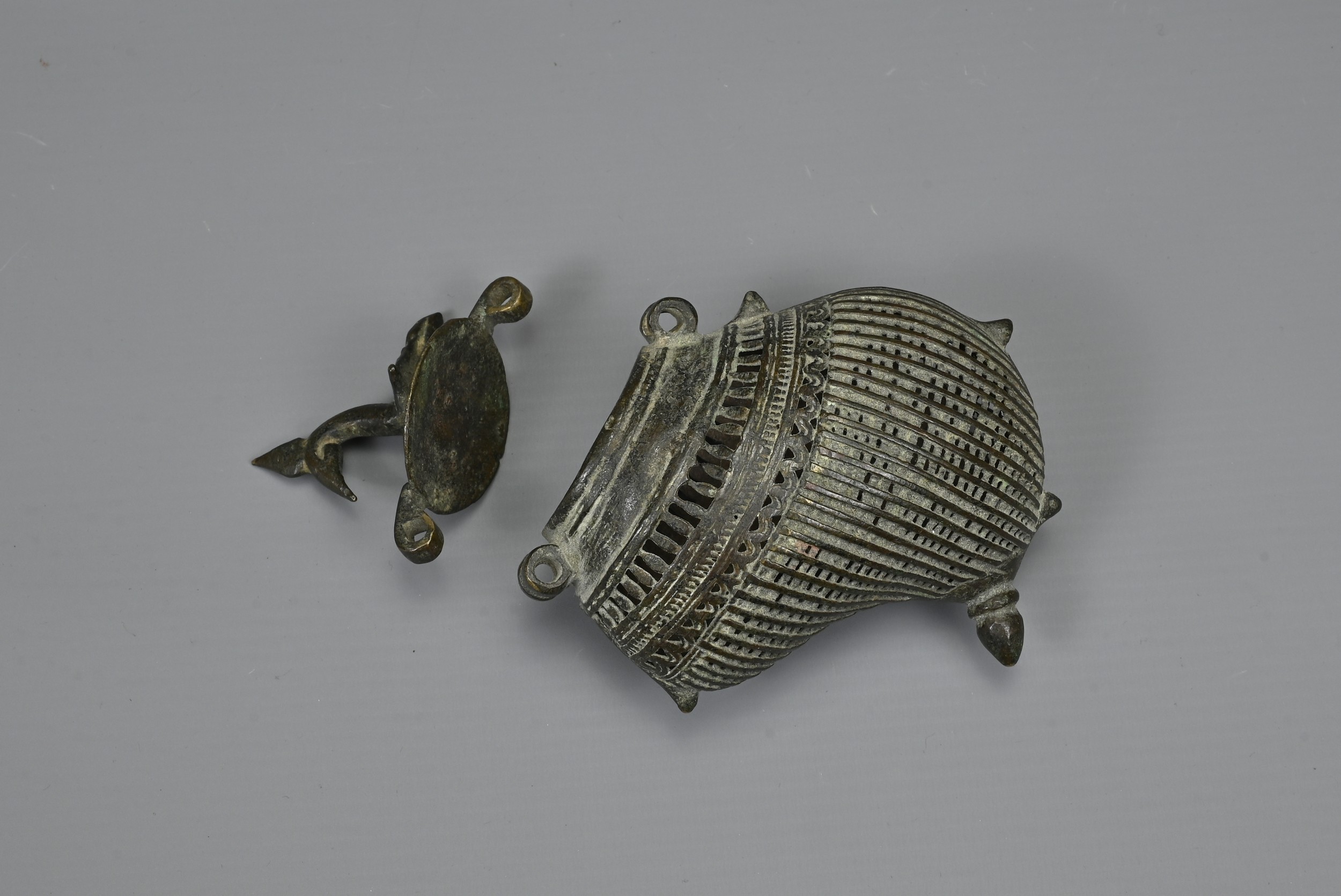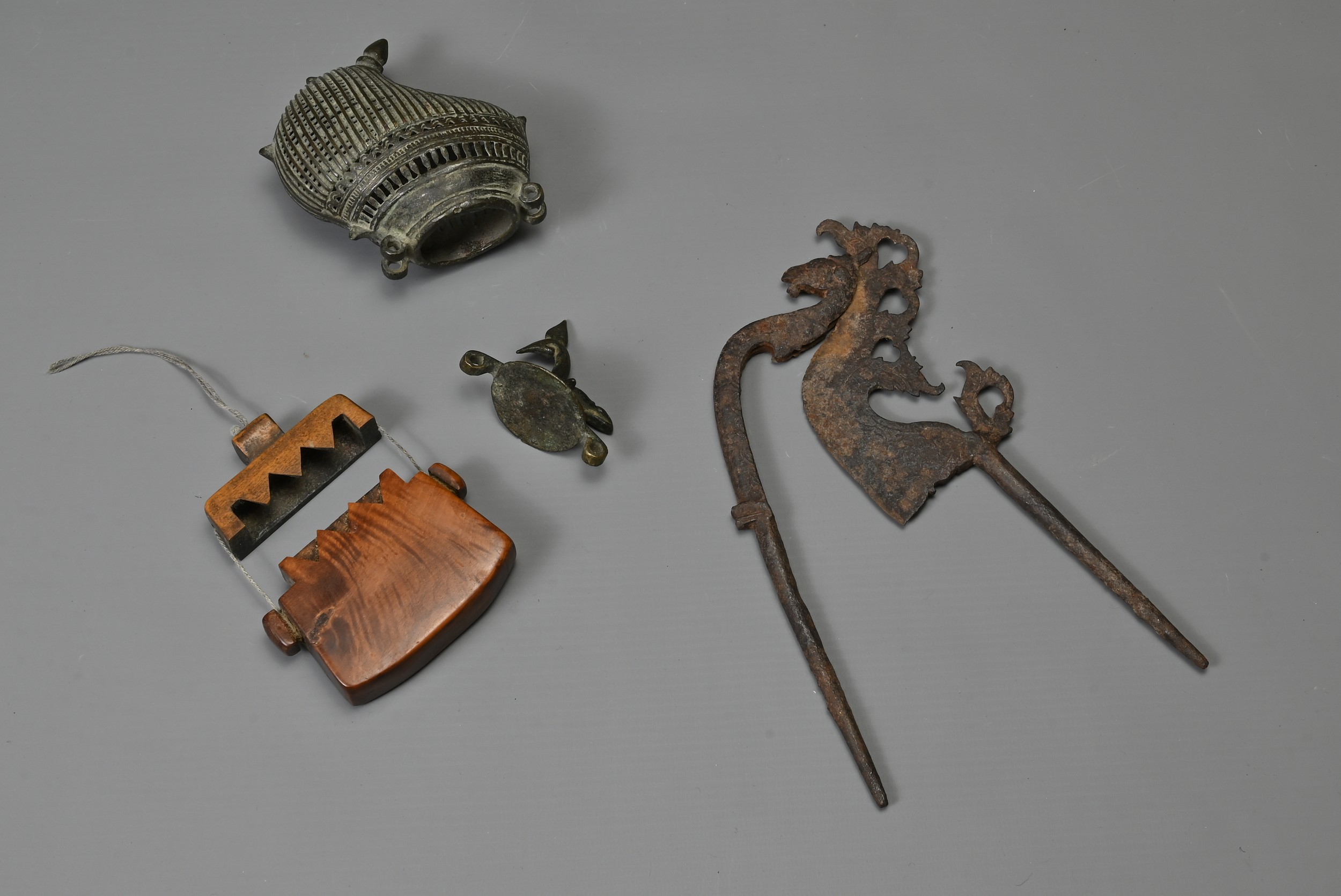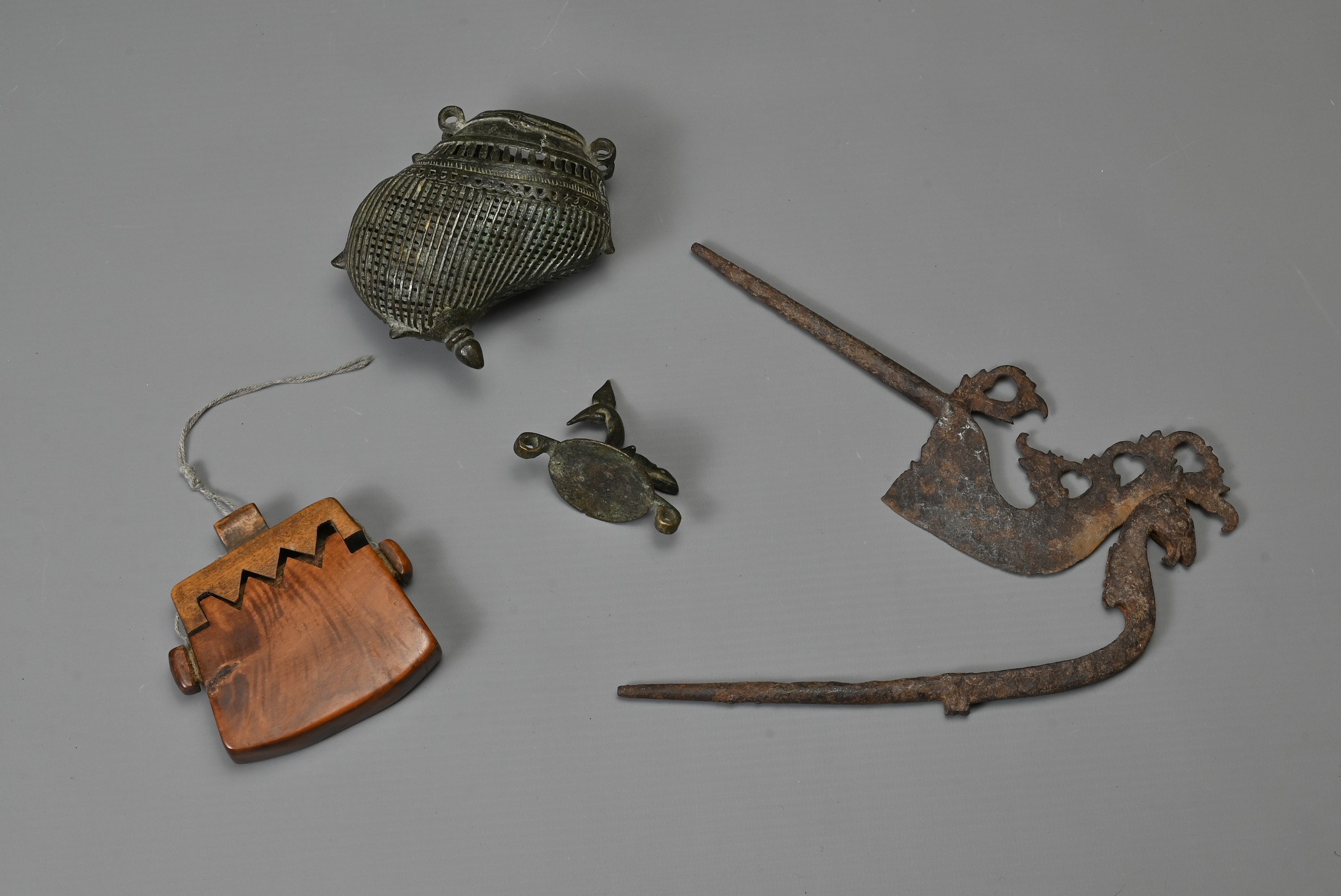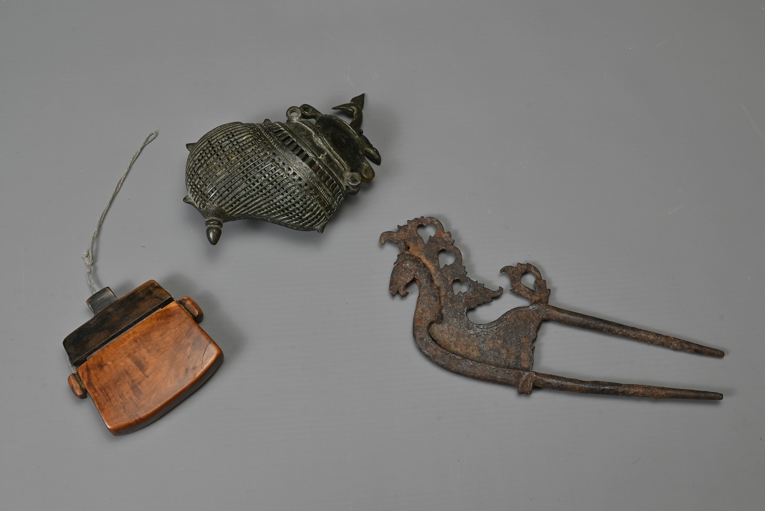 A GROUP OF INDIAN INDONESIAN ITEMS, 20TH CENTURY. To include an Indian bronze pierced box and cover with hinged bird cover, possibly for incense; An Indonesian Sumba carved wood box with cover; Together with a metal betel nut cutter, probably Indonesian. Betel nut cutter 20cm length.