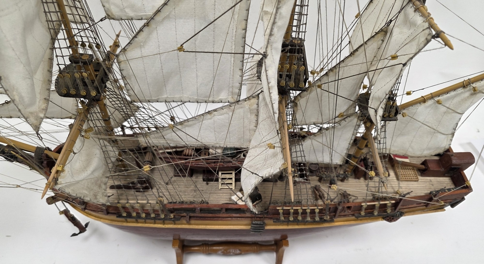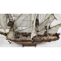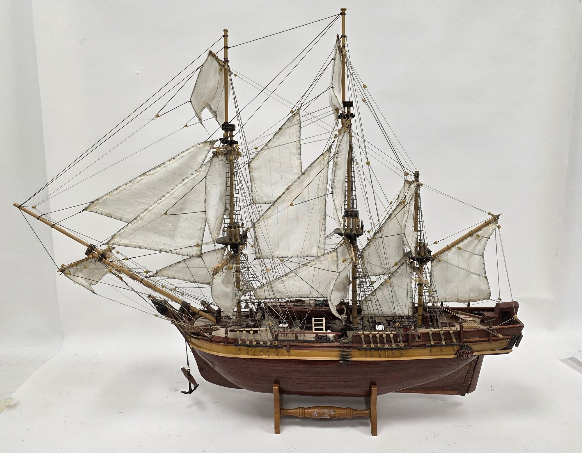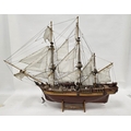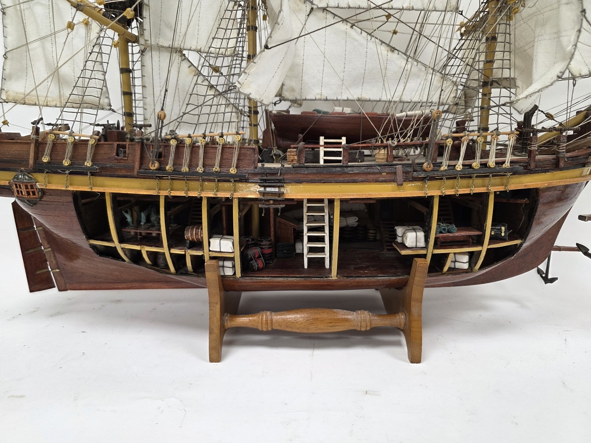 Wooden kit-built model of HMS Bounty, one side of the hull open revealing the inner decks with barrels and other cargo, on stand, 93cm long
