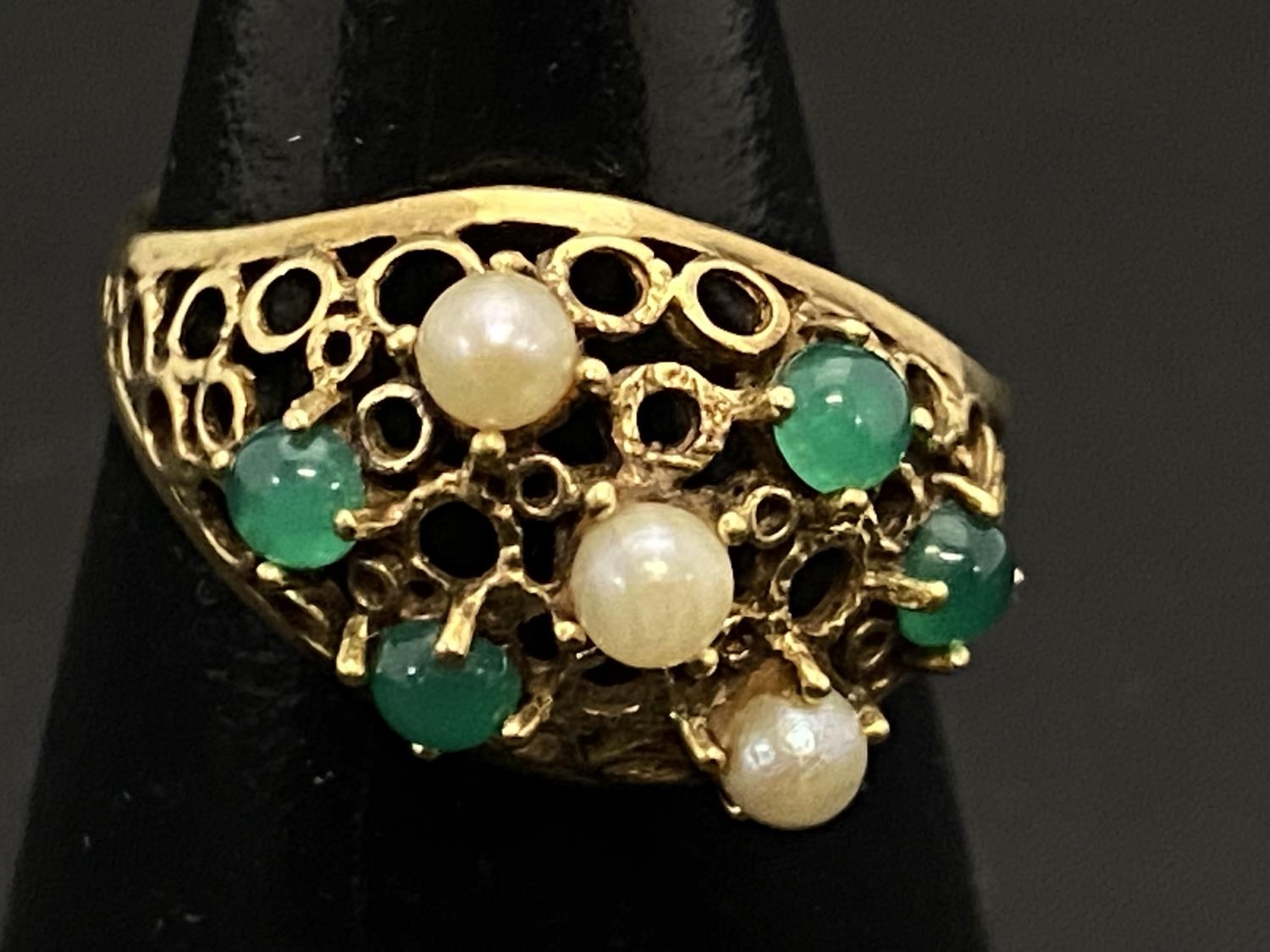 A vintage 14ct gold ring with green stones and pearl decoration 2.71g