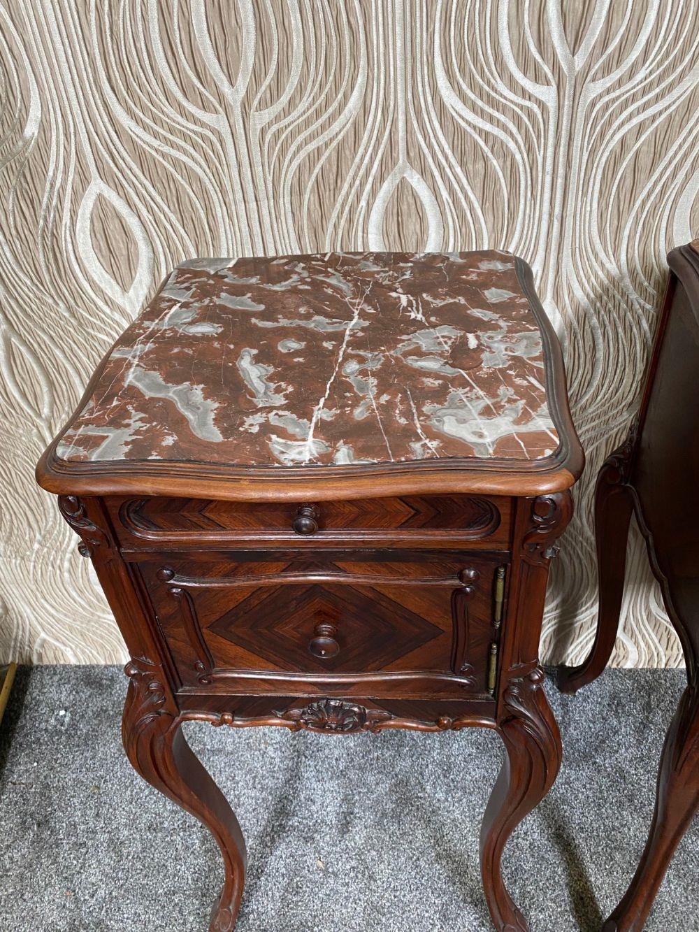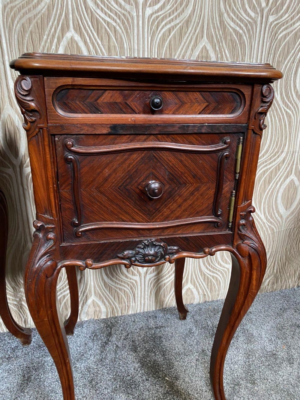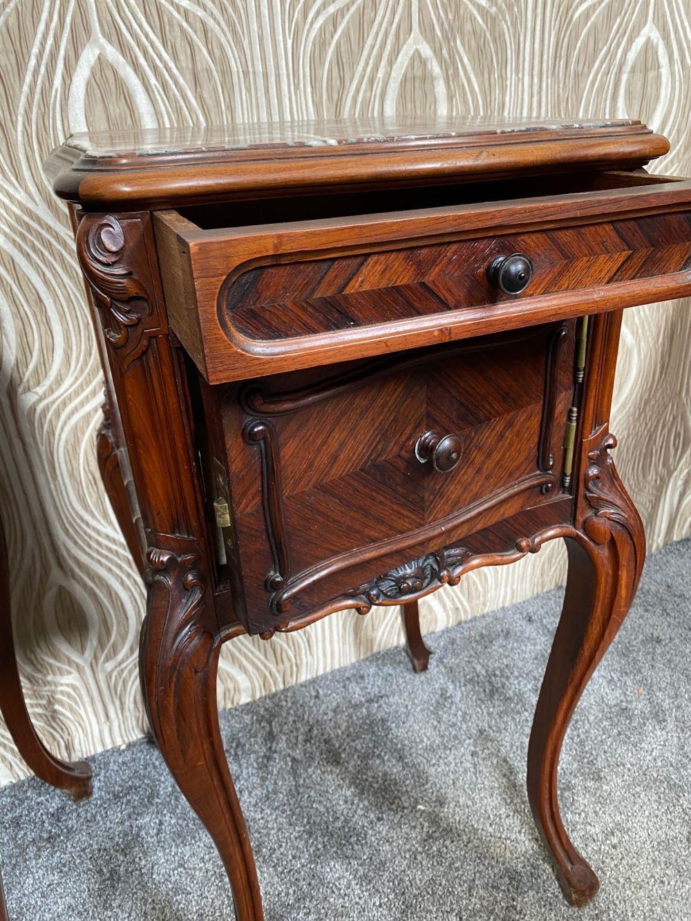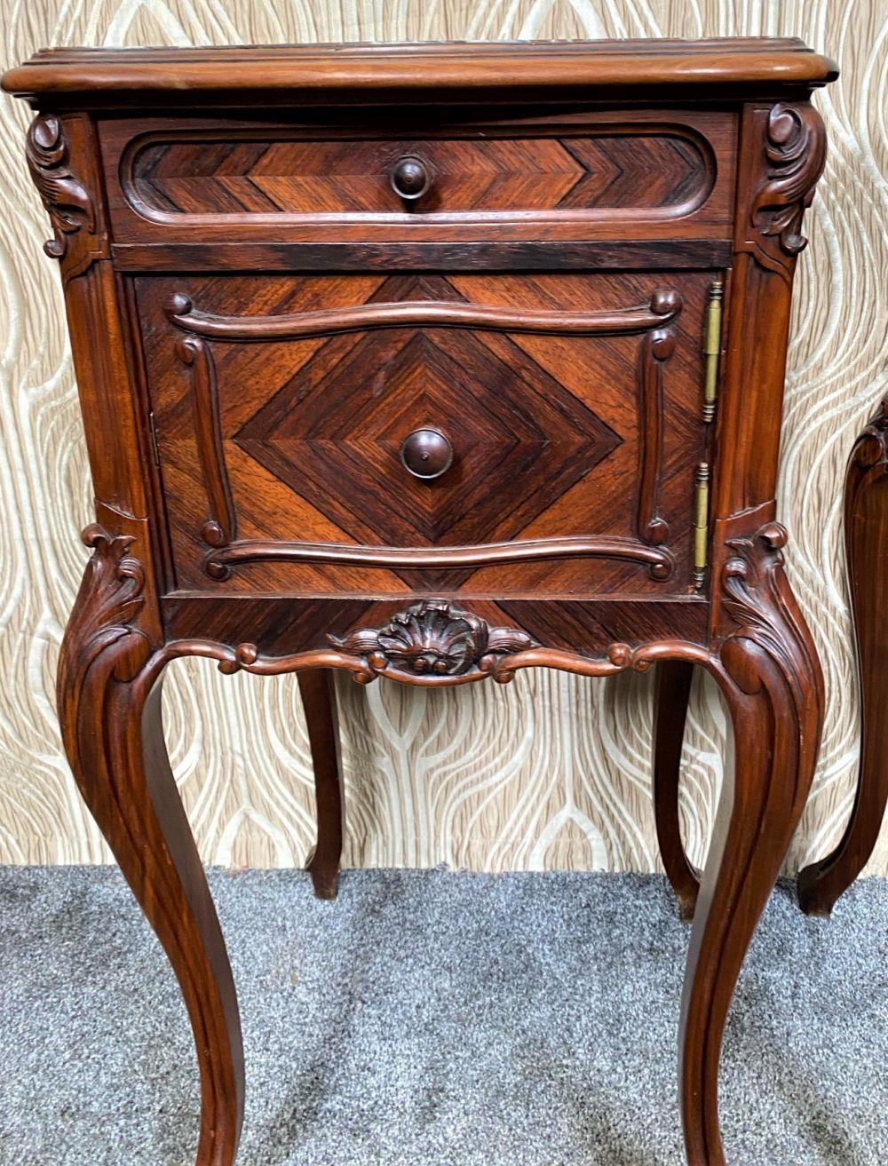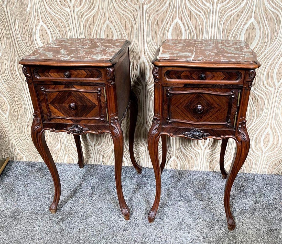 A FINE PAIR OF ROSEWOOD MARBLE TOPPED CABINETS / LAMP TABLES, each with a single drawer to the top, and a single cabinet door beneath. With scrolling moulded detail and book matched veneers in contrasting dark/light grains. The corners, skirt and legs decorated with lovely scrolling foliage & shell details, with further raised scroll moulding trip. Resting on cabriole shaped legs. A lovely pair, with lots of storage, nice size and would work in any room. Dimensions: 82 x 41 x 41cm (H X W x D).