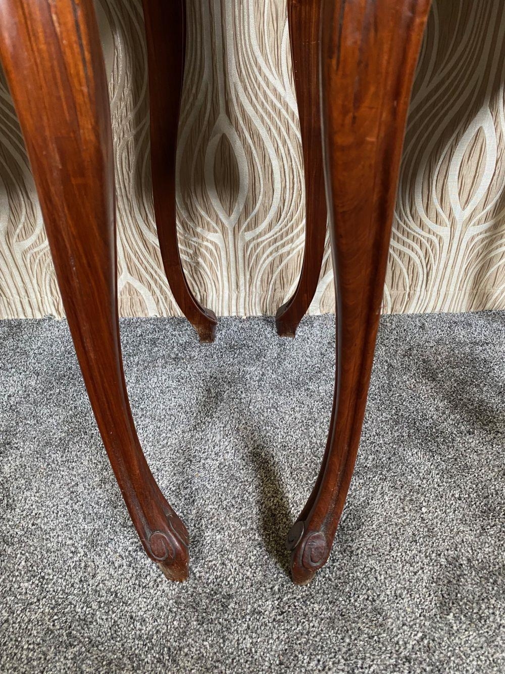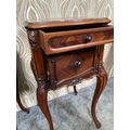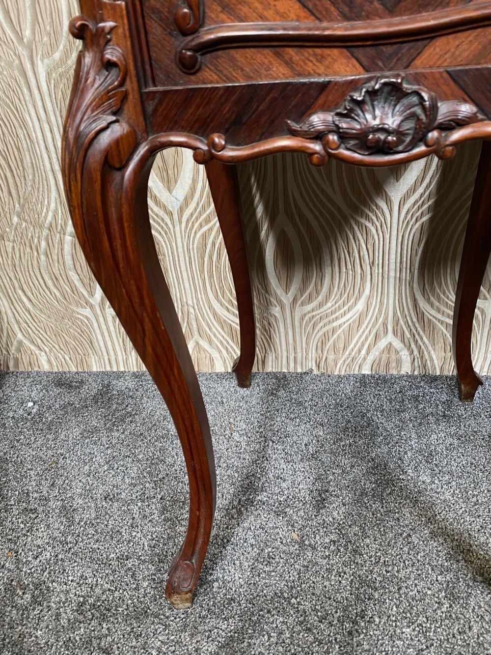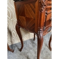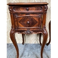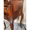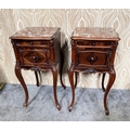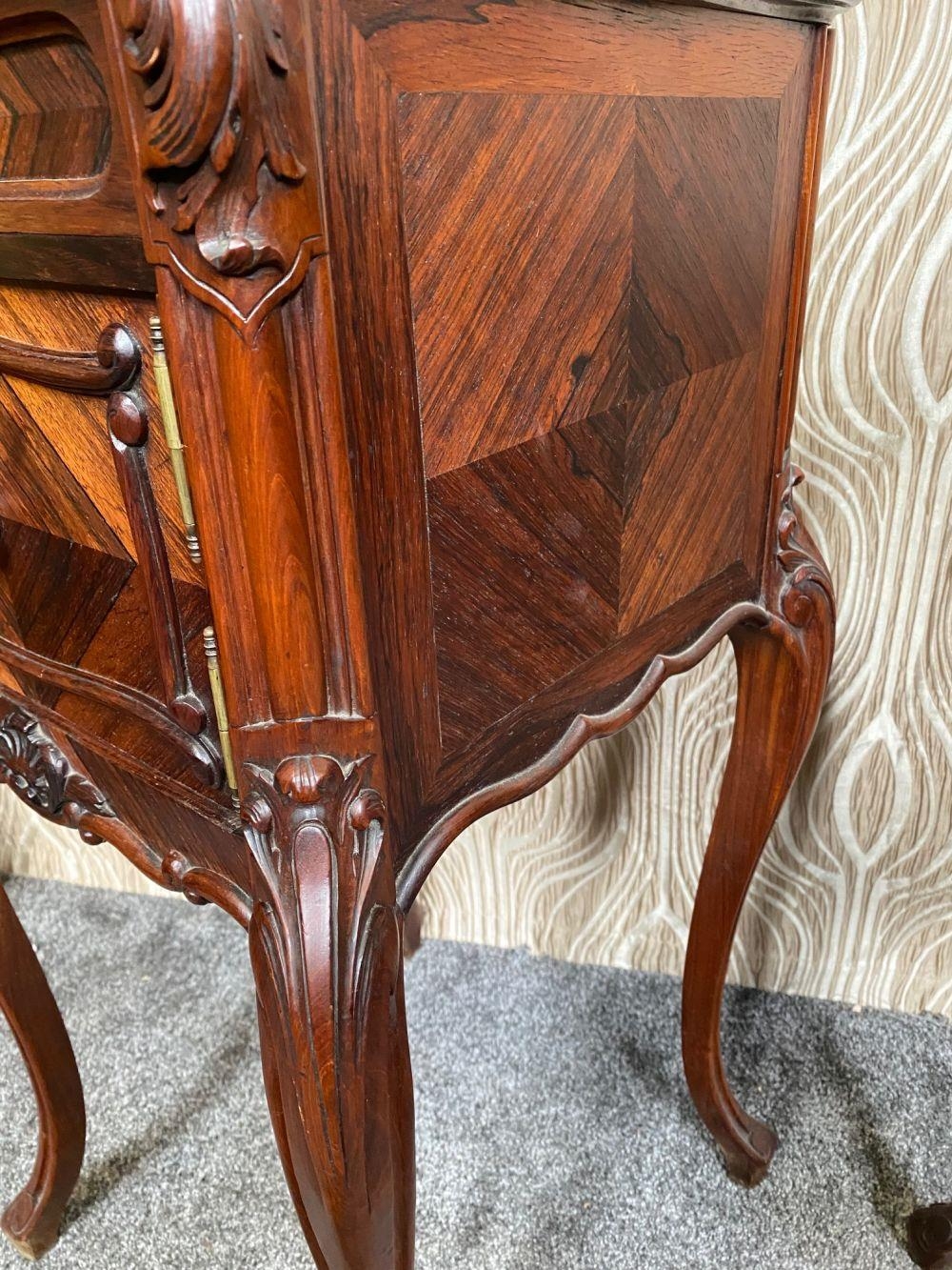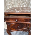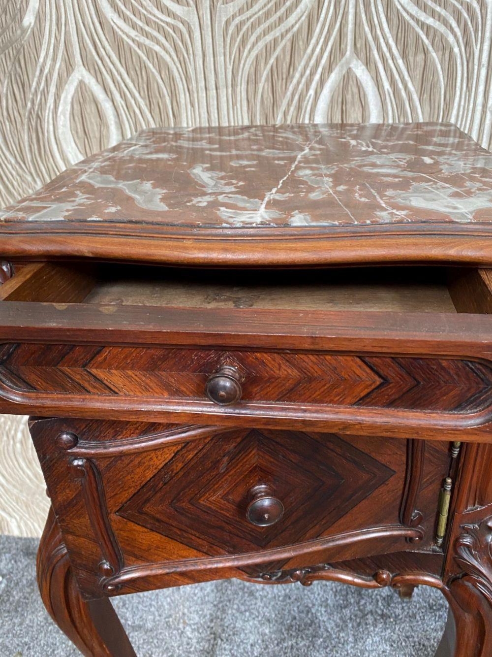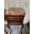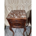 A FINE PAIR OF ROSEWOOD MARBLE TOPPED CABINETS / LAMP TABLES, each with a single drawer to the top, and a single cabinet door beneath. With scrolling moulded detail and book matched veneers in contrasting dark/light grains. The corners, skirt and legs decorated with lovely scrolling foliage & shell details, with further raised scroll moulding trip. Resting on cabriole shaped legs. A lovely pair, with lots of storage, nice size and would work in any room. Dimensions: 82 x 41 x 41cm (H X W x D).