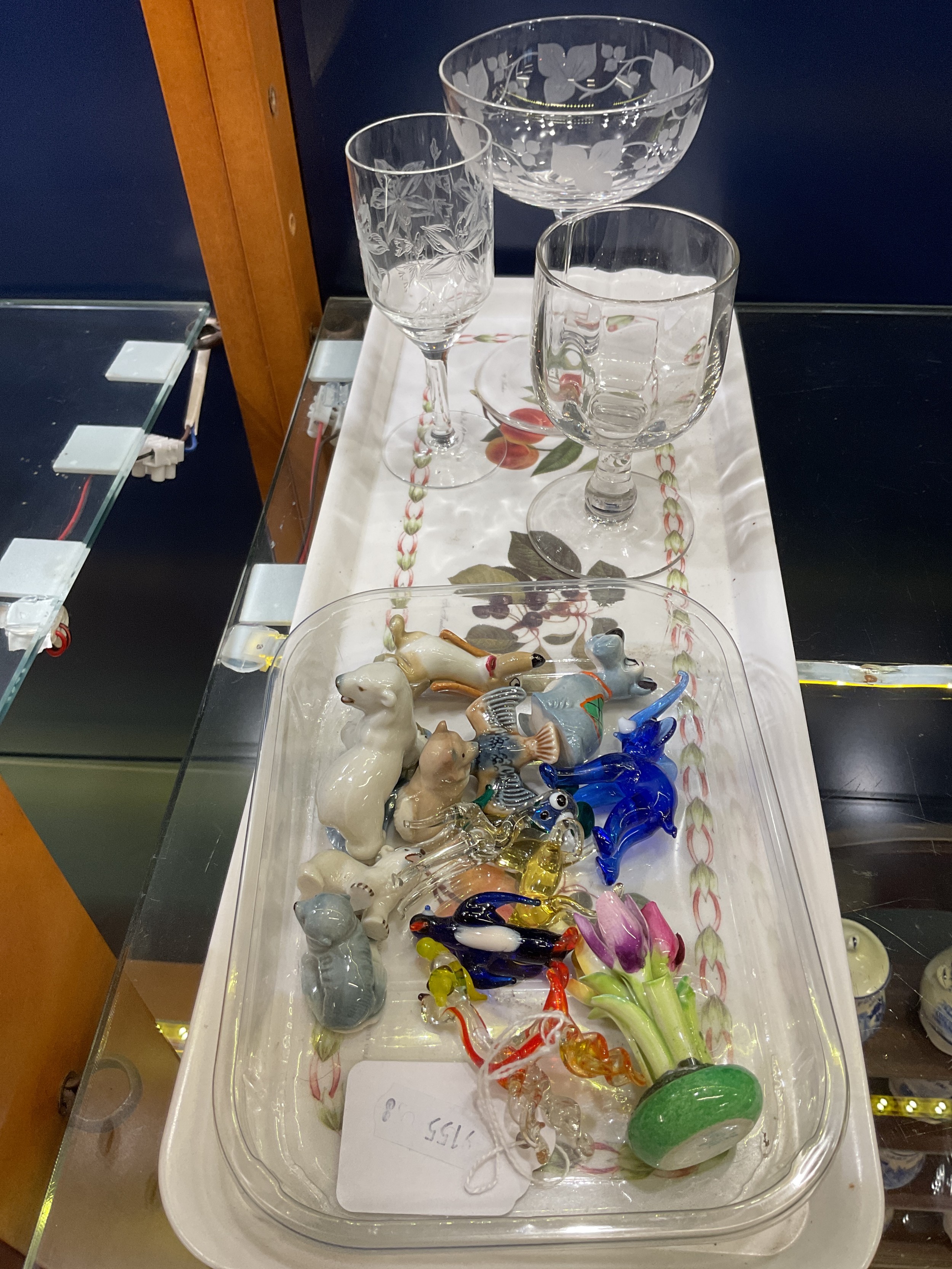 A small quantity of whimsies, glass ornaments and three antique wine glasses
