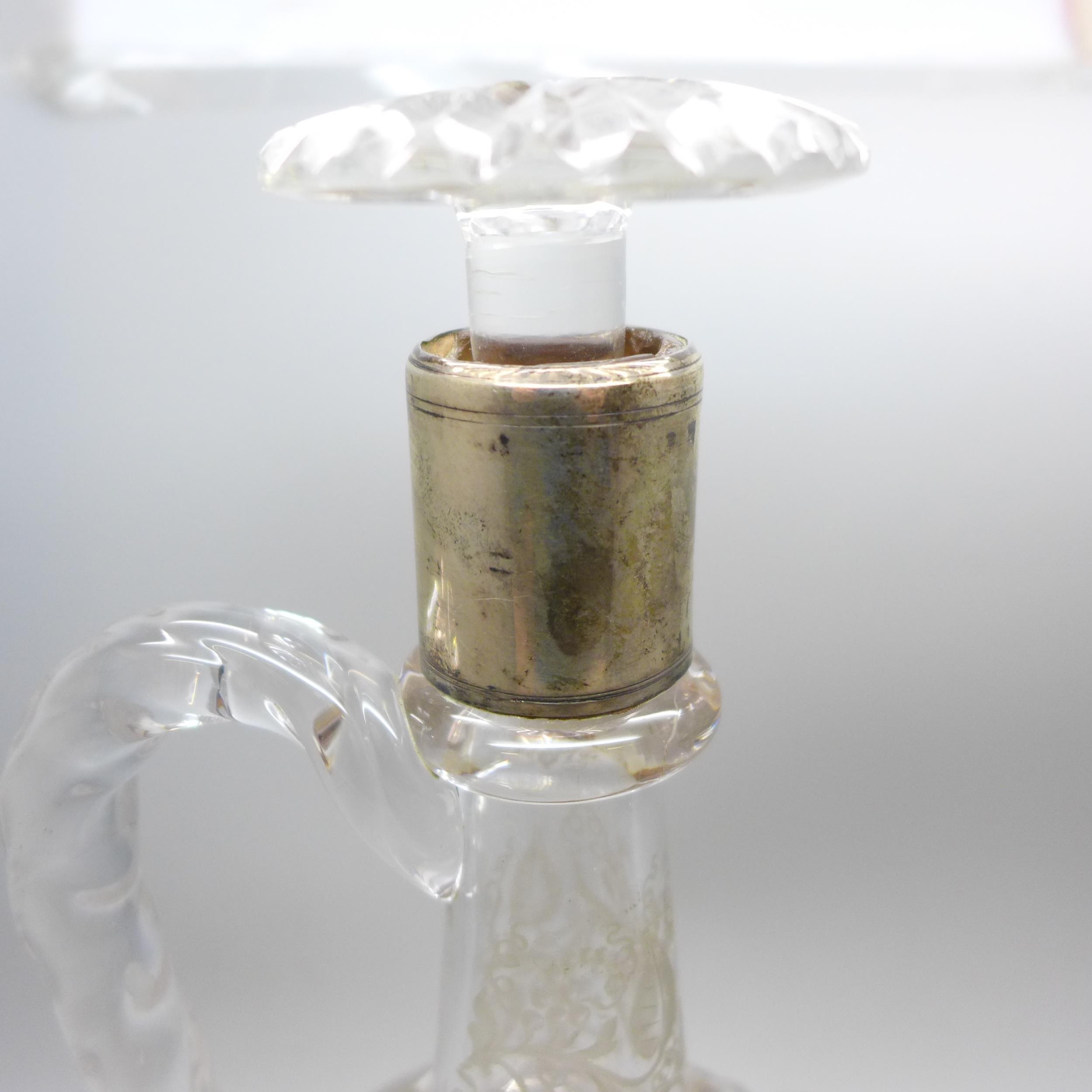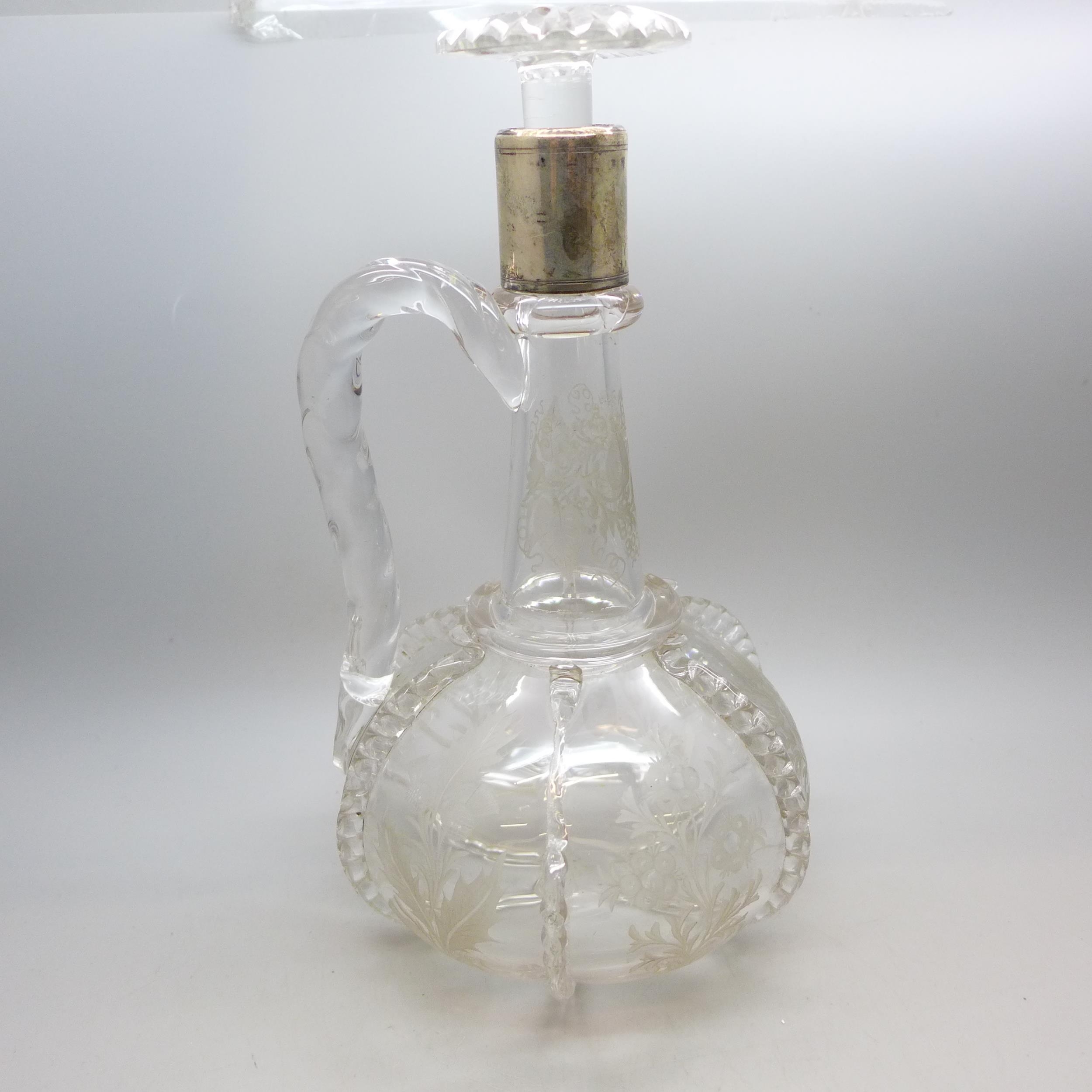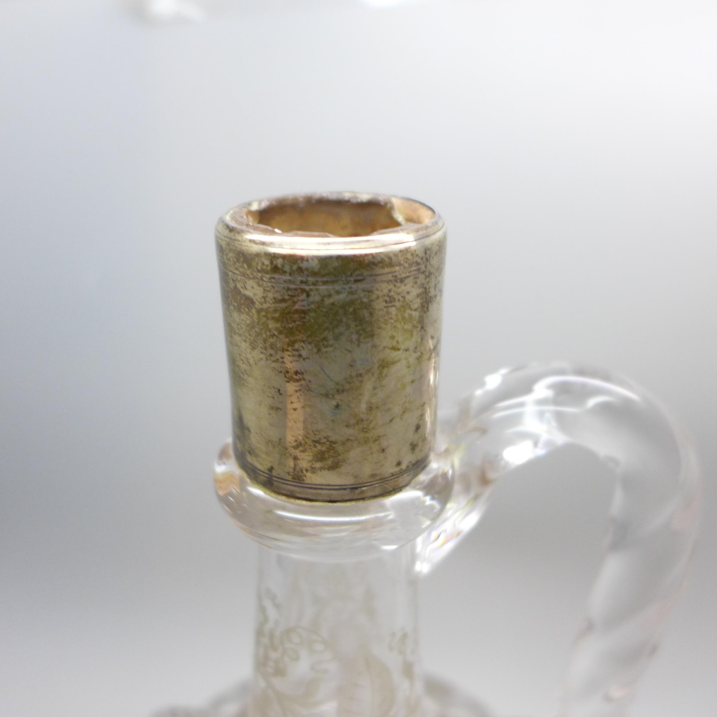An etched glass decanter with white metal collar, a/f, 24cm tall
