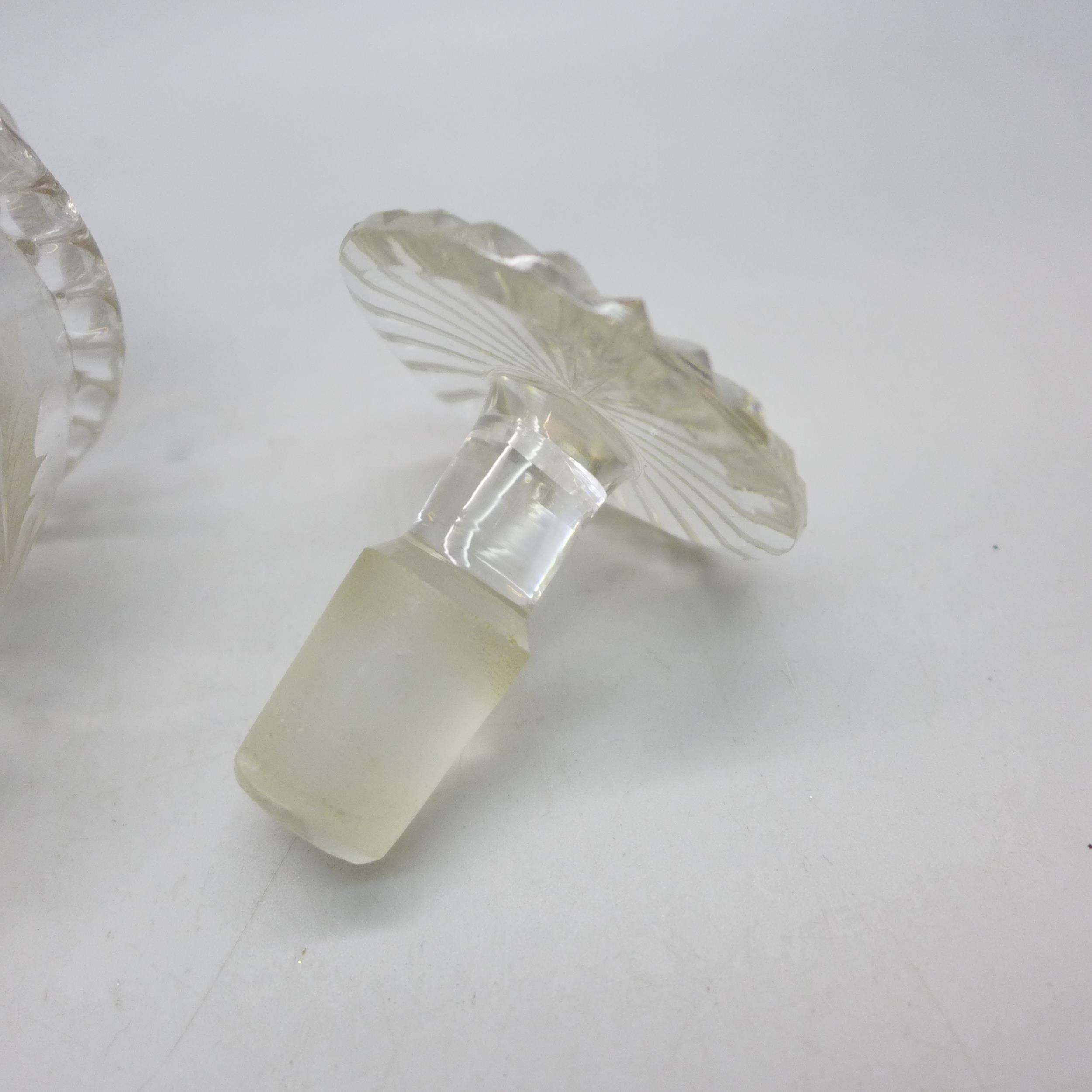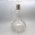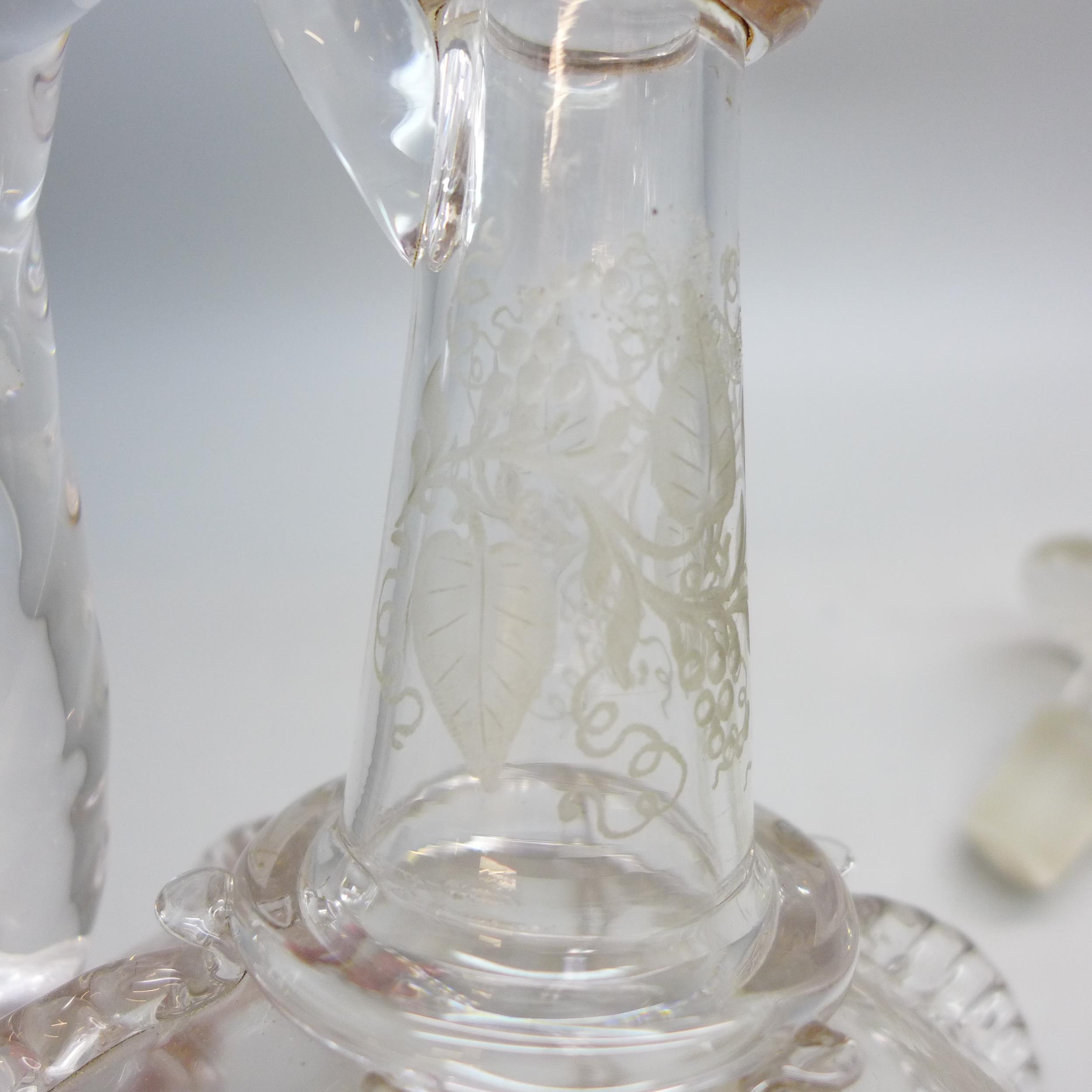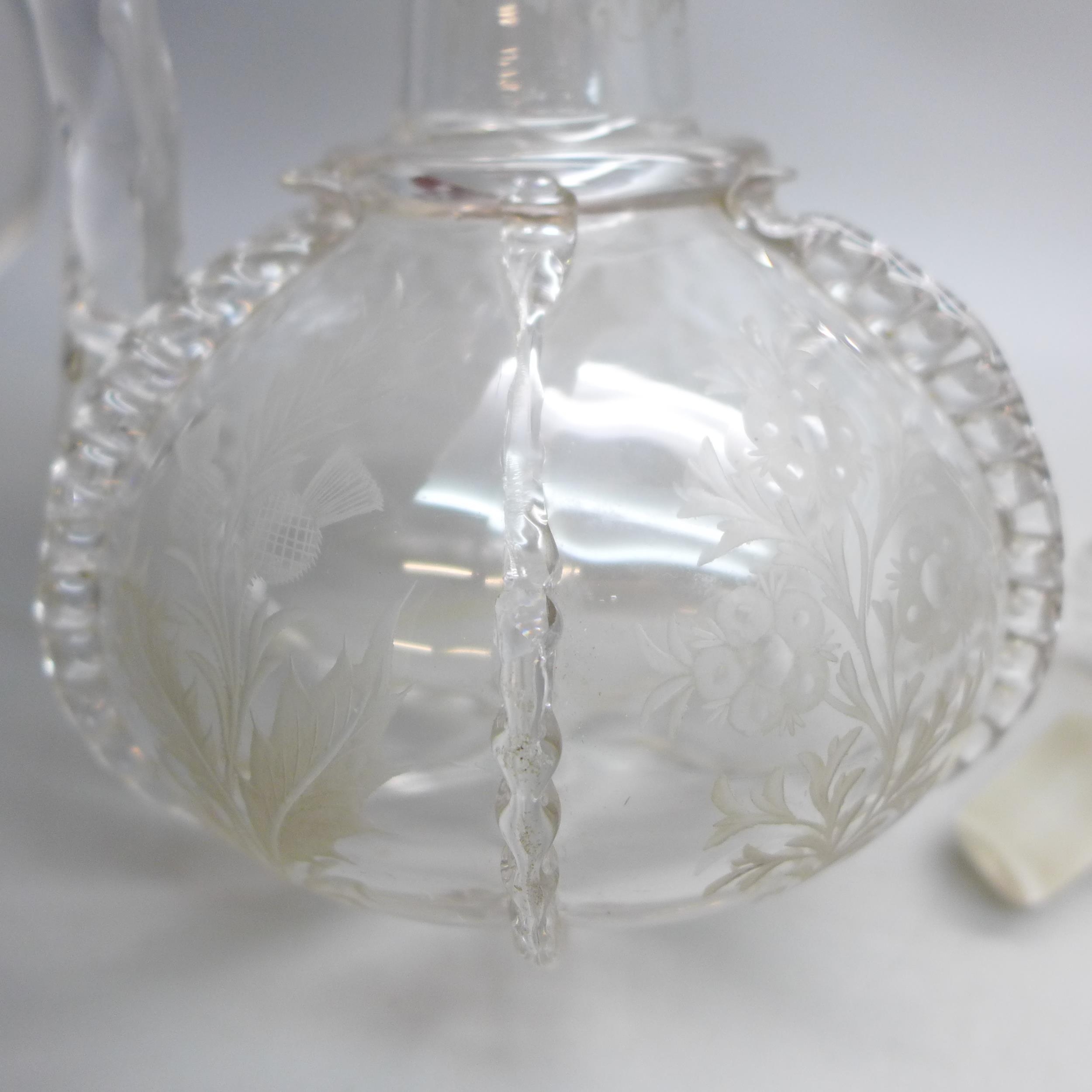 An etched glass decanter with white metal collar, a/f, 24cm tall