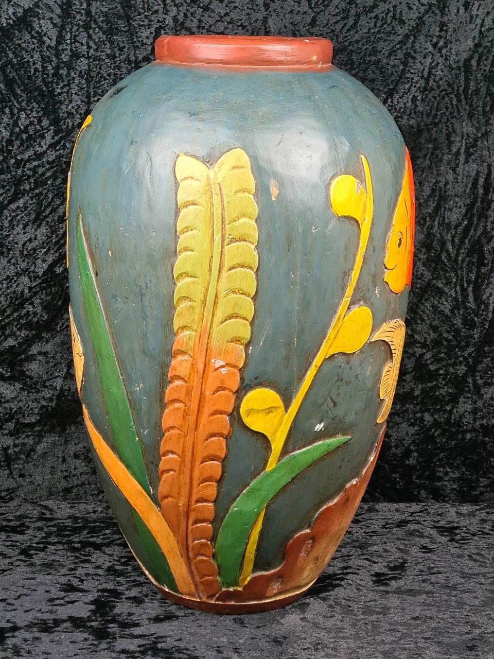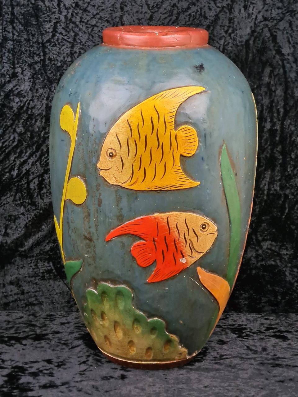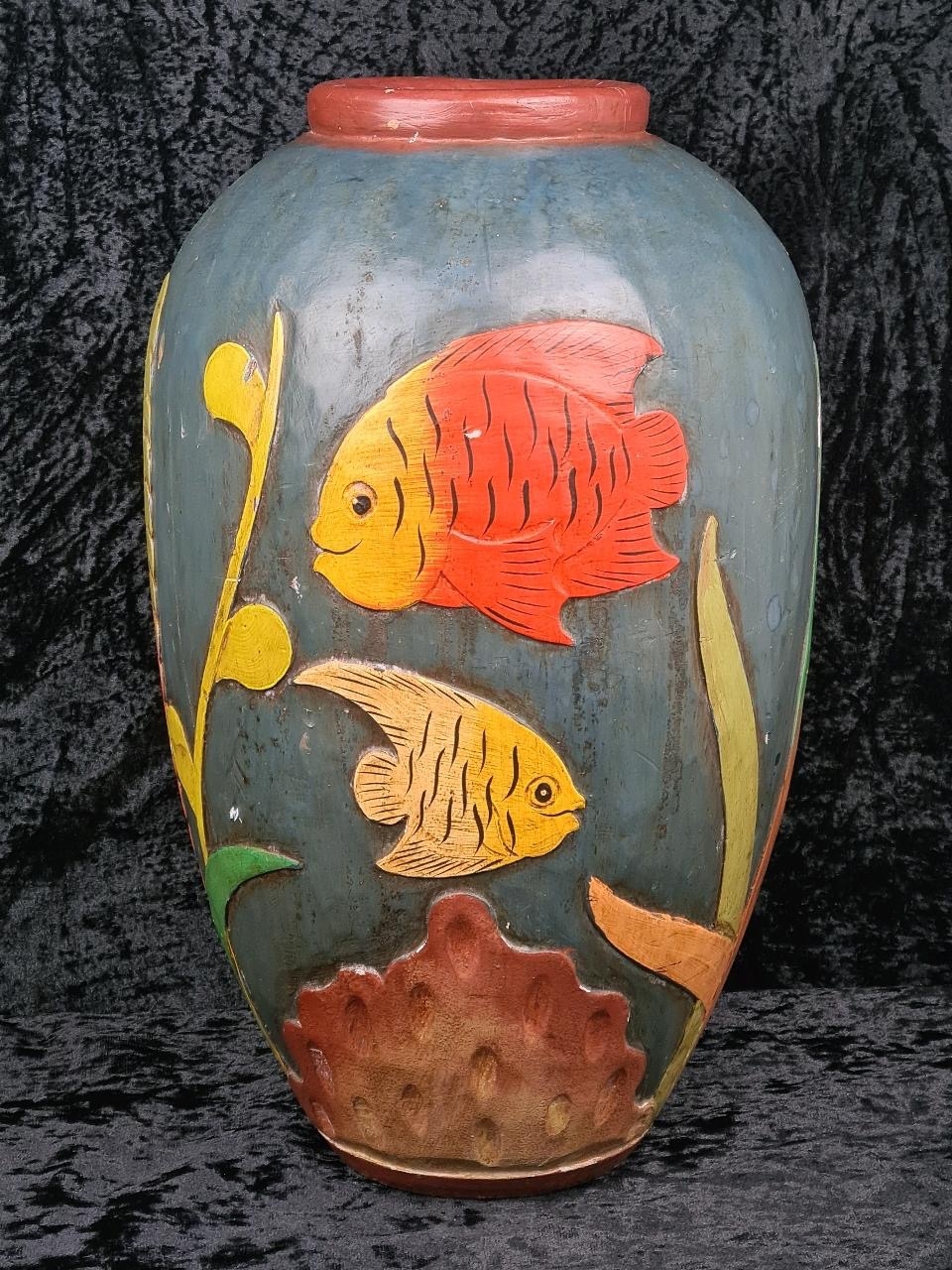 Fabulous large decorative vase made from wood and handprinted with tropical fish. Most likely Central American folk art. Approx H48cm.
