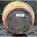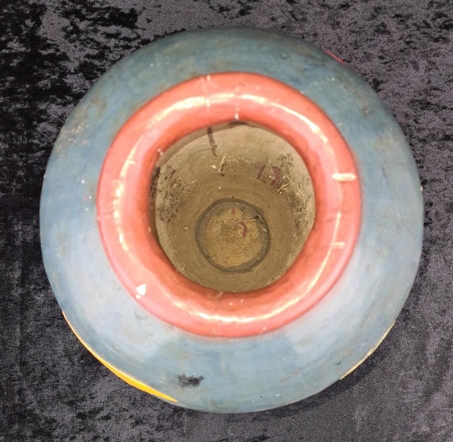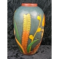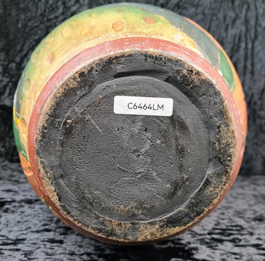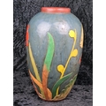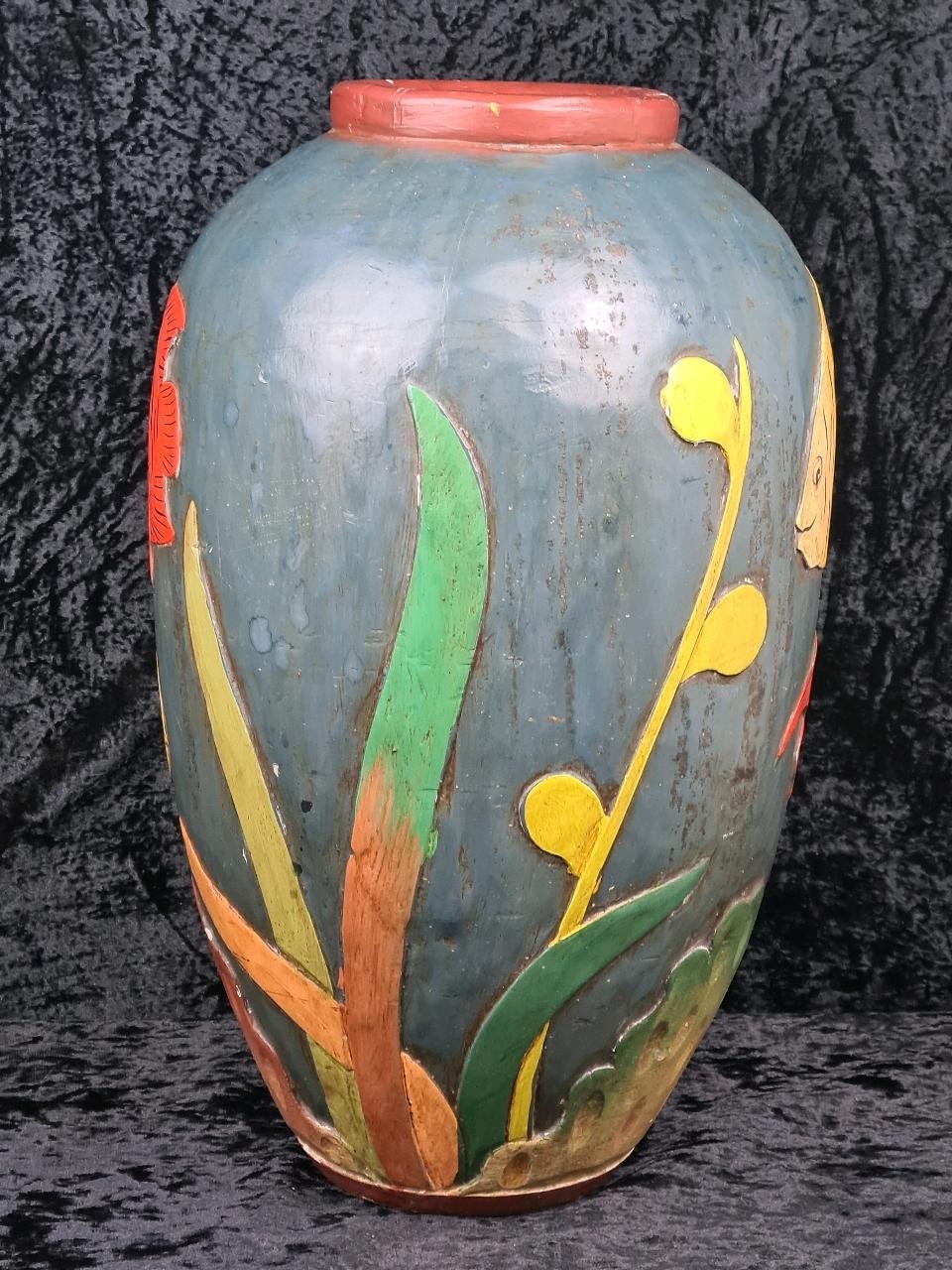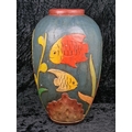 Fabulous large decorative vase made from wood and handprinted with tropical fish. Most likely Central American folk art. Approx H48cm.