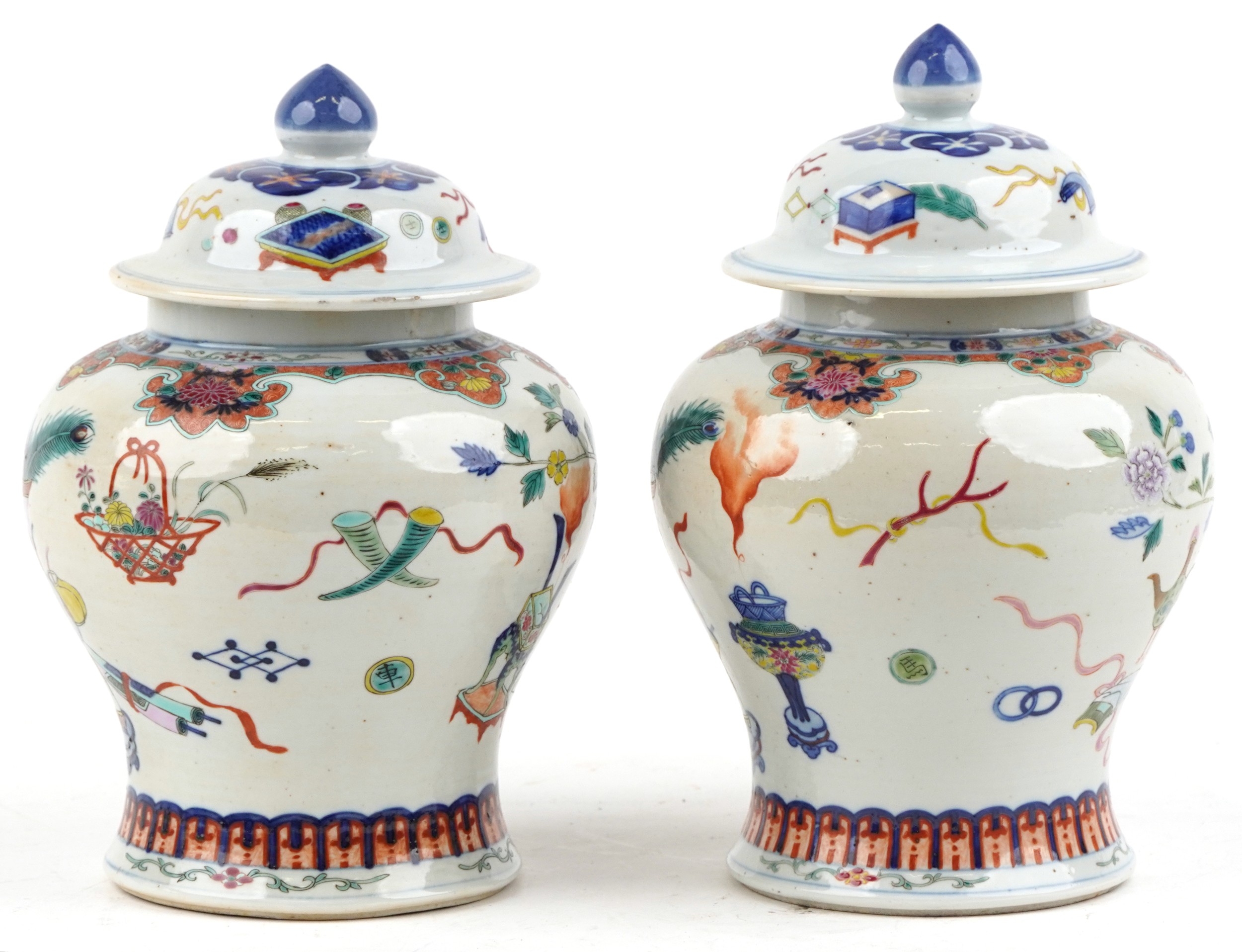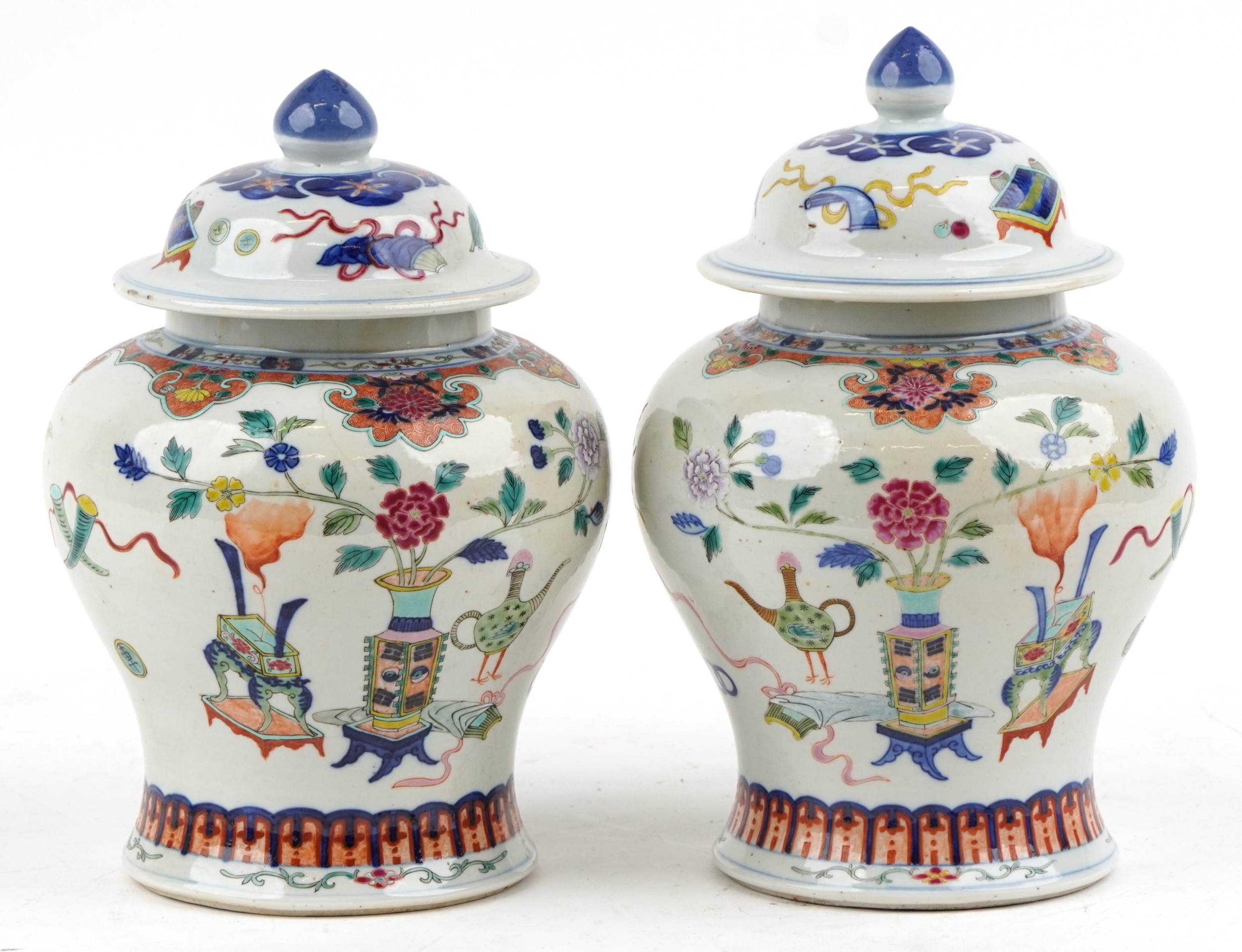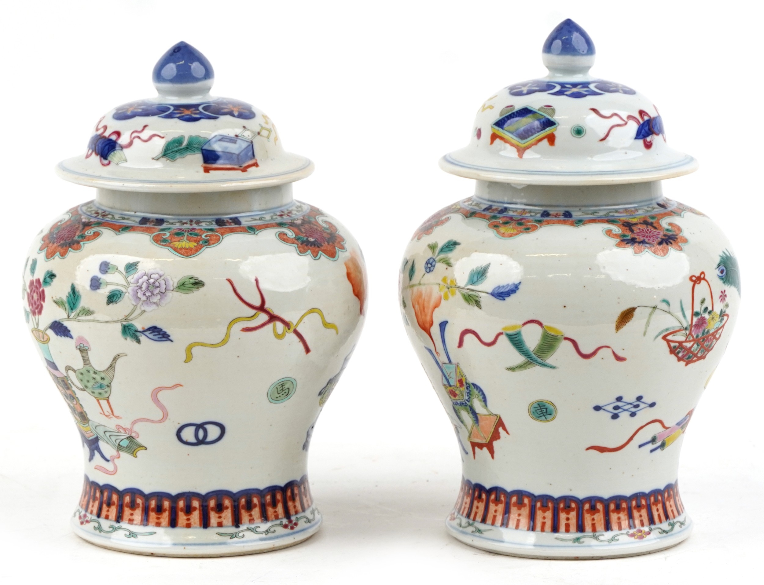 A near pair Chinese porcelain baluster vases and covers, each hand painted with objects amongst a floral border, character marks to the base, the largest 30cm high.