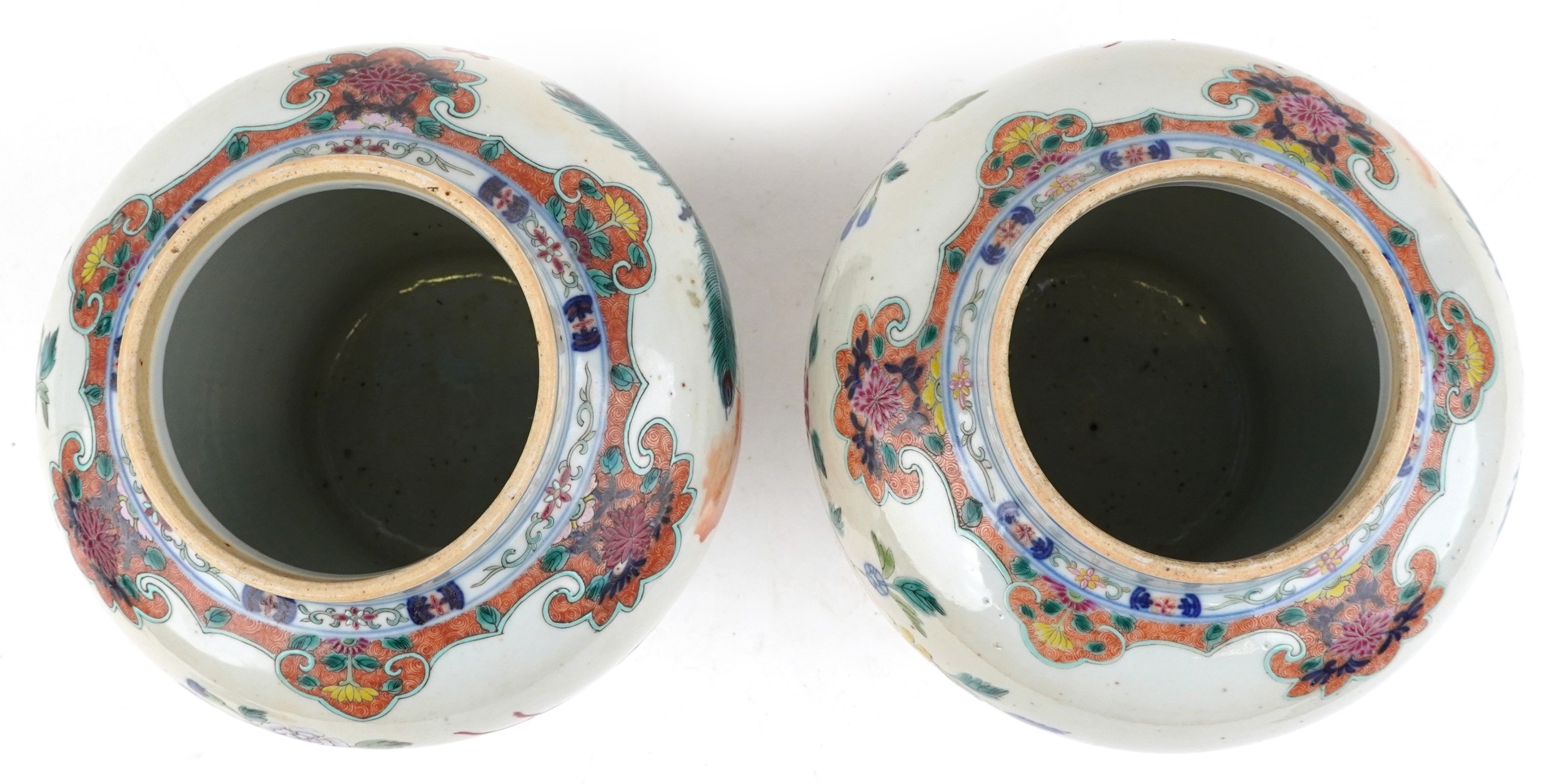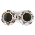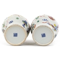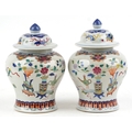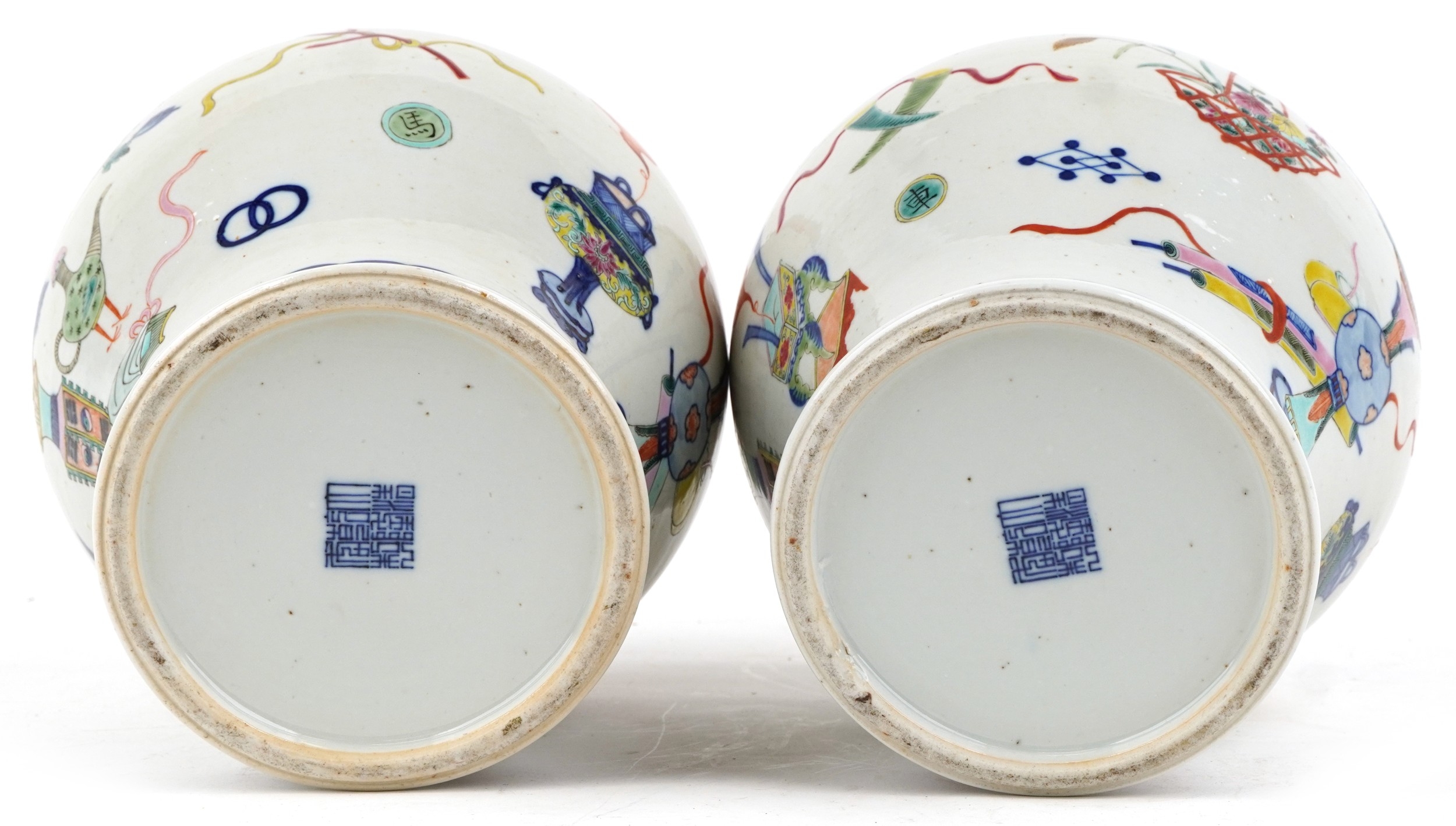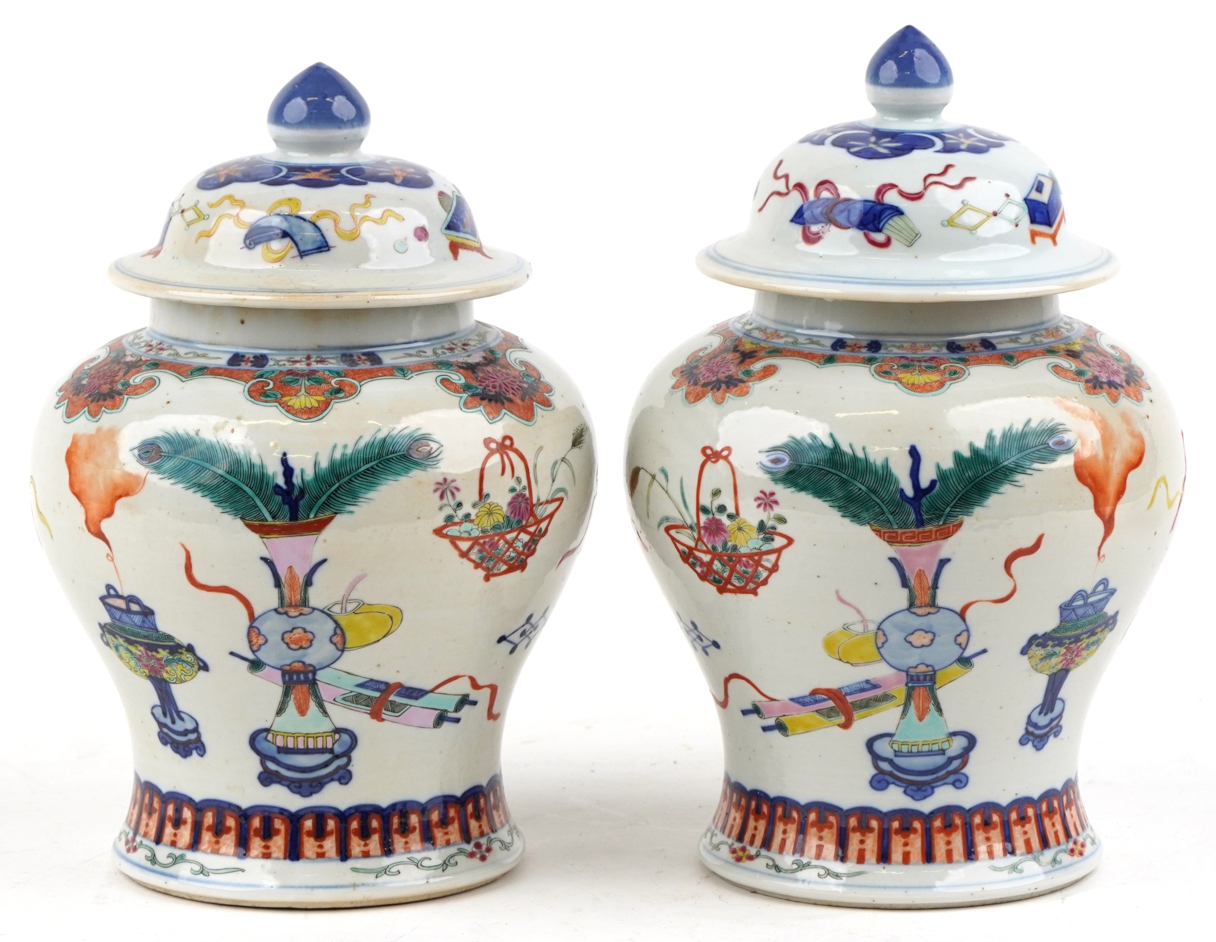 A near pair Chinese porcelain baluster vases and covers, each hand painted with objects amongst a floral border, character marks to the base, the largest 30cm high.